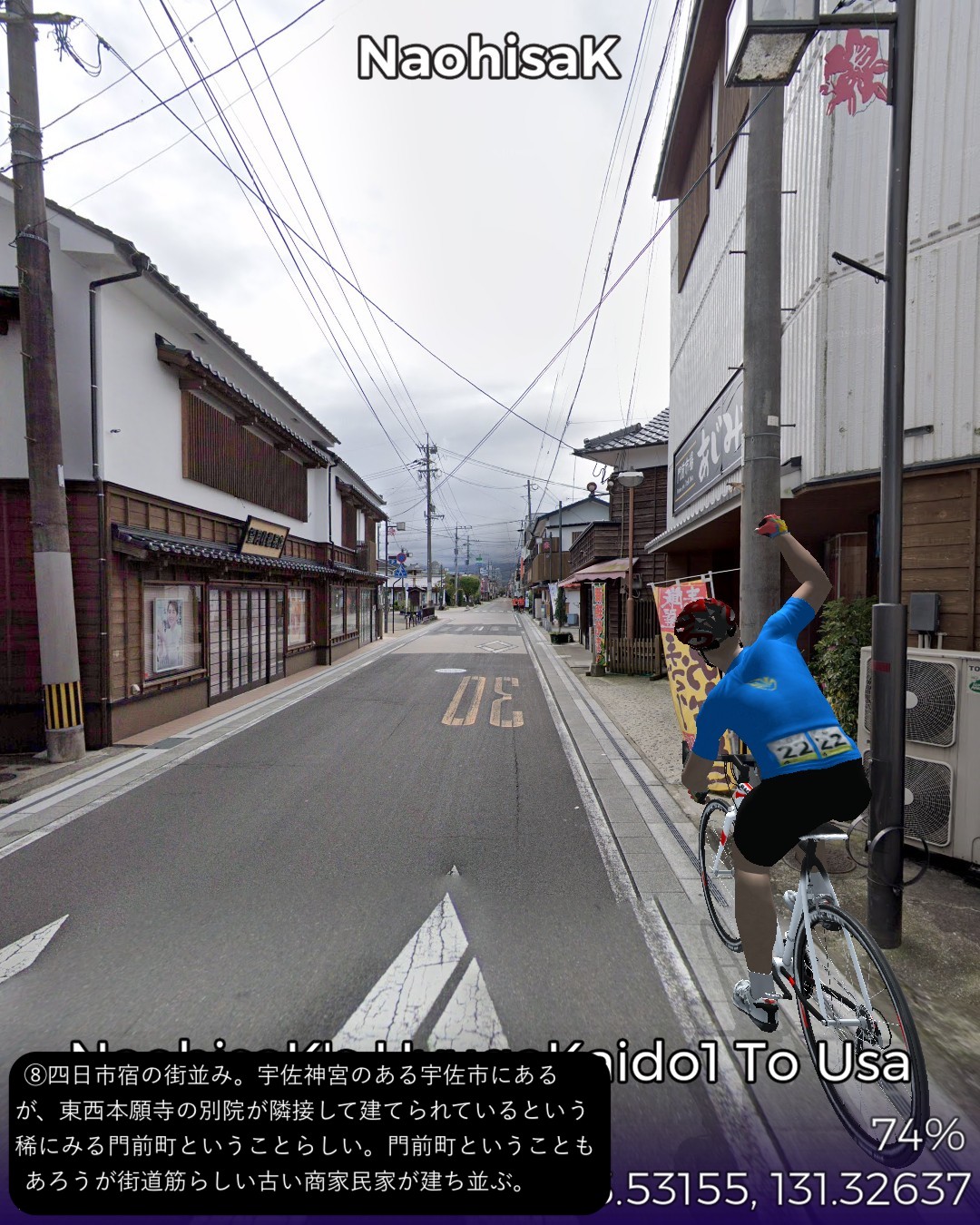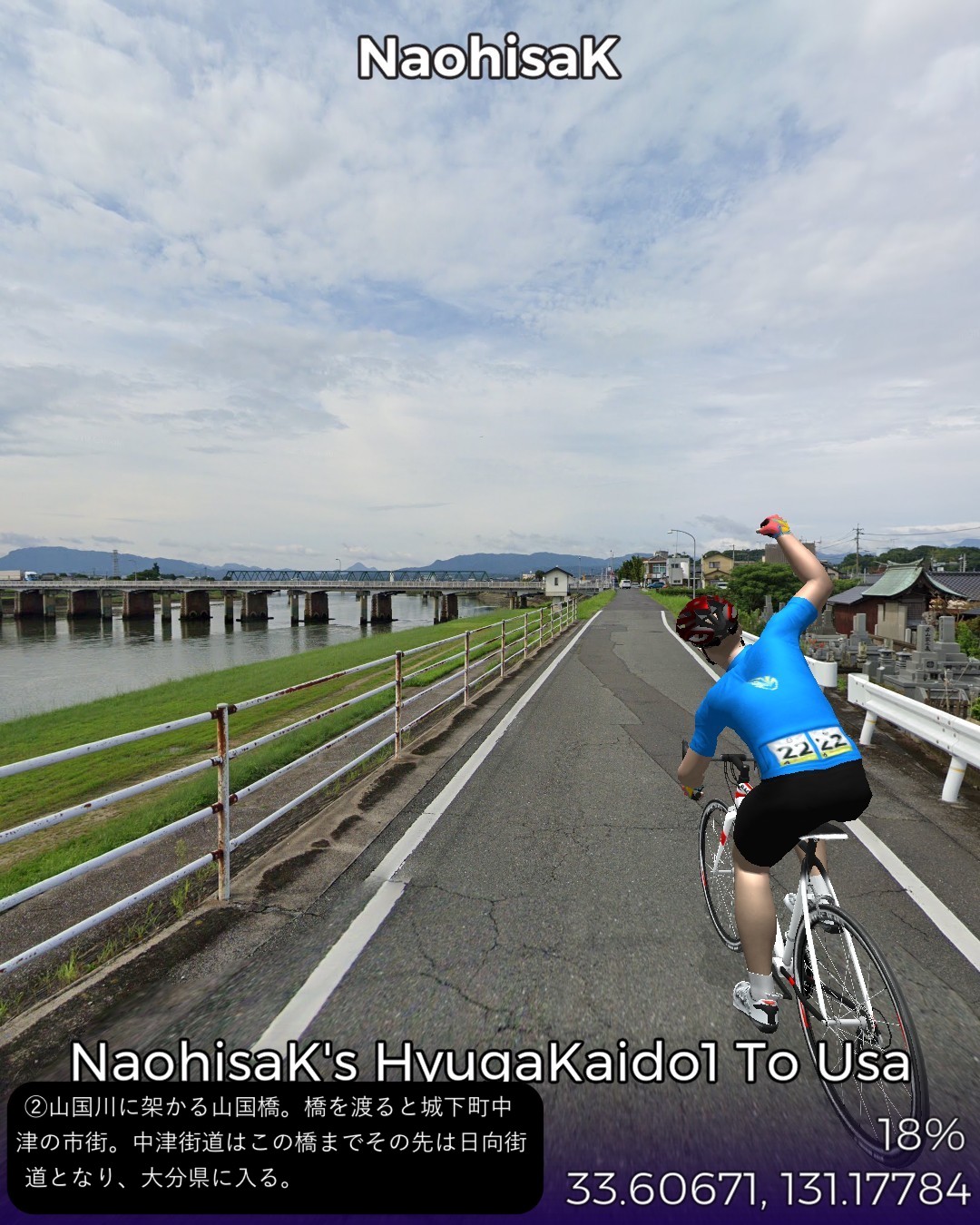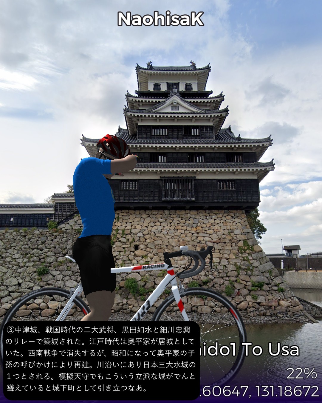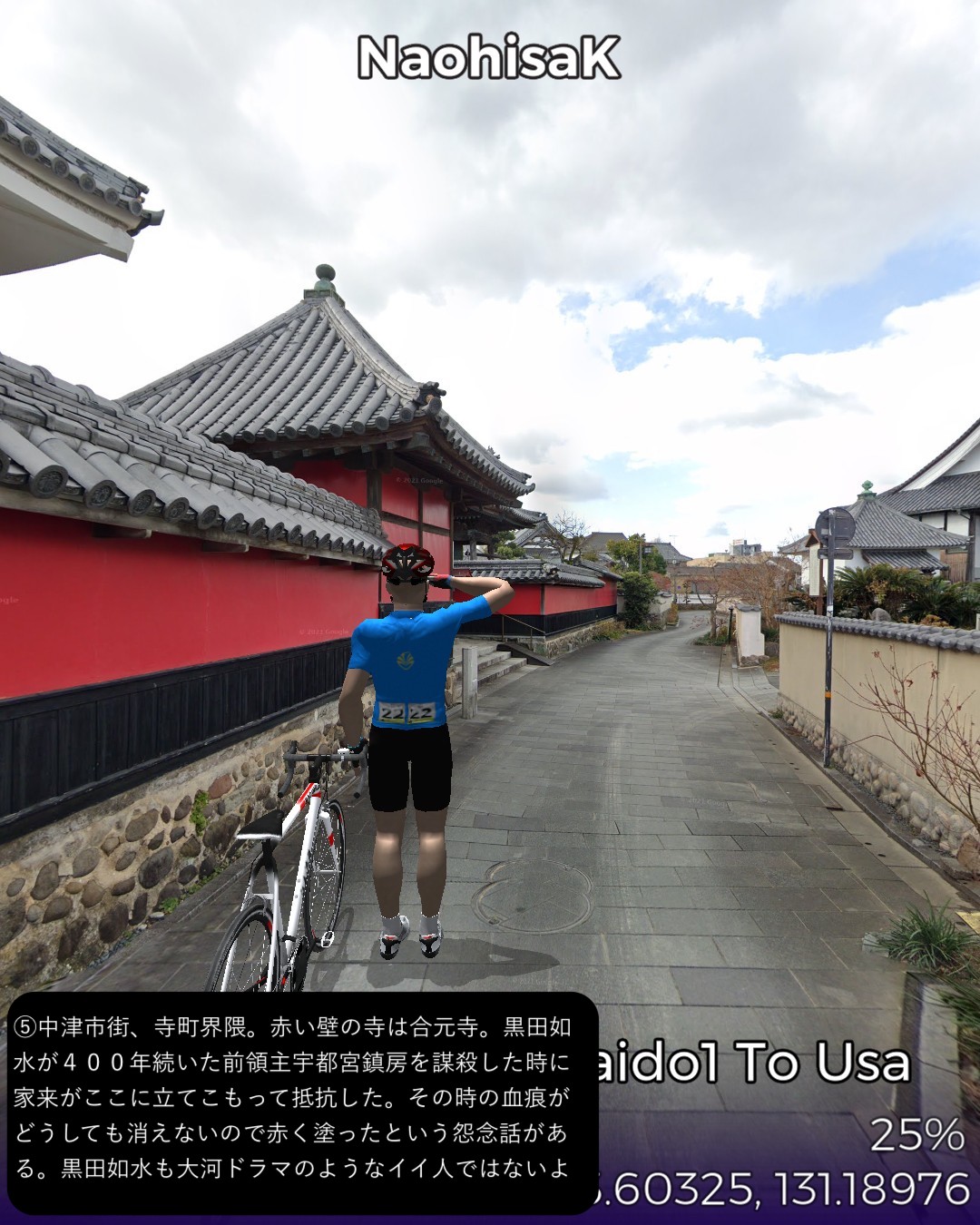 VRサイクリング 中津街道は早くも最終日3日目で八屋宿から中津まで行き、ちょっと市内観光した後、ここから日向街道が始まってその1日目として四日市宿を経て宇佐宿までトータル34kmの長丁場とあいなった。