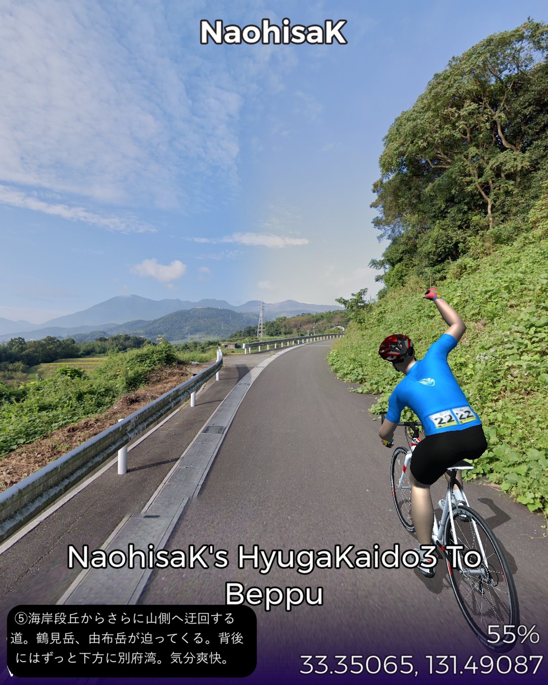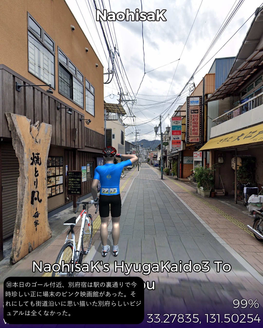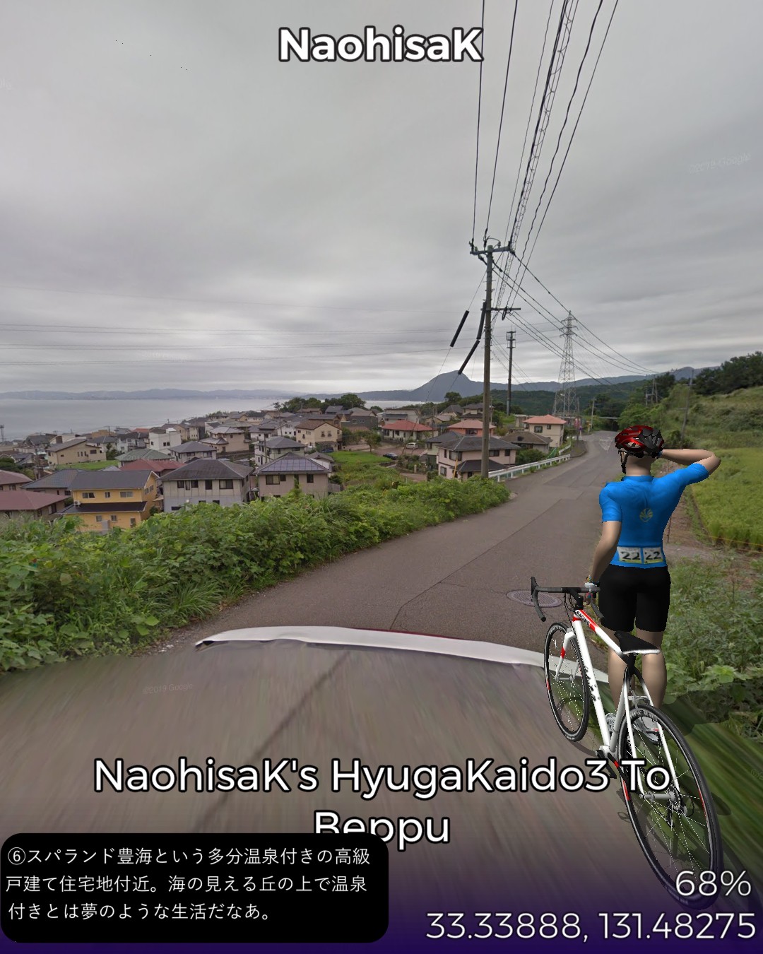 VRサイクリング 日向街道3日目は城下町杵築をスタートし、同じく城下町日出宿を経て別府湾沿いにの温泉都市別府宿へ至る31kmの行程。本日のルートにおける別府湾と取り囲む山々の展望は素晴らしく爽快の一言に尽きる。特に豊後豊岡を過ぎた後、海岸段丘を登って山側を迂回する道筋で開ける海と山の展望が良い。その後湯の町別府に入るのだが、街道が有名な地獄巡りや温泉街を外れているせいか、今1つ何回か訪れたことのある別府のイメージに適合しない沿道風景であった。別府は源泉数、湧出量共日本一の温泉地であるが、地域の広がりがあり、温泉旅館街も一塊になっているわけではない。海岸沿いにも山の奥にも宿泊施設は点在する。一方で大分市の隣で大分経済圏の一翼を担う都市でもあるので、観光客が行く地獄めぐりなどの観光スポット以外は住宅街やオフィス等が普通に展開している町なのであった。ちょっと別府らしいスポットに寄り道しても良かったがめぼしい観光地が街道から外れていたので諦めた次第。
