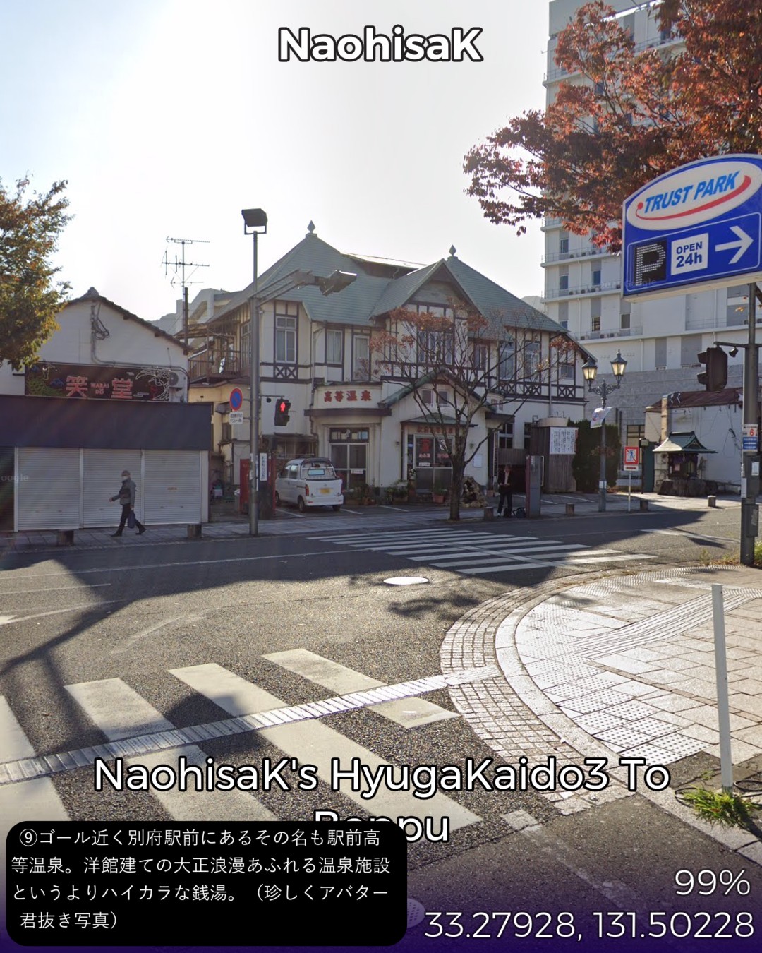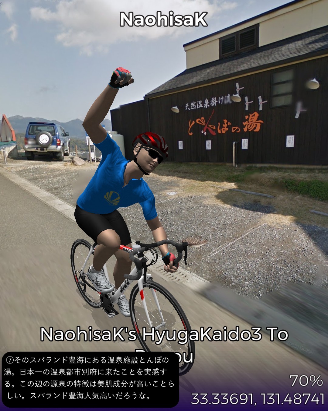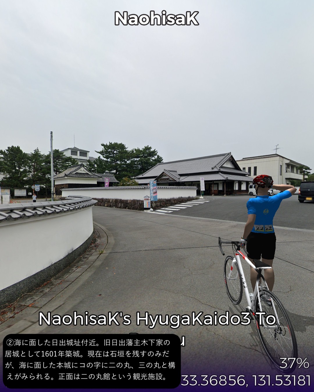 VRサイクリング 日向街道3日目は城下町杵築をスタートし、同じく城下町日出宿を経て別府湾沿いにの温泉都市別府宿へ至る31kmの行程。本日のルートにおける別府湾と取り囲む山々の展望は素晴らしく爽快の一言に尽きる。特に豊後豊岡を過ぎた後、海岸段丘を登って山側を迂回する道筋で開ける海と山の展望が良い。その後湯の町別府に入るのだが、街道が有名な地獄巡りや温泉街を外れているせいか、今1つ何回か訪れたことのある別府のイメージに適合しない沿道風景であった。別府は源泉数、湧出量共日本一の温泉地であるが、地域の広がりがあり、温泉旅館街も一塊になっているわけではない。海岸沿いにも山の奥にも宿泊施設は点在する。一方で大分市の隣で大分経済圏の一翼を担う都市でもあるので、観光客が行く地獄めぐりなどの観光スポット以外は住宅街やオフィス等が普通に展開している町なのであった。ちょっと別府らしいスポットに寄り道しても良かったがめぼしい観光地が街道から外れていたので諦めた次第。