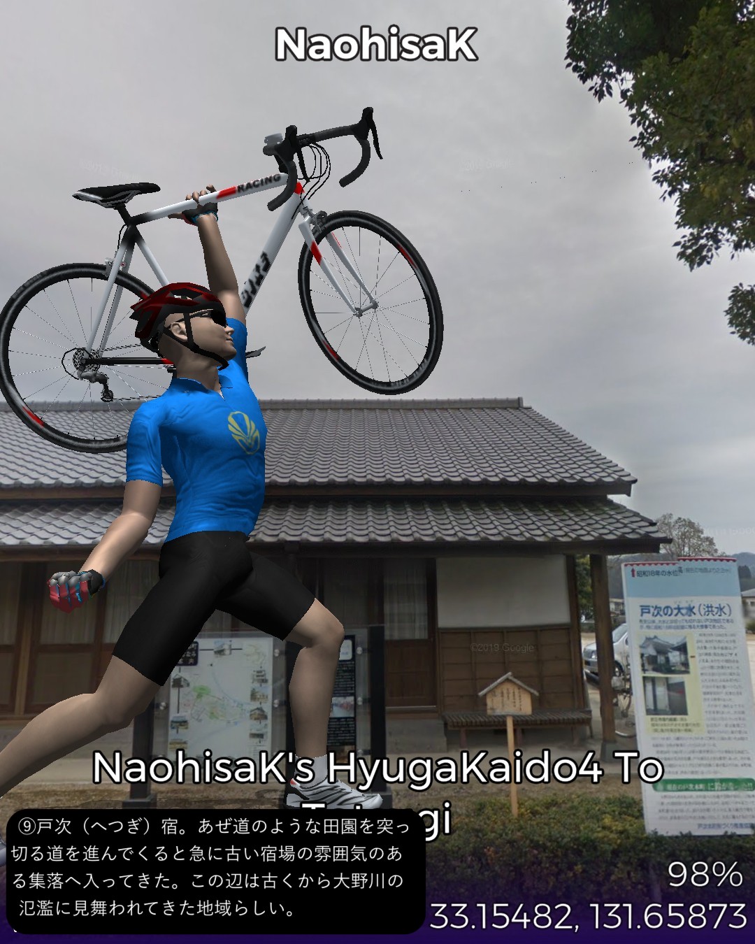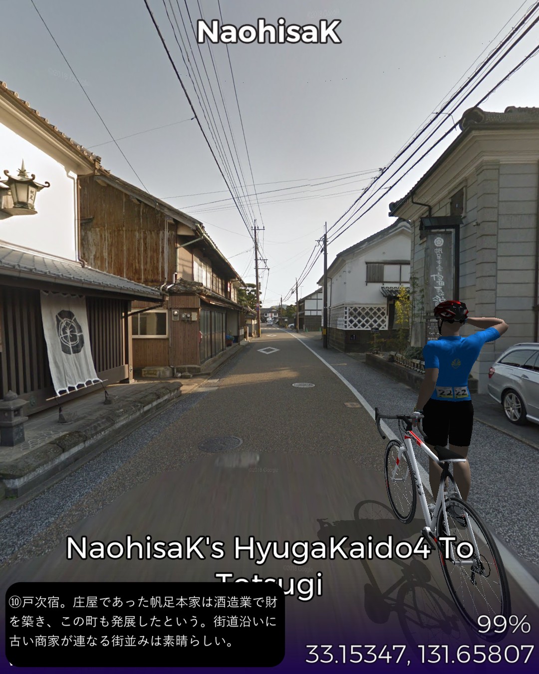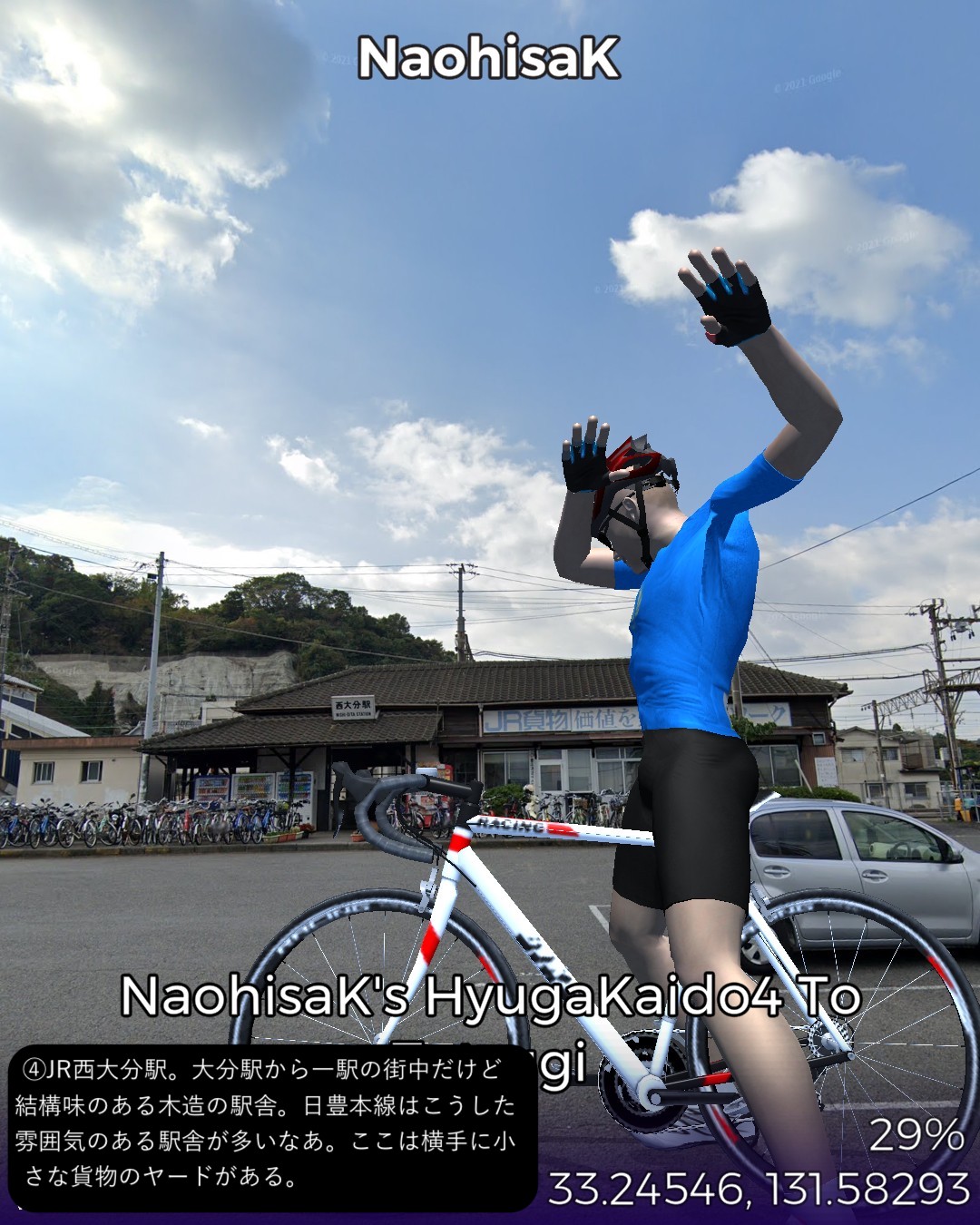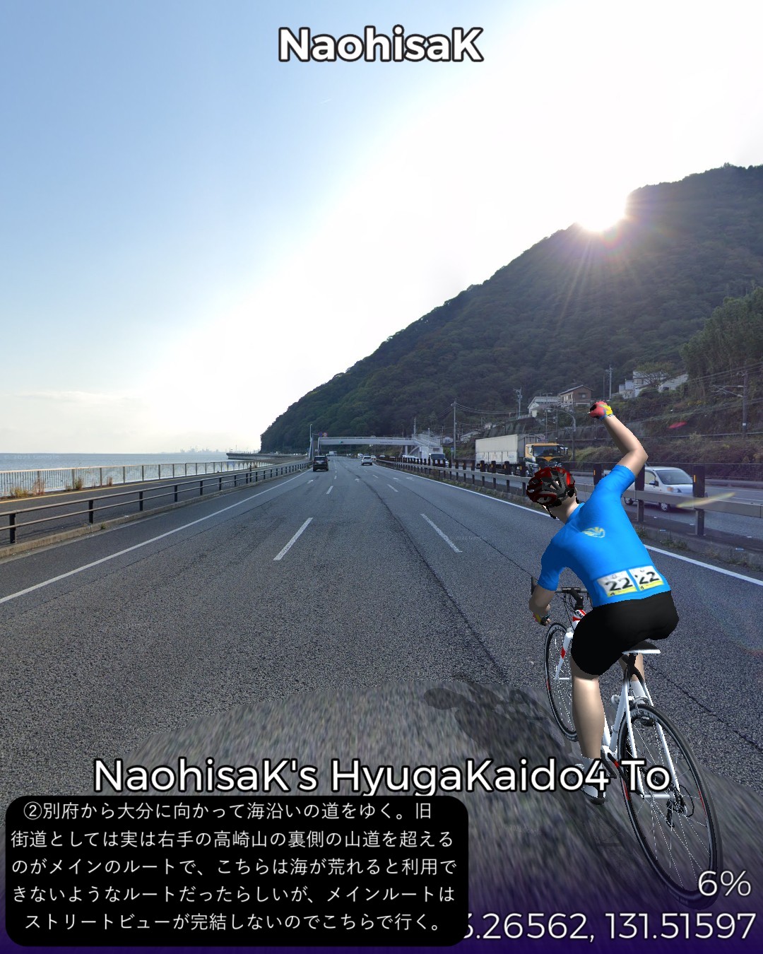 VRサイクリング、日向街道4日目。温泉都市別府宿から江戸時代まで府内と称されていた大分を通り過ぎ大分市の端に位置する戸次(へつぎ)宿までの30kmの行程。別府はイメージと違って肩透かしではあったが、街道筋は温泉場というより意外と宿場の雰囲気を醸し出していた。別府から大分へ向かう道としては、現在利用されている海沿いルートは昔は海が荒れると使えな買ったので、旧街道としては高崎山の裏側を通る山道ルートがメインだったらしいが、山道ルートのストリートビューが完結しないので、仕方なく海沿いの国道を走る。大分は思ったより大きな都市で、ここ50年半導体の生産拠点として発展してきたこともあり、むしろ重工業と共に衰退していった北九州より町が近代的で勢いがあるように見える。町としては府内城址以外には見るべきところはないと思われたので先へ進む。JR日豊本線は海沿いに臼杵、津久見という町へ向かうが、日向街道はしばらくJR豊肥本線に沿って山へ向かう。本日のゴールの戸次宿は大分市の南に位置する古い商家が建ち並ぶ街道筋の雰囲気あふれる宿場だった。