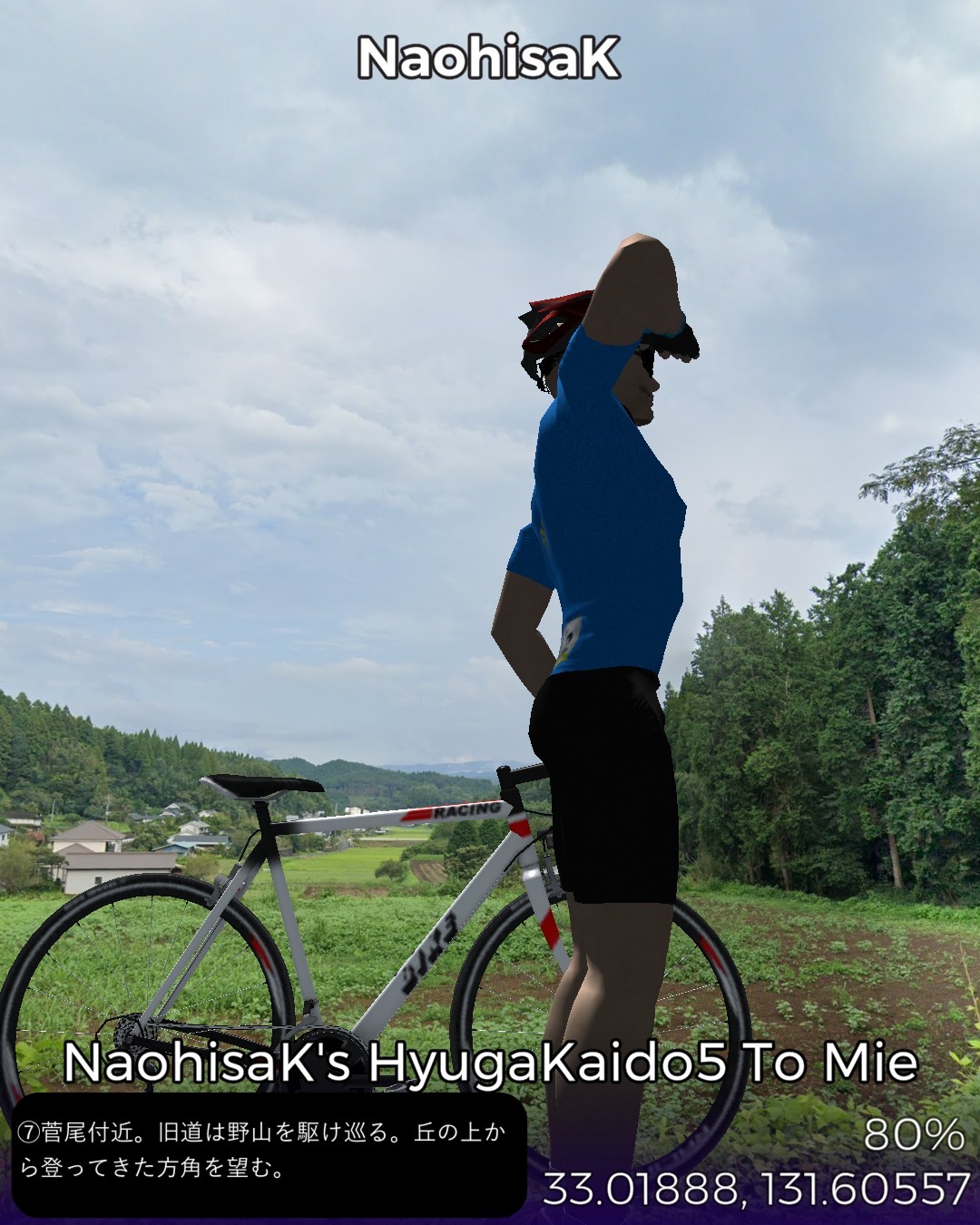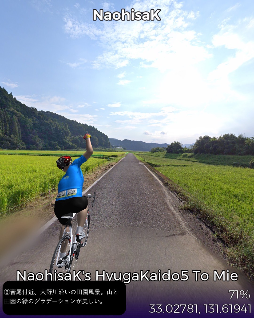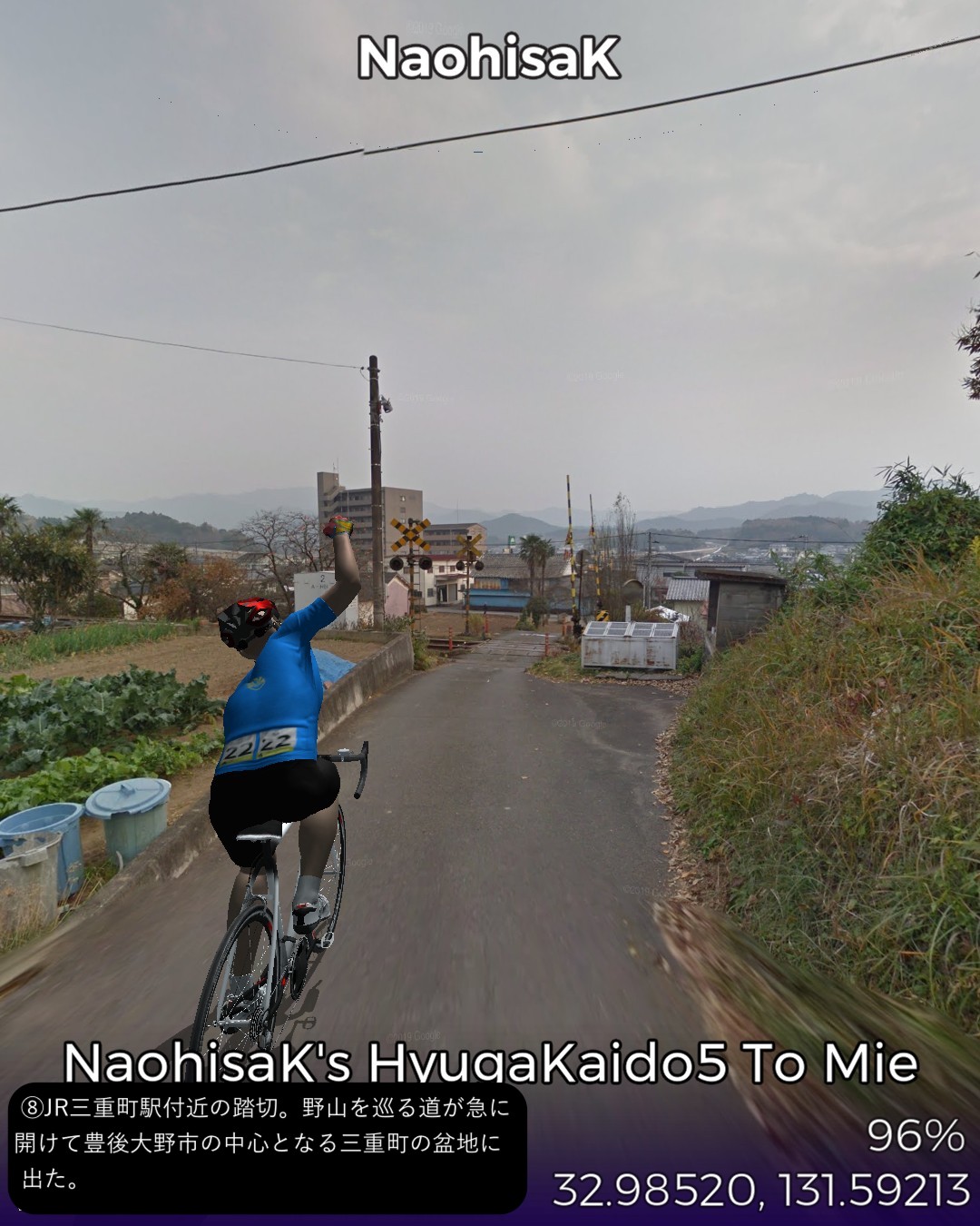 VRサイクリング 日向街道5日目 いにしえの街道の宿場の雰囲気を色濃く残す戸次宿からJR豊肥本線に沿って大野川を遡り、野津宿を経て豊後大野市の中心部に位置する三重宿まで28kmの行程。今回は特に名所もランドマークもなくひたすら川沿いに上流を目指すルートであるが、主に旧道沿いに野山を駆け巡る感じでそれはそれで気分良く田舎道を満喫できる。渓谷美溢れる川沿いの道、田園と散らばった集落と丘を登ったり下ったりを繰り返す箱庭風景。ここまでも散々眺めてきたような風景だが見飽きることはない。豊肥本線の先にある荒城の月で有名な竹田には行ったことがあり、いわゆる小京都的な街並みが美しい町だったので三重町にもそのような風情を期待したが、普通にそこそこ鄙びた盆地の町という感じで期待外れではあった。