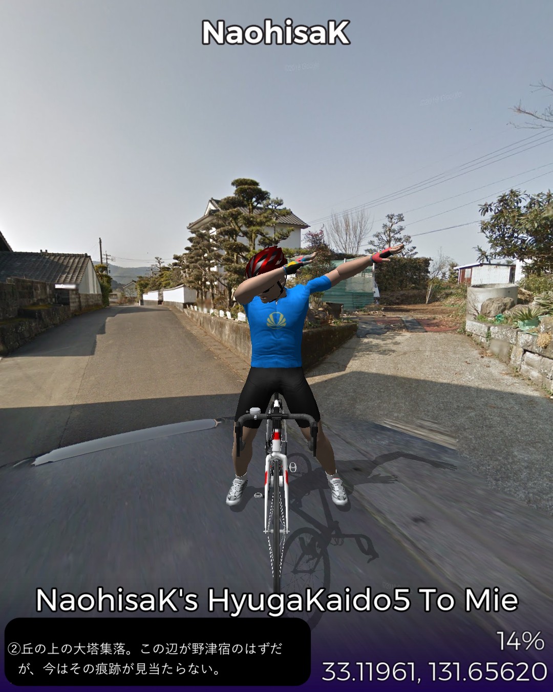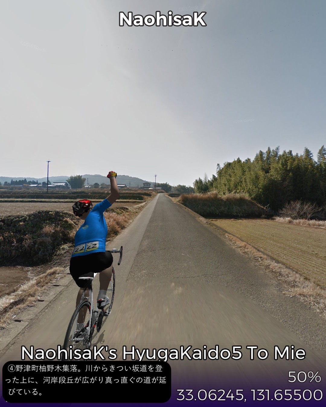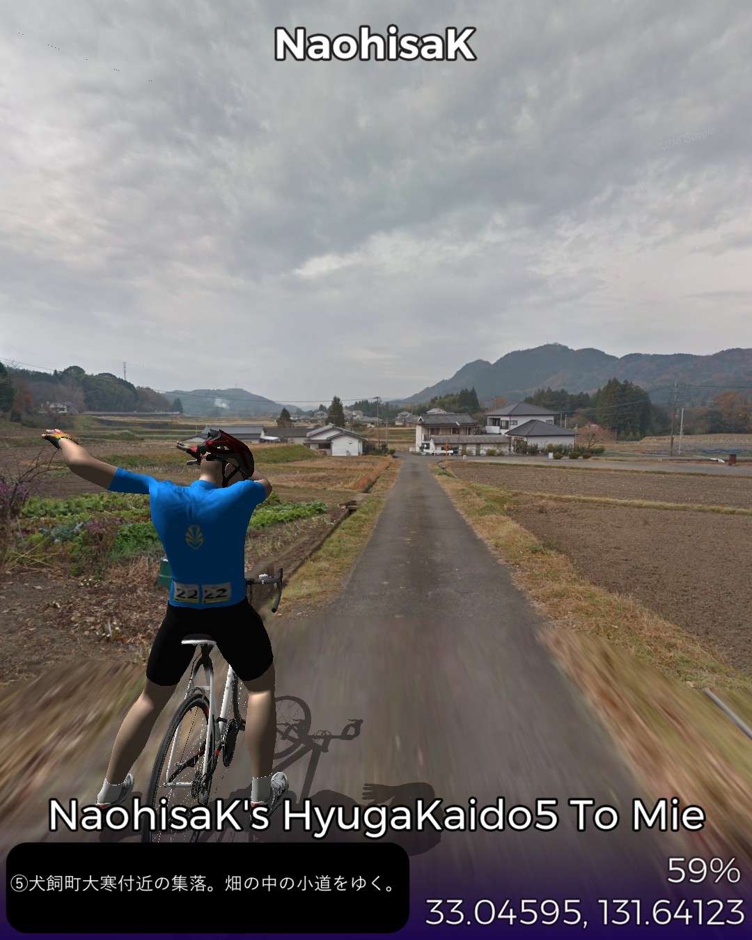 VRサイクリング 日向街道5日目 いにしえの街道の宿場の雰囲気を色濃く残す戸次宿からJR豊肥本線に沿って大野川を遡り、野津宿を経て豊後大野市の中心部に位置する三重宿まで28kmの行程。今回は特に名所もランドマークもなくひたすら川沿いに上流を目指すルートであるが、主に旧道沿いに野山を駆け巡る感じでそれはそれで気分良く田舎道を満喫できる。渓谷美溢れる川沿いの道、田園と散らばった集落と丘を登ったり下ったりを繰り返す箱庭風景。ここまでも散々眺めてきたような風景だが見飽きることはない。豊肥本線の先にある荒城の月で有名な竹田には行ったことがあり、いわゆる小京都的な街並みが美しい町だったので三重町にもそのような風情を期待したが、普通にそこそこ鄙びた盆地の町という感じで期待外れではあった。