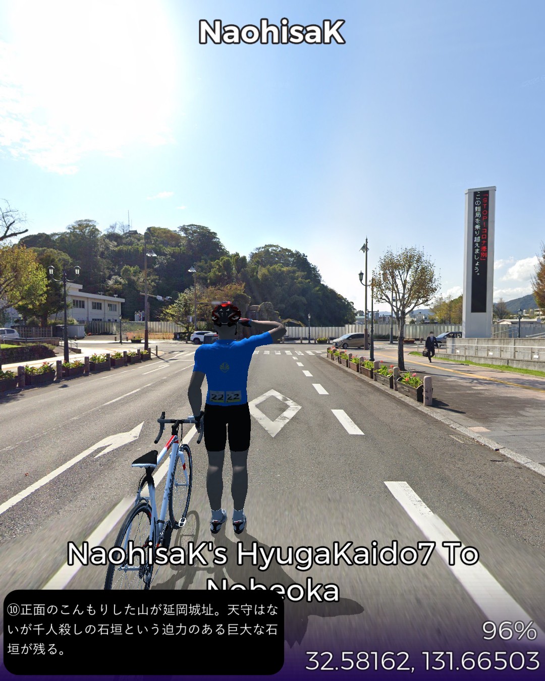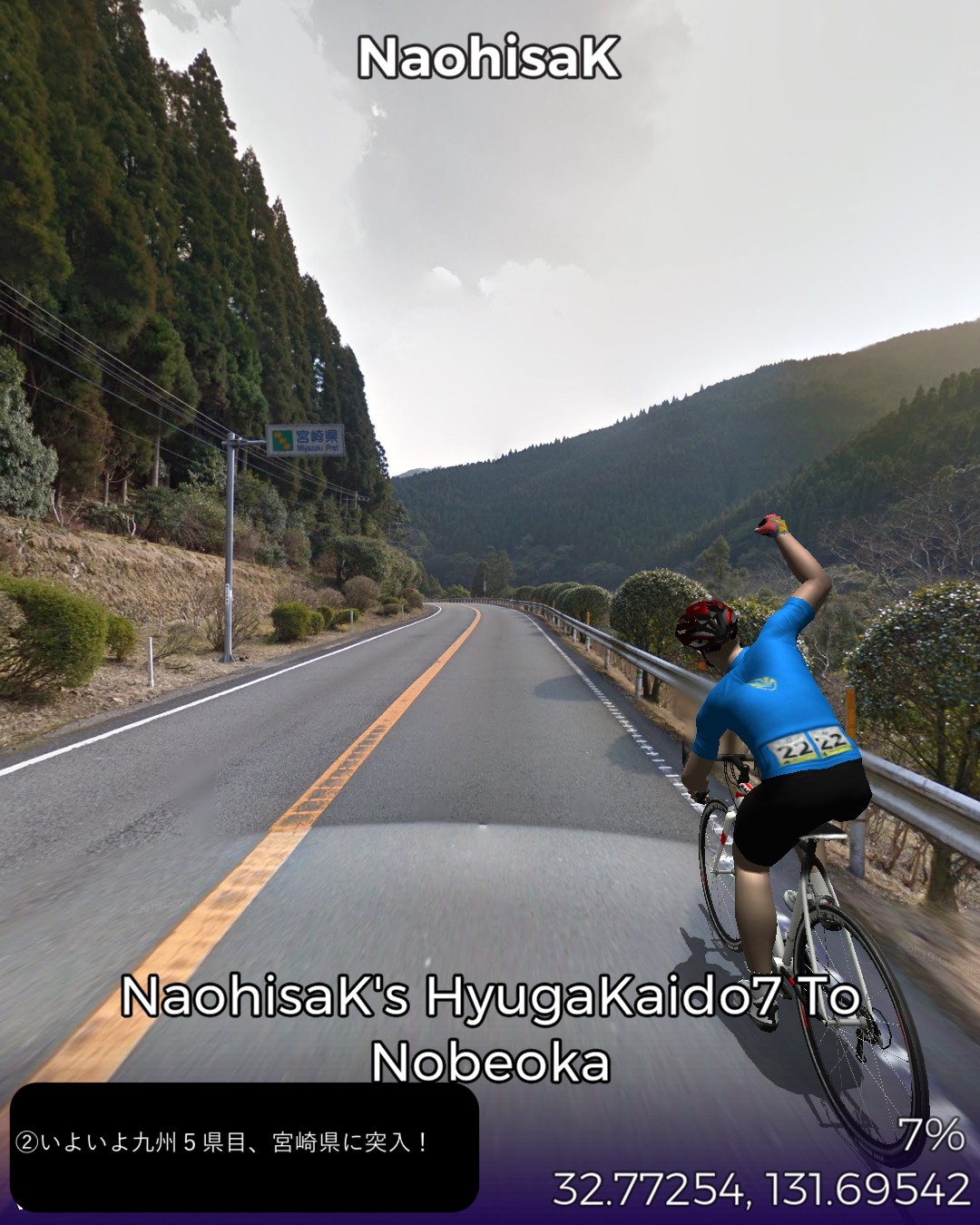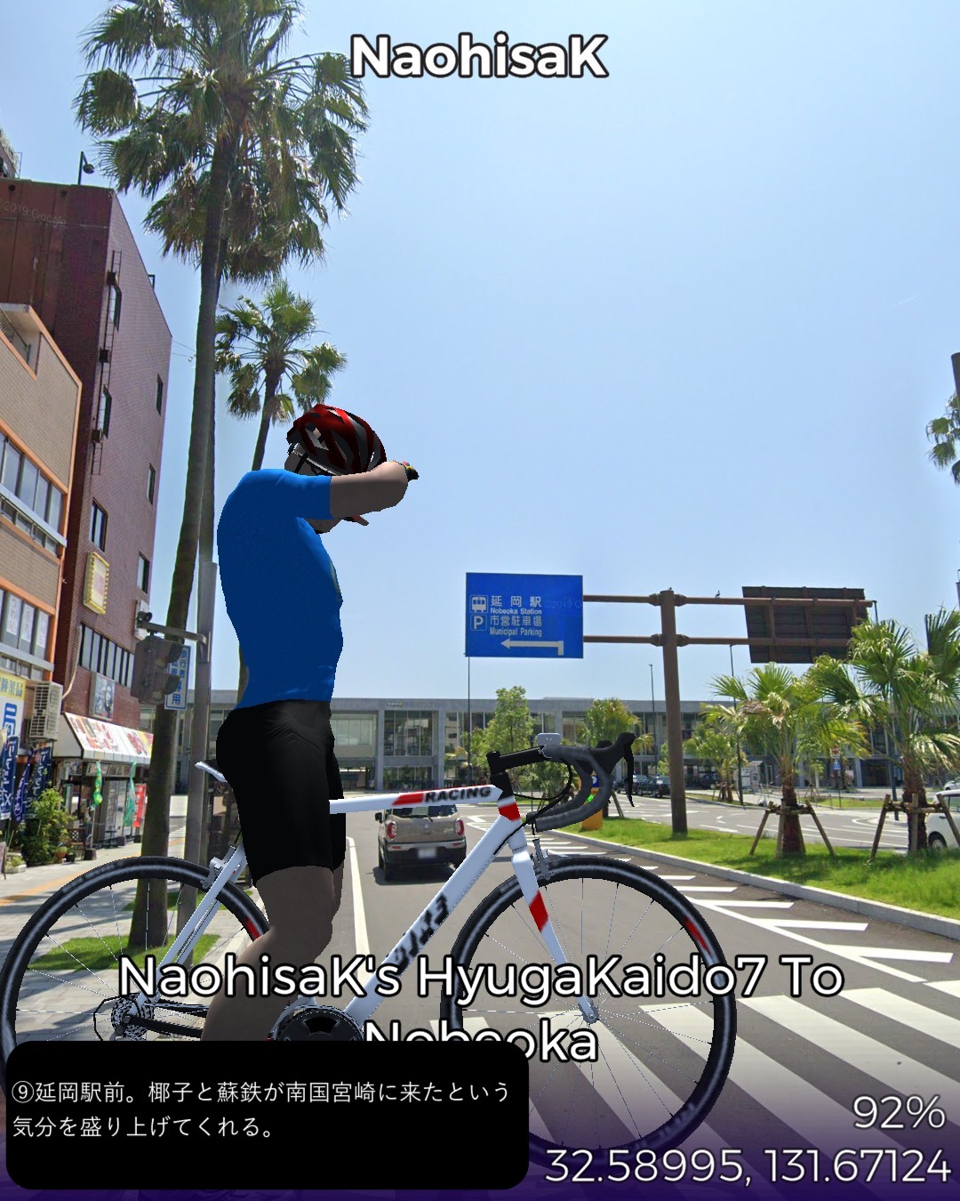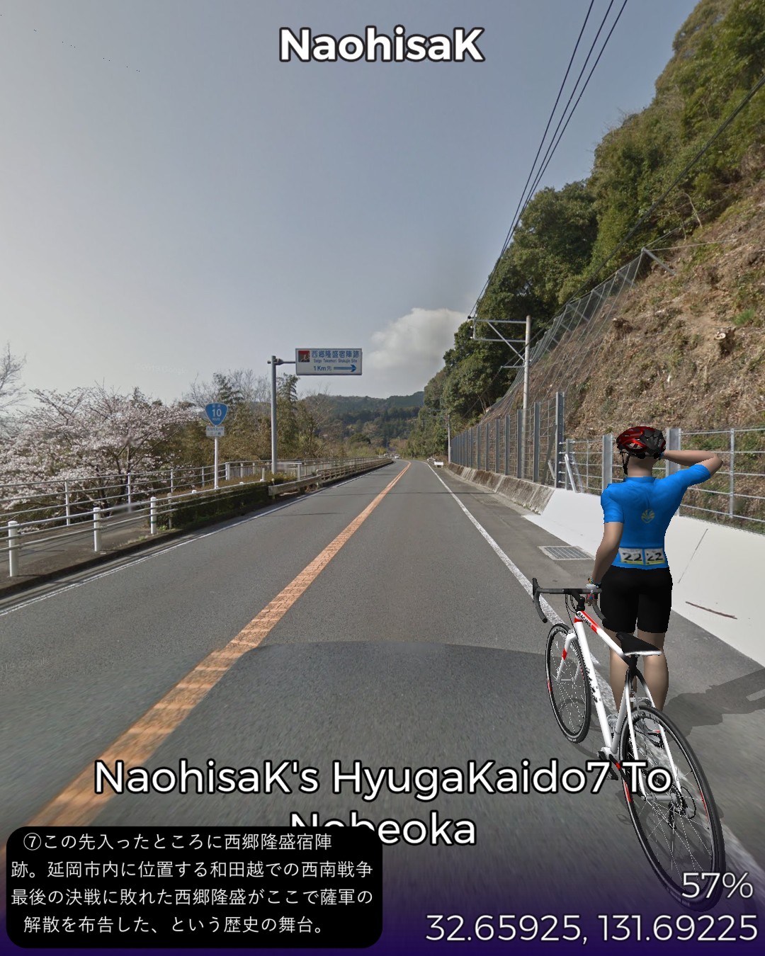 VRサイクリング 日向街道7日目。幾重もの山に囲まれた秘境、宗太郎宿をスタートし、宮崎県に入り、大きな2つの川の合流点の町、北川宿を経て、城下町延岡宿に至る33kmの行程。本日のルートはとにかく山の奥の奥から川と共に山をひたすら下り大分以来ずっと抜けられなかった山間を脱して、河口の都市延岡に辿り着くという、一方向ベクトルの道だ。リアルなサイクリングならずっとほぼ下り坂のダウンヒルを延々と楽しめるのだが、流石にVRではその楽しみはないな。この間並行するJR日豊本線に5つ駅があるがこれらに停まる普通列車はなんと早朝に延岡方面行きが一本と夜逆方向に一本しかないのだ。出発点の山間地がどれだけ秘境なのかわかる。延岡はリアルには通りすぎたことがあるだけであるが、多くの川の河口が集結した場所なので橋の数も多い町であることがわかった。歴史的には西南戦争の最後の舞台になった土地で、熊本の田原坂は有名だが、その後この延岡が最終決戦地となり、敗れた西郷隆盛が薩軍の解散を宣言した場所も残されている。これからは宮崎県の長い海岸線に沿った旅になる。