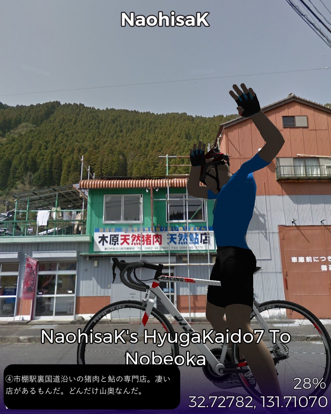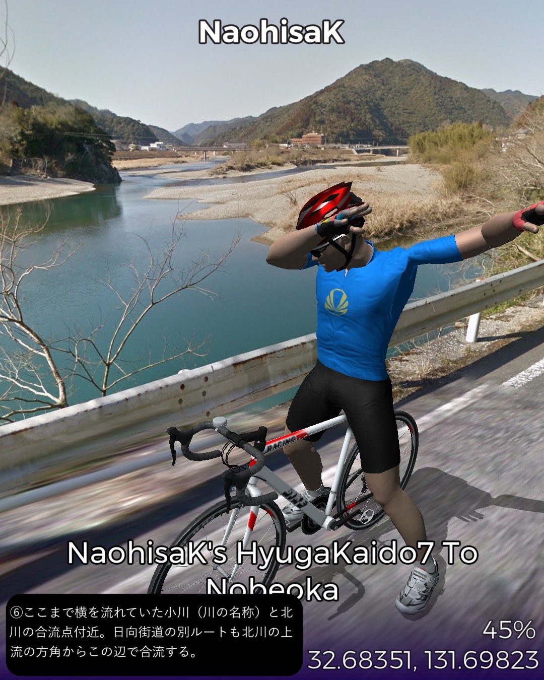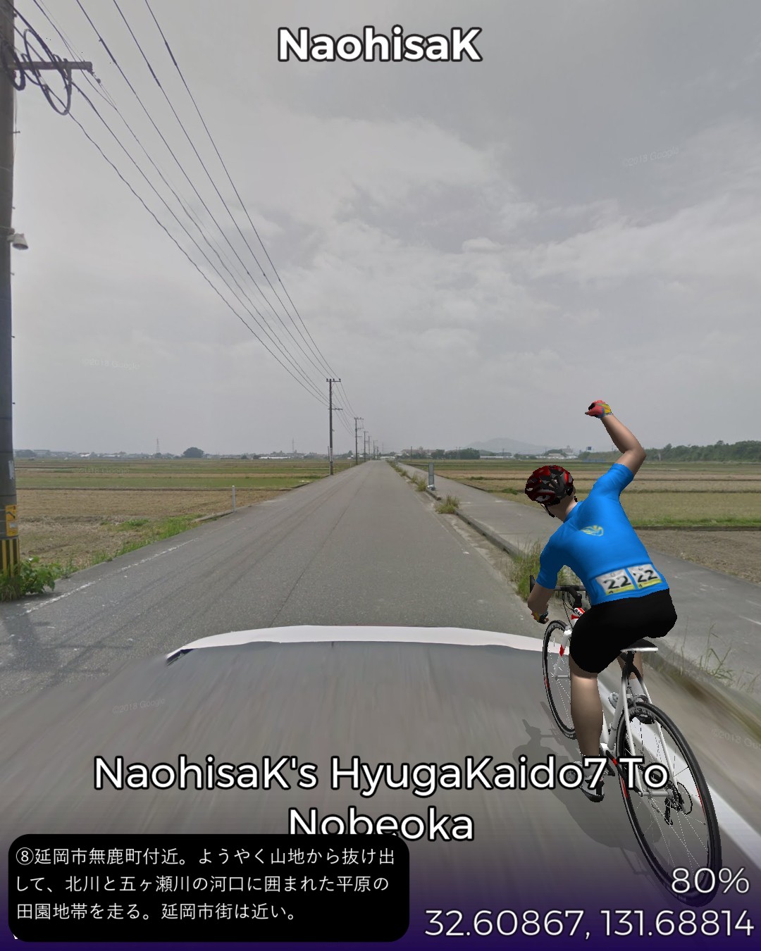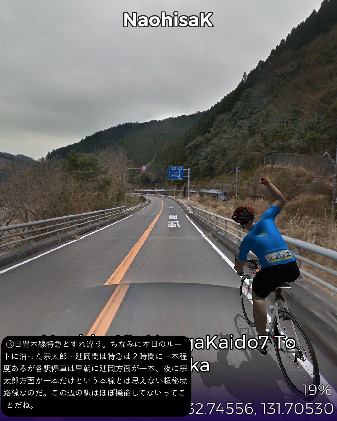 VRサイクリング 日向街道7日目。幾重もの山に囲まれた秘境、宗太郎宿をスタートし、宮崎県に入り、大きな2つの川の合流点の町、北川宿を経て、城下町延岡宿に至る33kmの行程。本日のルートはとにかく山の奥の奥から川と共に山をひたすら下り大分以来ずっと抜けられなかった山間を脱して、河口の都市延岡に辿り着くという、一方向ベクトルの道だ。リアルなサイクリングならずっとほぼ下り坂のダウンヒルを延々と楽しめるのだが、流石にVRではその楽しみはないな。この間並行するJR日豊本線に5つ駅があるがこれらに停まる普通列車はなんと早朝に延岡方面行きが一本と夜逆方向に一本しかないのだ。出発点の山間地がどれだけ秘境なのかわかる。延岡はリアルには通りすぎたことがあるだけであるが、多くの川の河口が集結した場所なので橋の数も多い町であることがわかった。歴史的には西南戦争の最後の舞台になった土地で、熊本の田原坂は有名だが、その後この延岡が最終決戦地となり、敗れた西郷隆盛が薩軍の解散を宣言した場所も残されている。これからは宮崎県の長い海岸線に沿った旅になる。