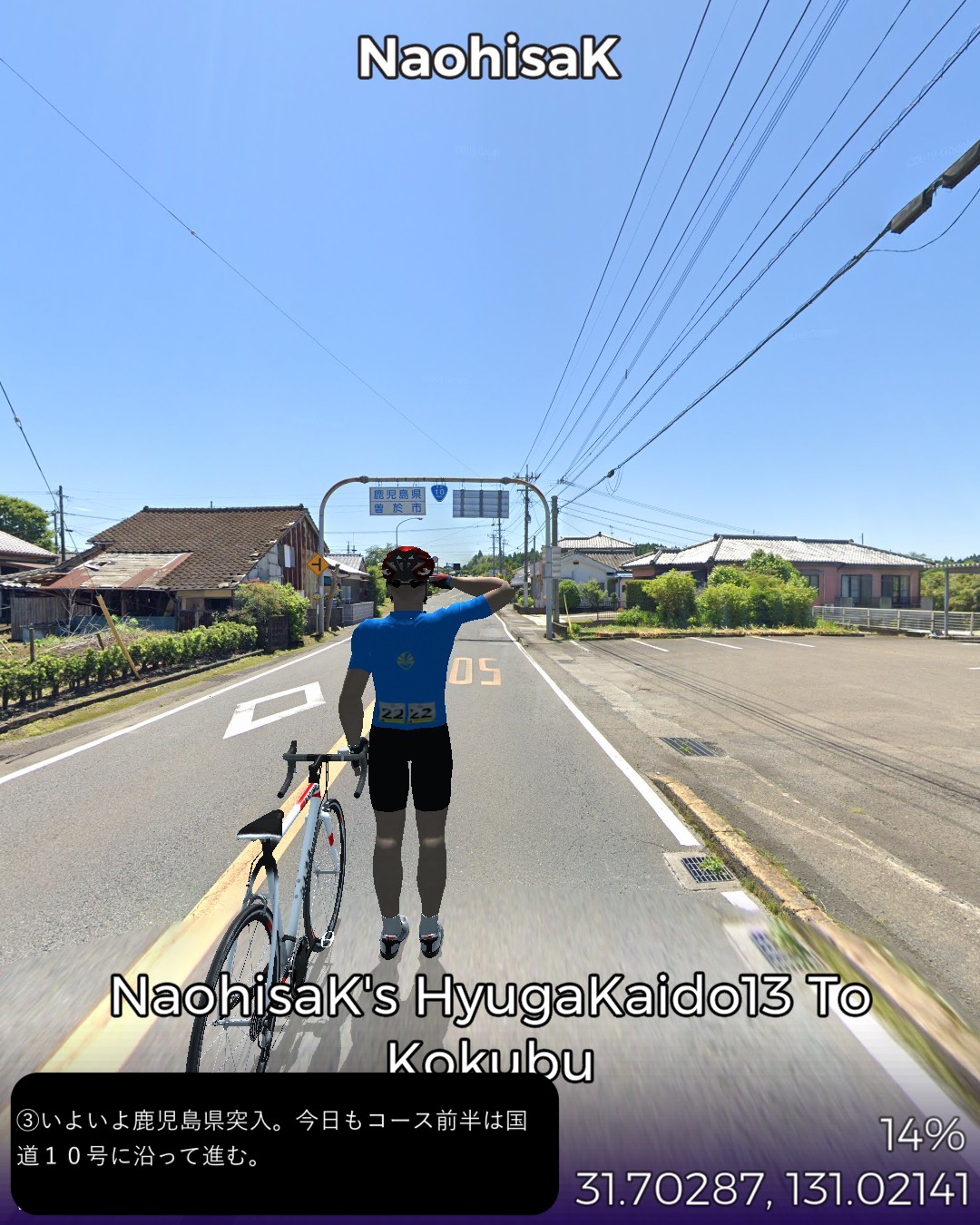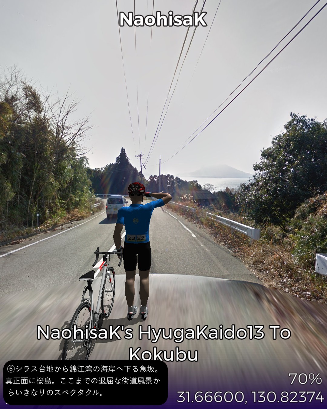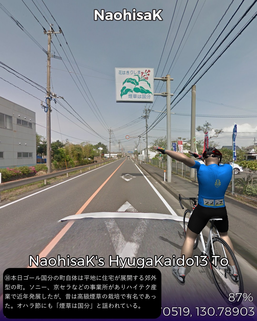VRサイクリング 日向街道13日目は都城宿から鹿児島県に入り丘陵地を延々と横断して突き当たりの錦江湾沿いを北上して国分宿へ至る長丁場42kmの行程。この間昔から火山灰の不毛の地だったのでどうやら宿場もなかったようだ。昔の旅人は野宿でもしたのだろうか?約29000年前に錦江湾北部で超巨大噴火が起こり、その結果周囲は火山灰が堆積した不毛なシラス台地となり、噴火口は陥没した巨大なカルデラに海水が雪崩れ込んで錦江湾北部となった。そして桜島はその後の火山活動でできたということである。初めて知ったが信じられない程スケールのでかい話である。つまり桜島及び鹿児島県の半分は阿蘇のような二重火山だということになる。それを踏まえて本日のルートを進むとそれが実感できる。都城から西に進む街道沿いには田んぼはほとんどなく畑かあるいは草茫々の荒野に森が点在するようななだらかな丘陵地が延々と続く。これがシラス台地で多分畑では特産品であるサツマイモや大豆が栽培されているのだろう。この平坦な丘陵地が実は結構標高があり、街道が錦江湾にぶつかるところでは急峻な下り坂となっているのだが、そこからの錦江湾と桜島の眺望が素晴らしい絶景である。実は桜島はリアルに2回訪れているが鹿児島市街からのアプローチだったのでこの絶景の存在は知らなかった。海の真ん中に桜島がドンと鎮座し、広大な錦江湾に丸く弧を描く海岸線はシラス台地が崖となっていて、この景色は阿蘇の外輪山からの眺めを想起させるが、それは同様な二重火山であることを知ると納得できると共にそのスケールのデカさに震撼する。本日のゴールの国分はその錦江湾沿岸の平地に発達した町であるが、昔はオハラ節にも謡われる高級煙草の栽培地、今はソニー、京セラなどが事業所を構えるハイテク産業の拠点として発展している。次回はいよいよ街道の終着鹿児島へ到達予定。その先は・・・。