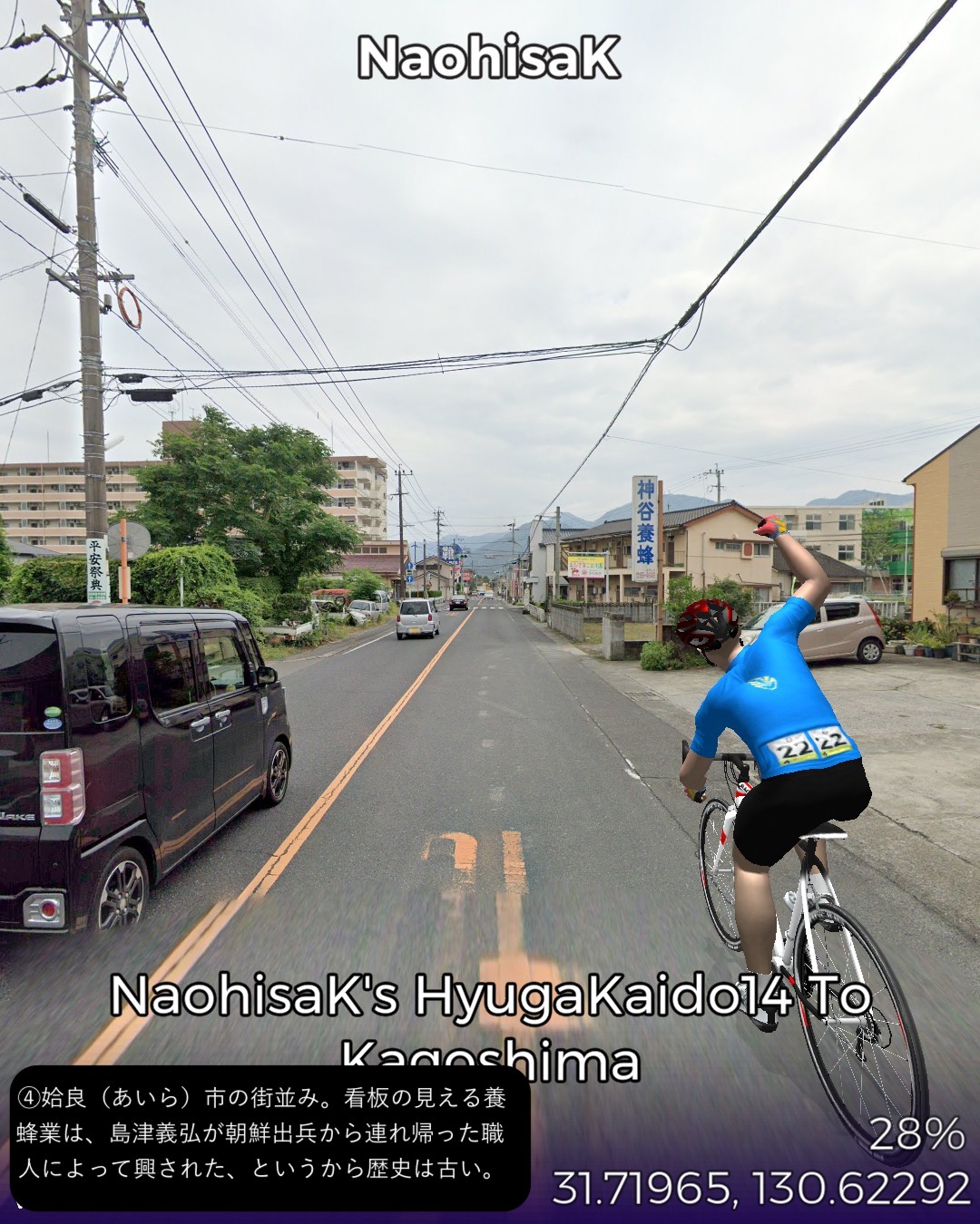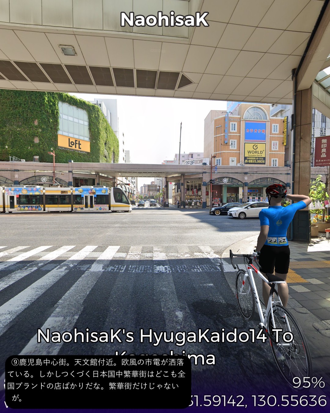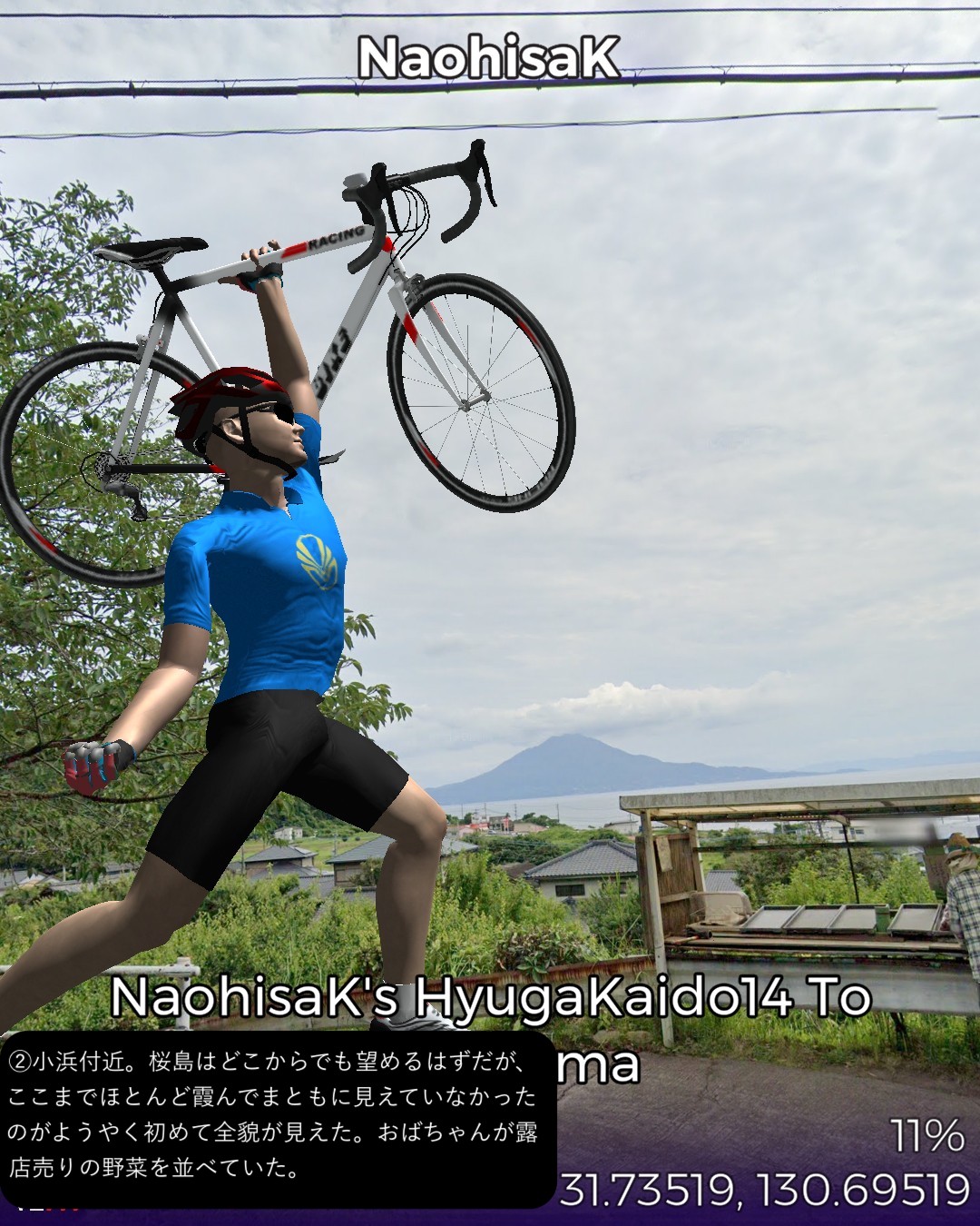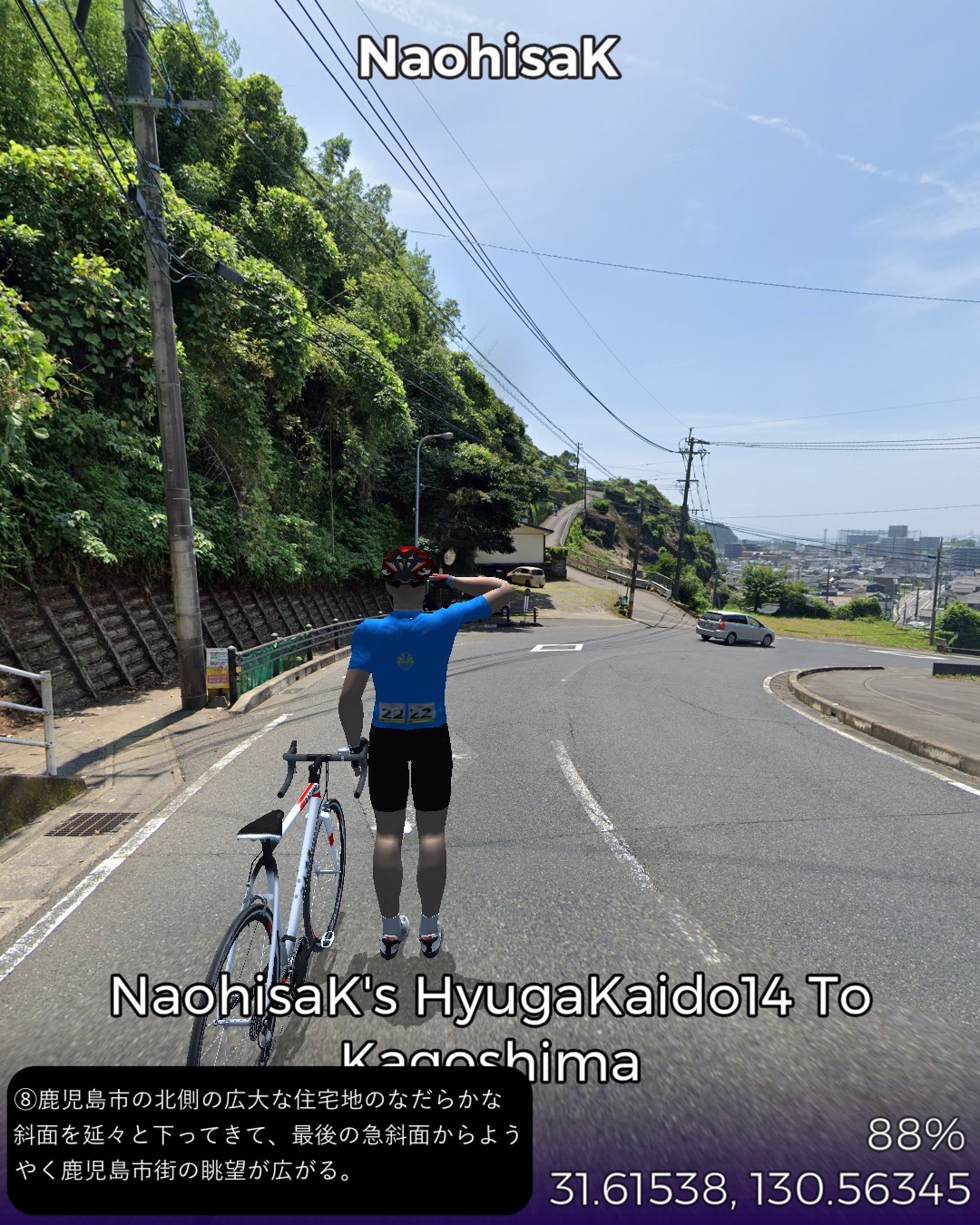 VRサイクリング 日向街道最終日14日目 錦江湾の1時の方角の国分宿から反時計回りに11時の方角の加治木宿、10時の方角の重富宿を経て8時の方角の鹿児島まで、何と今までの最長距離と言っていい49kmを一気にラストスパート。なぜそんな距離になったかについてはこの地域の地学的要因が関係している。前回も述べたように29000年前の超大噴火により錦江湾北側はカルデラとなりその沿岸に外輪山が形成された。本日のルートはその外輪山をぐるっと巡るルートに相当する訳であるが、前半の国分宿から重富宿までは外輪山が欠けて平野になっている地帯なので海岸沿いに進んでゆくが、後半の重富宿から鹿児島市街にかけては大噴火でできた深い外輪山が海に迫っていて、旧街道は白銀坂という険しい山道となるためVRサイクリングとしては他のルートを進ざるを得ない。海沿いの国道を進む手もあったがそうすると街道に合流することなくゴールまで行くことになるので、最大限街道を走るルート設定をした結果大迂回路となってしまった。その鹿児島市街の北側に広がる外輪山地帯は重富宿からは急峻に立ち上がっているのだが、鹿児島市街に向けては15km程度緩やかな斜面を延々と下るような地形になっていて興味深い。その緩やかな斜面にはベッドタウンが広がっているが街道を進んでもどこまでも家並が続く下り坂でなかなか市街地に到達しないという不思議なルートであった。ゴールは、しばらくぶりの大都市鹿児島市街の賑やかなところを抜けて鹿児島新港のフェリーターミナルへ到着。九州としては行き着くところまで来たということで、ここから6/17 18:00発のフェリー波之上に乗船して沖縄へいく。