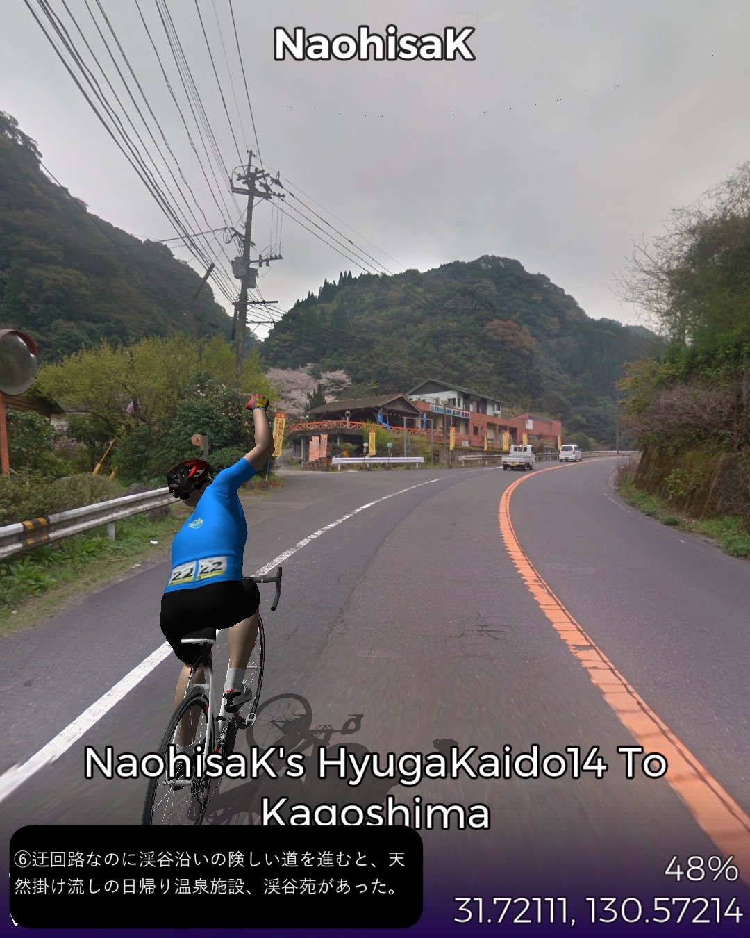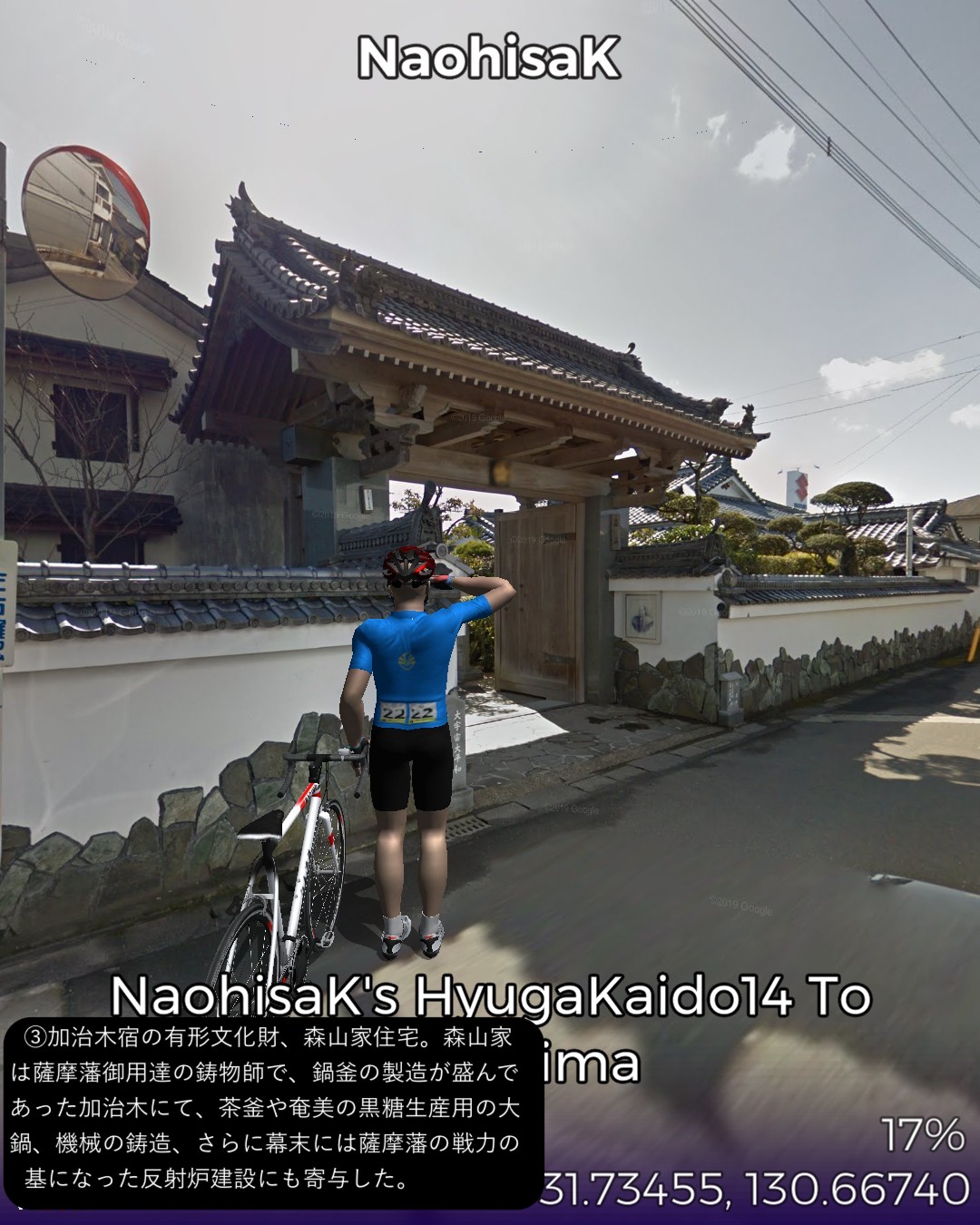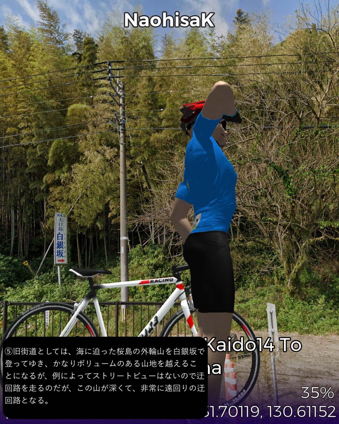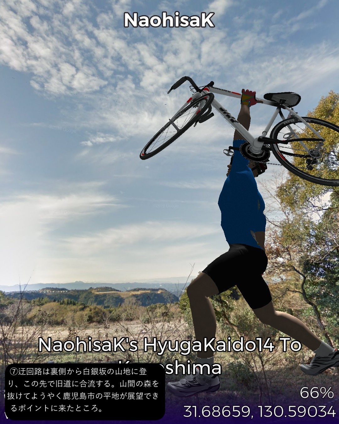 VRサイクリング 日向街道最終日14日目 錦江湾の1時の方角の国分宿から反時計回りに11時の方角の加治木宿、10時の方角の重富宿を経て8時の方角の鹿児島まで、何と今までの最長距離と言っていい49kmを一気にラストスパート。なぜそんな距離になったかについてはこの地域の地学的要因が関係している。前回も述べたように29000年前の超大噴火により錦江湾北側はカルデラとなりその沿岸に外輪山が形成された。本日のルートはその外輪山をぐるっと巡るルートに相当する訳であるが、前半の国分宿から重富宿までは外輪山が欠けて平野になっている地帯なので海岸沿いに進んでゆくが、後半の重富宿から鹿児島市街にかけては大噴火でできた深い外輪山が海に迫っていて、旧街道は白銀坂という険しい山道となるためVRサイクリングとしては他のルートを進ざるを得ない。海沿いの国道を進む手もあったがそうすると街道に合流することなくゴールまで行くことになるので、最大限街道を走るルート設定をした結果大迂回路となってしまった。その鹿児島市街の北側に広がる外輪山地帯は重富宿からは急峻に立ち上がっているのだが、鹿児島市街に向けては15km程度緩やかな斜面を延々と下るような地形になっていて興味深い。その緩やかな斜面にはベッドタウンが広がっているが街道を進んでもどこまでも家並が続く下り坂でなかなか市街地に到達しないという不思議なルートであった。ゴールは、しばらくぶりの大都市鹿児島市街の賑やかなところを抜けて鹿児島新港のフェリーターミナルへ到着。九州としては行き着くところまで来たということで、ここから6/17 18:00発のフェリー波之上に乗船して沖縄へいく。