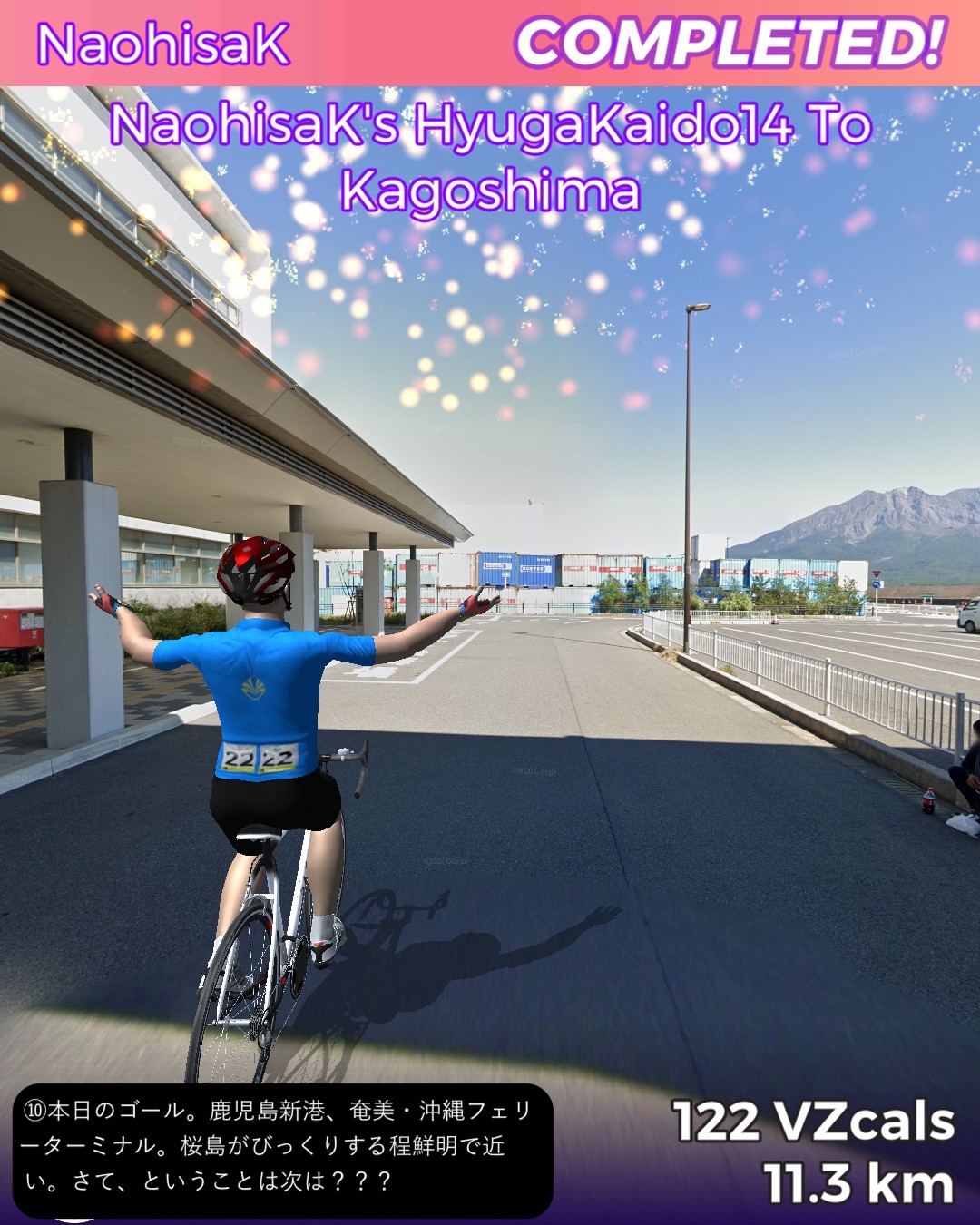 VRサイクリング 日向街道最終日14日目 錦江湾の1時の方角の国分宿から反時計回りに11時の方角の加治木宿、10時の方角の重富宿を経て8時の方角の鹿児島まで、何と今までの最長距離と言っていい49kmを一気にラストスパート。なぜそんな距離になったかについてはこの地域の地学的要因が関係している。前回も述べたように29000年前の超大噴火により錦江湾北側はカルデラとなりその沿岸に外輪山が形成された。本日のルートはその外輪山をぐるっと巡るルートに相当する訳であるが、前半の国分宿から重富宿までは外輪山が欠けて平野になっている地帯なので海岸沿いに進んでゆくが、後半の重富宿から鹿児島市街にかけては大噴火でできた深い外輪山が海に迫っていて、旧街道は白銀坂という険しい山道となるためVRサイクリングとしては他のルートを進ざるを得ない。海沿いの国道を進む手もあったがそうすると街道に合流することなくゴールまで行くことになるので、最大限街道を走るルート設定をした結果大迂回路となってしまった。その鹿児島市街の北側に広がる外輪山地帯は重富宿からは急峻に立ち上がっているのだが、鹿児島市街に向けては15km程度緩やかな斜面を延々と下るような地形になっていて興味深い。その緩やかな斜面にはベッドタウンが広がっているが街道を進んでもどこまでも家並が続く下り坂でなかなか市街地に到達しないという不思議なルートであった。ゴールは、しばらくぶりの大都市鹿児島市街の賑やかなところを抜けて鹿児島新港のフェリーターミナルへ到着。九州としては行き着くところまで来たということで、ここから6/17 18:00発のフェリー波之上に乗船して沖縄へいく。