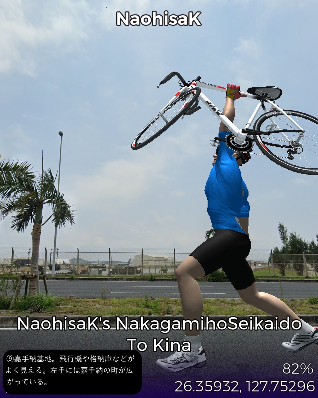 VRサイクリング 沖縄編 琉球王朝が整備した主要道「宿道(しゅくみち)」の1つ中頭方西海道(なかがみほうせいかいどう)を通って、首里城から沖縄島中部へ向かって走る。前回のゴールである守礼門が本日のスタート地点だが、中頭方西海道は首里城の通用門である久慶門が起点となる。そこから所々に旧街道の痕跡を探しつつ昔のルートを進んでゆくこととするが、やはりVRサイクリングで必須のストリートビューが設定されていない古道にそうした痕跡が残っていることが多いのでなかなか難しい。首里からアップダウンの多い道を北へ進み、浦添市からさらに宜野湾市で海岸沿いに出て、北谷町、基地の町嘉手納町を経て読谷村の喜名番所跡に到達する27kmの行程を進む。首里から浦添にかけての丘陵地帯は歴史の道として旧街道の痕跡が残っているが、宜野湾市から嘉手納町にかけての海岸沿いは米軍の普天間基地や嘉手納基地がドーンとあるので、基地の町のカラーが強い。全ての店の看板には英語表記があり、米軍払い下げ品の店や、米兵相手のTatooの店などが目立つ。それにしても沖縄は思った以上に人口密度が高い。那覇から北谷にかけては街道沿いから眺める限り家並が途切れることはなかった。それに比してこの狭い島での米軍基地の占める存在感は巨大だというのはよくわかる。基地のある嘉手納の辺りはどこまでも米軍基地の敷地が広がっている。読谷村まで来ると基地もなく沖縄の田舎らしい景色が広がってくる。ゴールの喜名番所は中頭方西海道の終点であり、かつ沖縄島北部名護方面への国頭方西海道(くにがみほうせいかいどう)の起点となる場所である。次回は国頭方西海道を通って名護へ向かう。