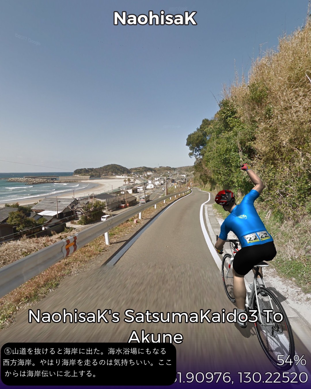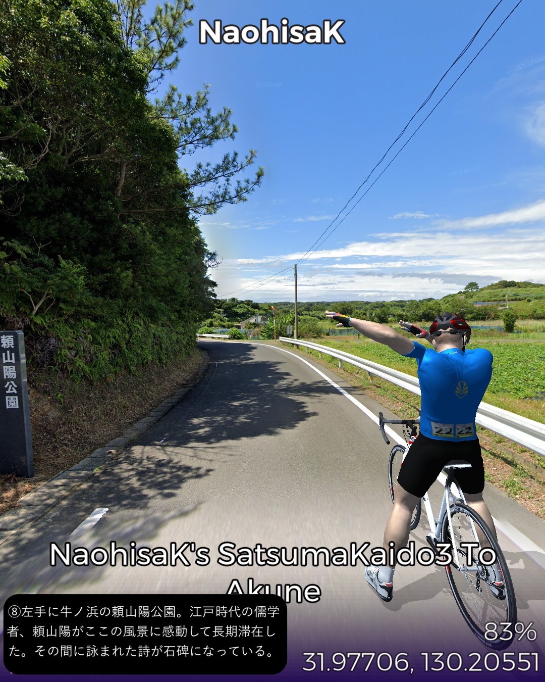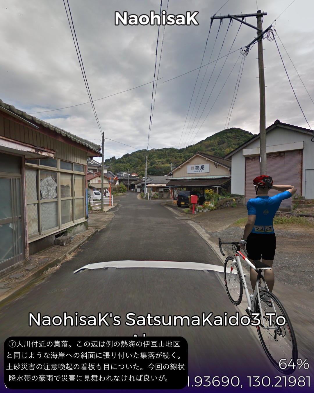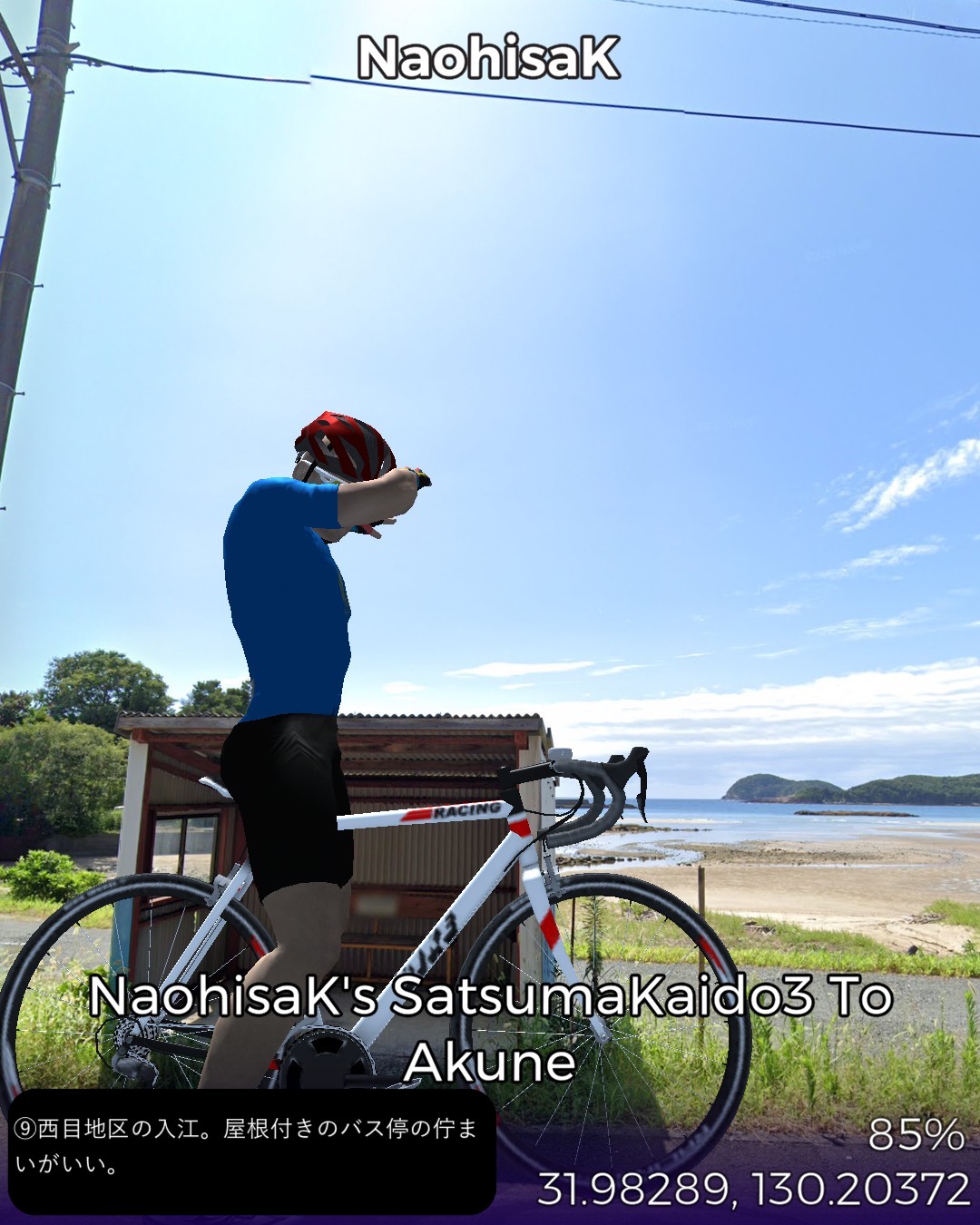 VRサイクリング 薩摩街道3日目 薩摩川内市街に位置する向田宿から前半山道、後半は海沿いに進み次の宿場阿久根宿に至る34kmの行程。後半の海岸風景がしみじみ心に染みる。海沿いは急峻な地形が多いので昔の街道は内陸ルートとなりがちで、こんな島国なのに海を眺めながら歩く箇所は意外なほど少ない。たまにこのように眺望の良い海岸沿いの道の街道筋にあたると気持ちがいい。きっと昔の人も海岸風景に癒されたに違いない。今回のVRサイクリングを実施したタイミングは、リアルにはこの地域に線状降水帯が停滞して豪雨が続き、スタート地点の薩摩川内市街は川内川が氾濫していた時であった。VR上は穏やかな心癒される風景なのにこの落差を生む自然の二面性には平伏するしかない。