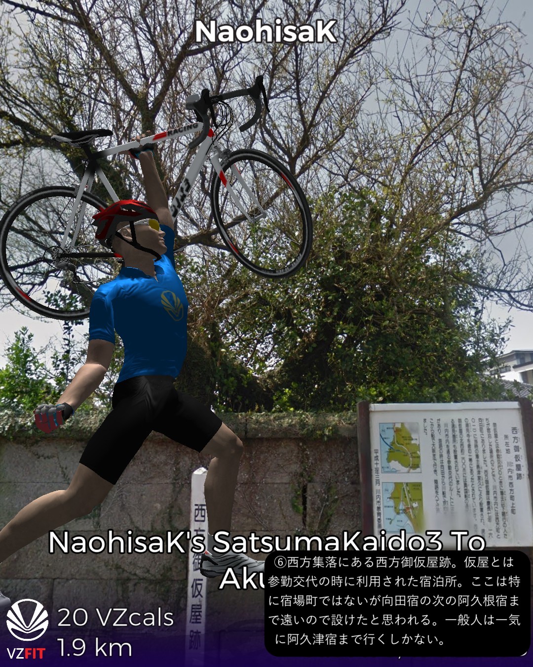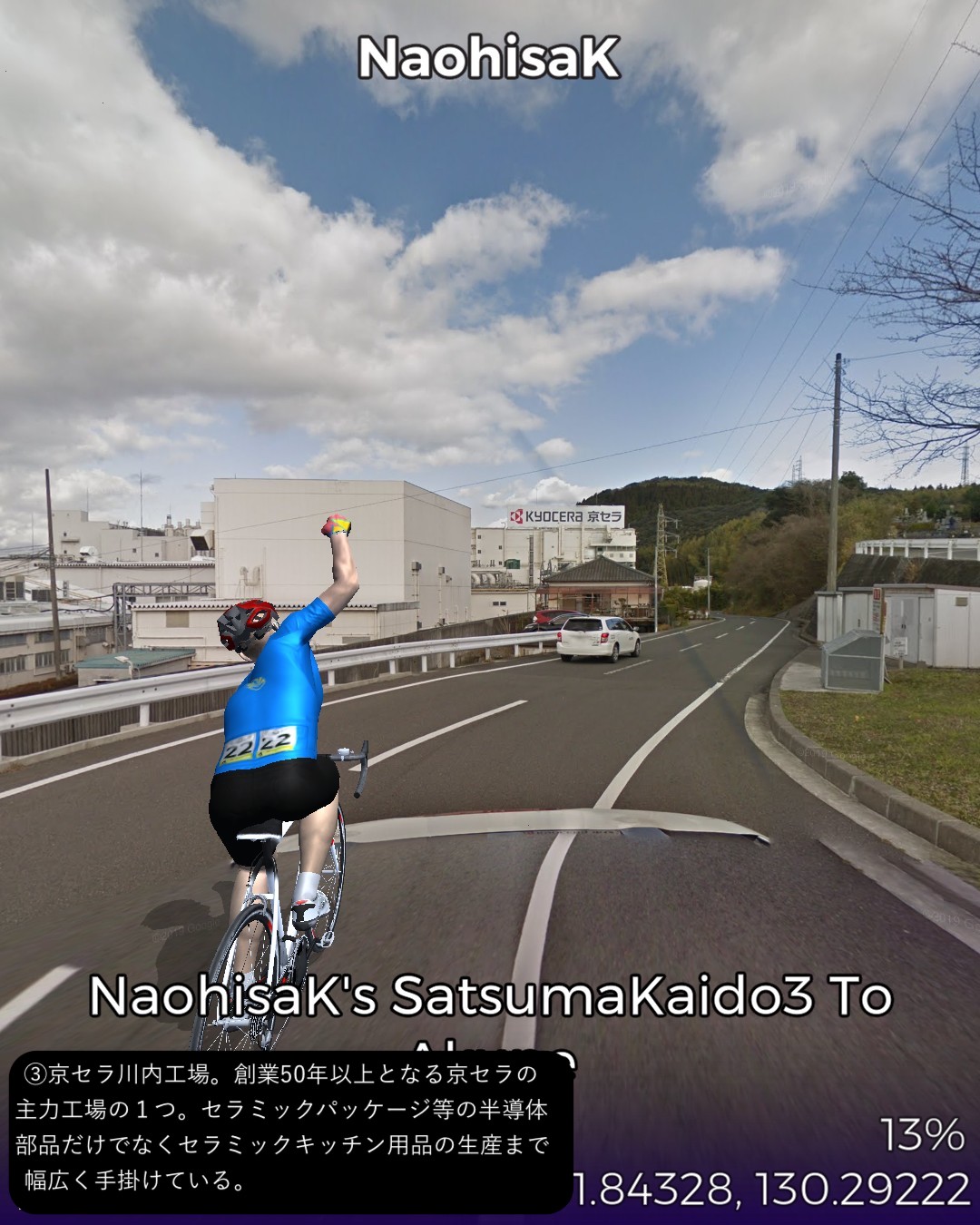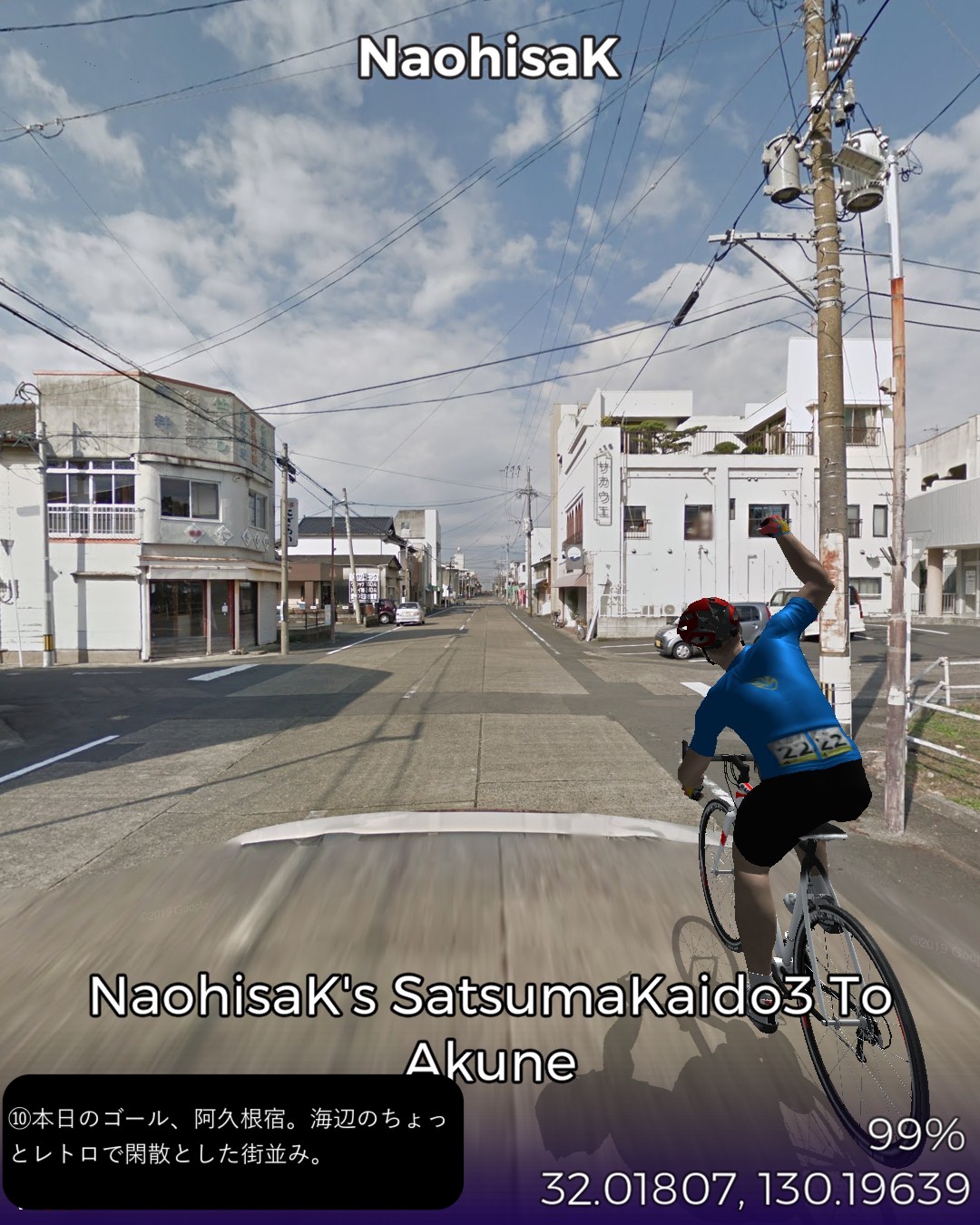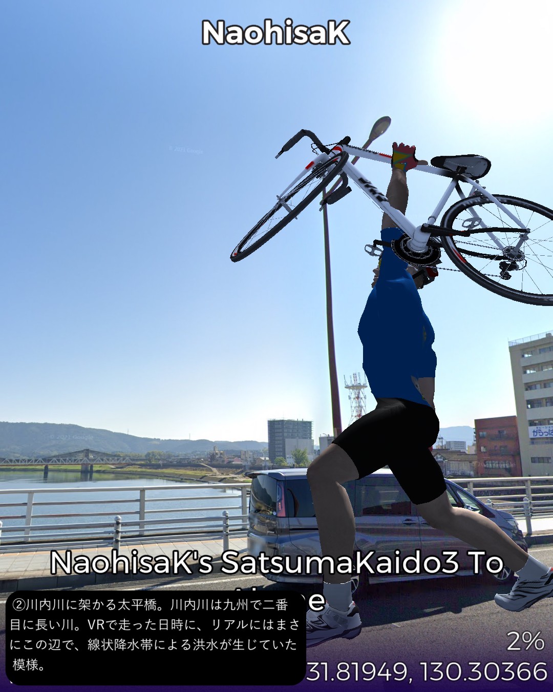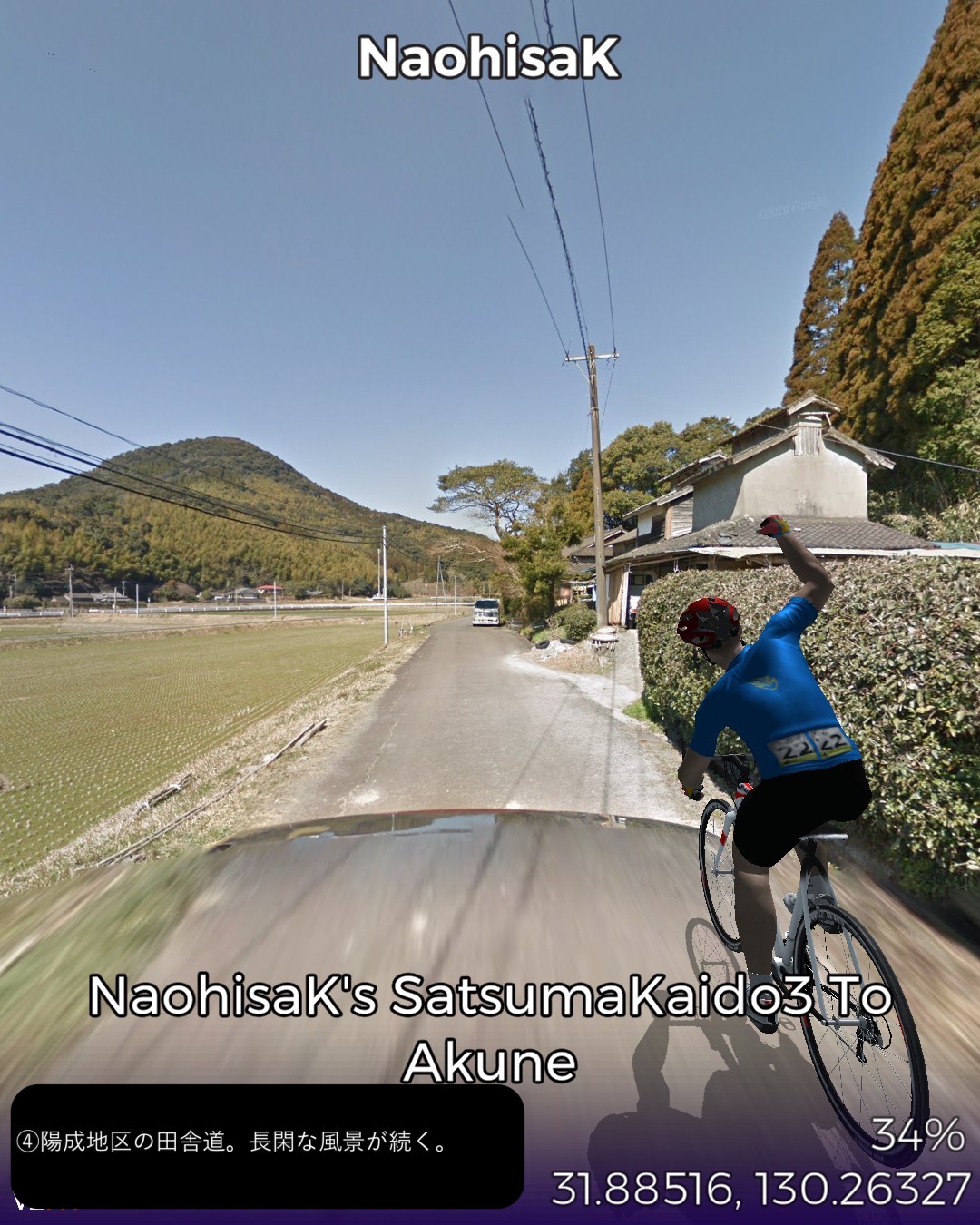 VRサイクリング 薩摩街道3日目 薩摩川内市街に位置する向田宿から前半山道、後半は海沿いに進み次の宿場阿久根宿に至る34kmの行程。後半の海岸風景がしみじみ心に染みる。海沿いは急峻な地形が多いので昔の街道は内陸ルートとなりがちで、こんな島国なのに海を眺めながら歩く箇所は意外なほど少ない。たまにこのように眺望の良い海岸沿いの道の街道筋にあたると気持ちがいい。きっと昔の人も海岸風景に癒されたに違いない。今回のVRサイクリングを実施したタイミングは、リアルにはこの地域に線状降水帯が停滞して豪雨が続き、スタート地点の薩摩川内市街は川内川が氾濫していた時であった。VR上は穏やかな心癒される風景なのにこの落差を生む自然の二面性には平伏するしかない。