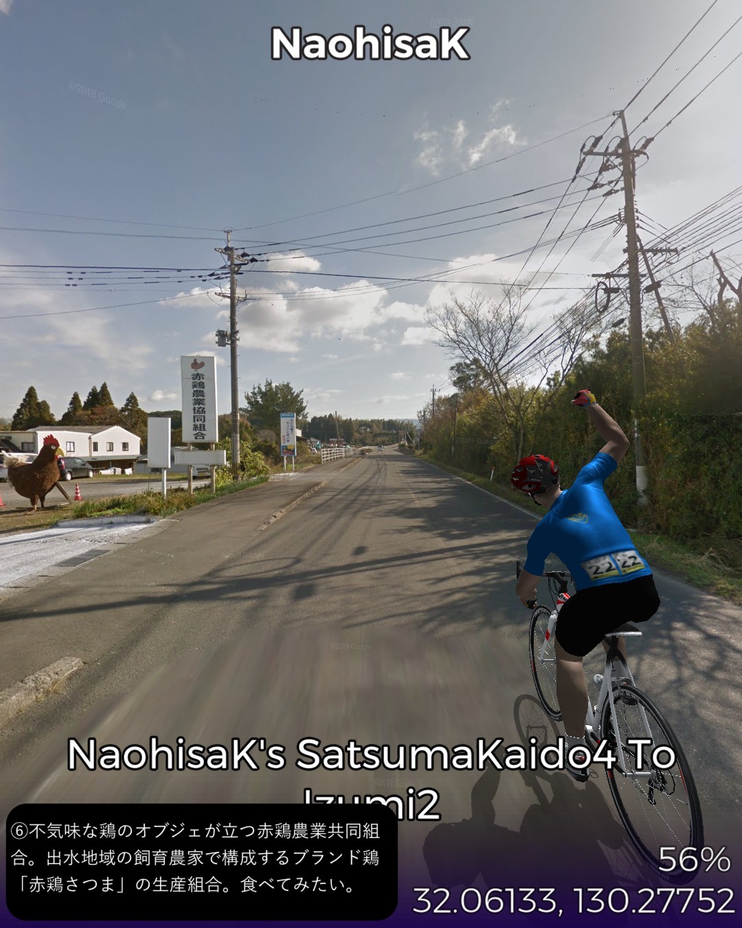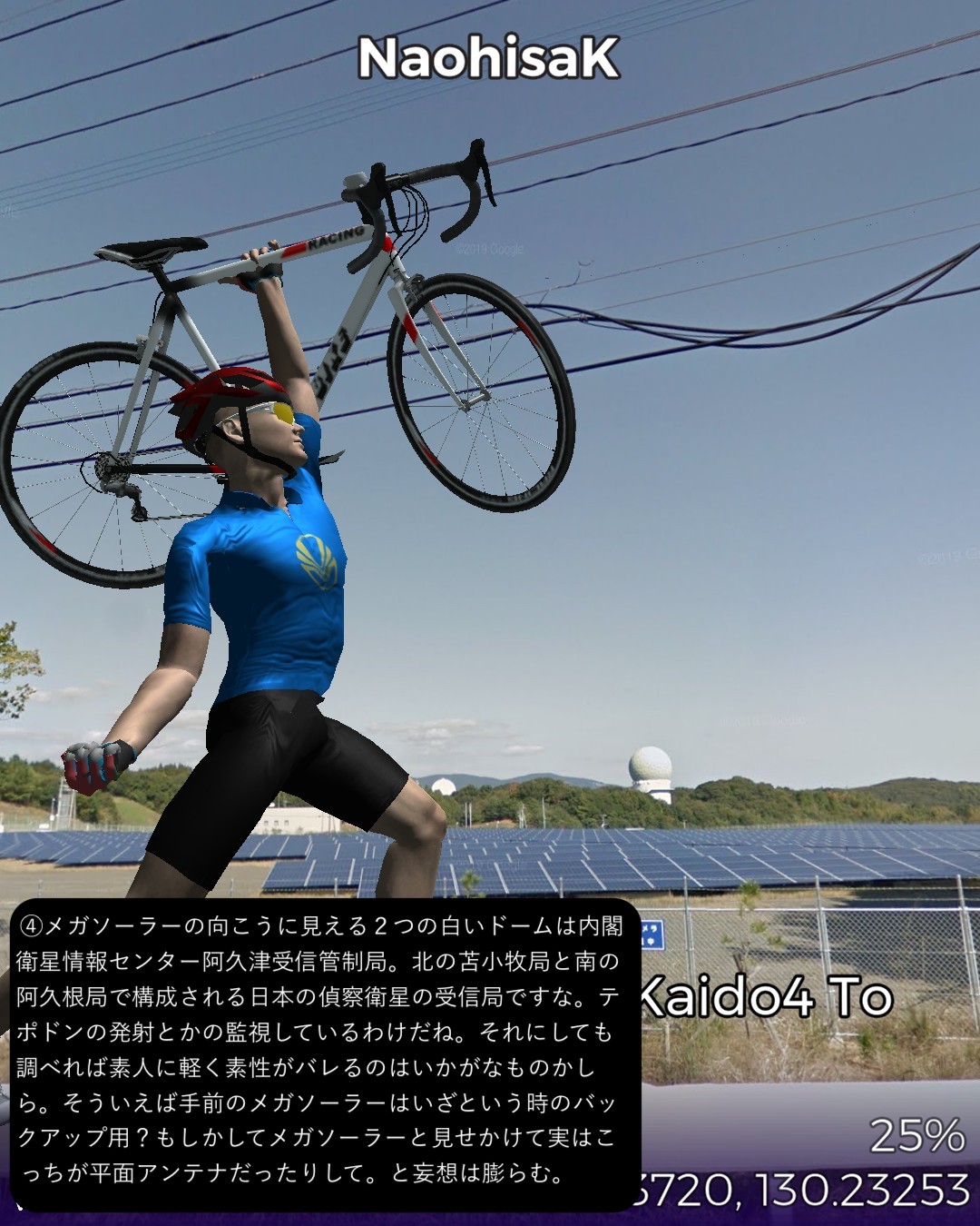 VRサイクリング 薩摩街道4日目。漁業の町阿久根宿から平野が広がり農業畜産業が盛んな出水宿まで21kmの行程。阿久根市の田舎道で見かけた怪しい白いドーム2つ。内閣衛星情報センター阿久根受信管制局。調べると北の北海道苫小牧と南のここ2か所に配置された日本の偵察衛星の基地局だった。ここを経由して北朝鮮のテポドンの発射状況とかを確認しているらしい。それにしても素人が簡単にこういう事実を調べられるというのはセキュリティ上いかがなものだろうか。ところで江戸時代の薩摩藩には外城制度というユニークな社会制度があった。人口の1/4を占める武士の大半は城下町に住まず、藩内に散らばって各地で武家屋敷群を建てて住み、平常時は農業を営んでいた。戦時には武士団として機能して地域の防衛にあたる。なんと合理的で賢い戦略だろうか。そうした強靭な社会基盤も明治維新への革命を起こす原動力になったに違いない。本日のルートの途中の野田郷とゴールの出水の2か所にその社会制度の名残の武家屋敷群が街道沿いに残っていた。薩摩の国境に近いこともあり防衛上重要な地域ということもあったようだ。