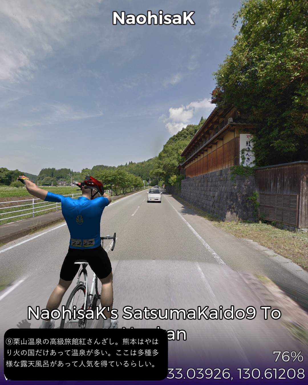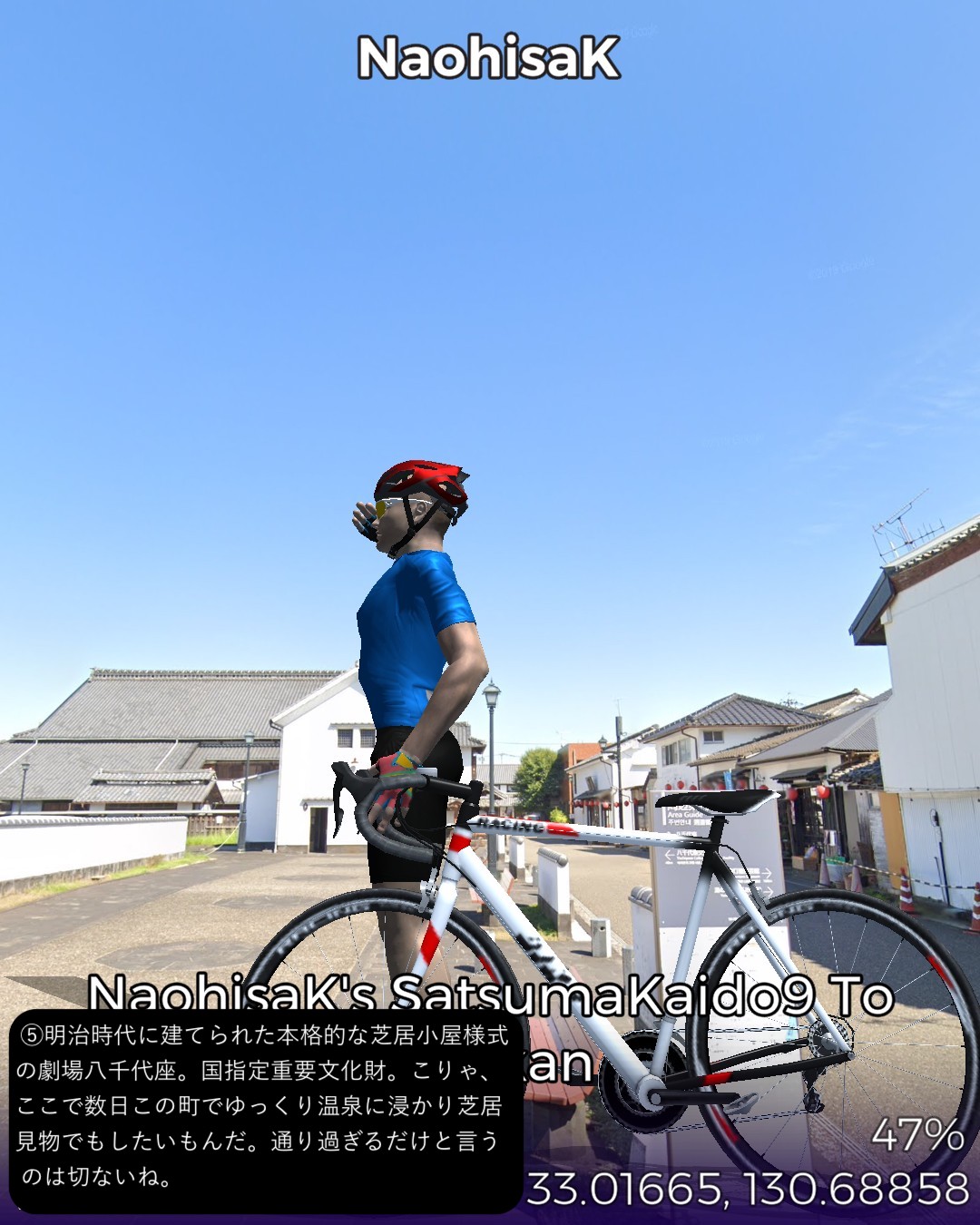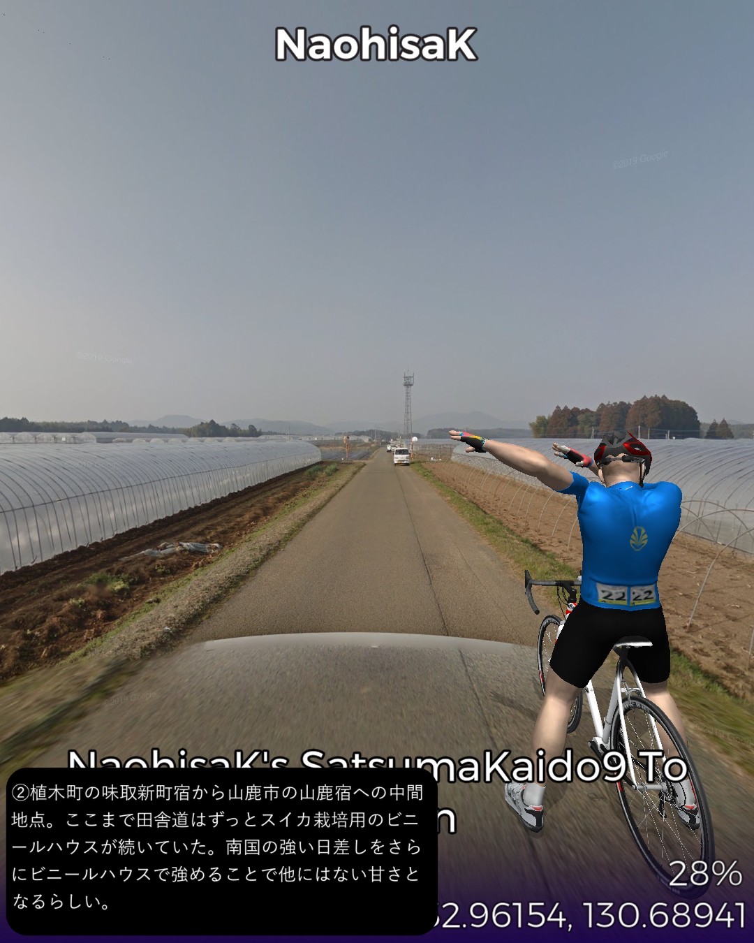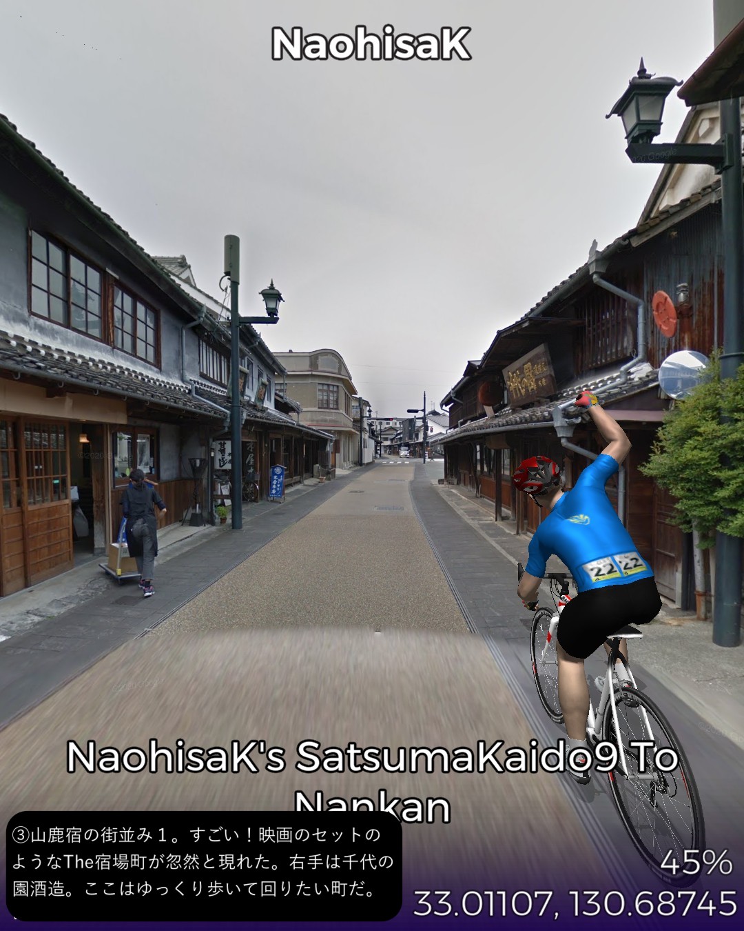 VRサイクリング 薩摩街道9日目。日本一のスイカ産地植木(熊本市北区)の味取新町宿から殿様の温泉地山鹿宿を経て福岡県境あるいは筑後国境に近い南関宿まで、熊本県北部を攻めていく36kmの行程。植木から山鹿まではスイカ栽培のハウス群をすり抜けてゆく田舎道。右手には遠く阿蘇の連山が霞んでいる。山鹿という町の名は聞いたことがあったがこんな素敵な観光地だとは知らなかった。肥後の藩主細川氏が好んだ温泉地として旅館ホテルだけでなく格式ある千と千尋の神隠しに出てくるような立ち寄り湯があったり、江戸時代風の大きな芝居小屋もあるレトロな雰囲気が横溢した町なのだ。しかも豊後街道の宿場町というコンセプトを観光のポイントにしているらしく、街道沿いは映画のセットのような古い商家が立ち並んでいて誠にムードがよろしい。旅館ホテル街もどこかにあると思うが街道沿いはそぞろ歩きに適した雰囲気に徹している。いいですねえ。しばらくここで長逗留したい気分を抑えて後ろ髪を引かれつつ先に進む。いずれリアルに訪ねたい町が1つ増えた。その先も日本歴史の道にノミネートされた西南戦争の古戦場のある地帯など古い街道風景が楽しめる田舎道をズンズン進み県境の町、南関宿にたどり着いた。期待していなかったが思いの他充実したサイクリングルートであった。