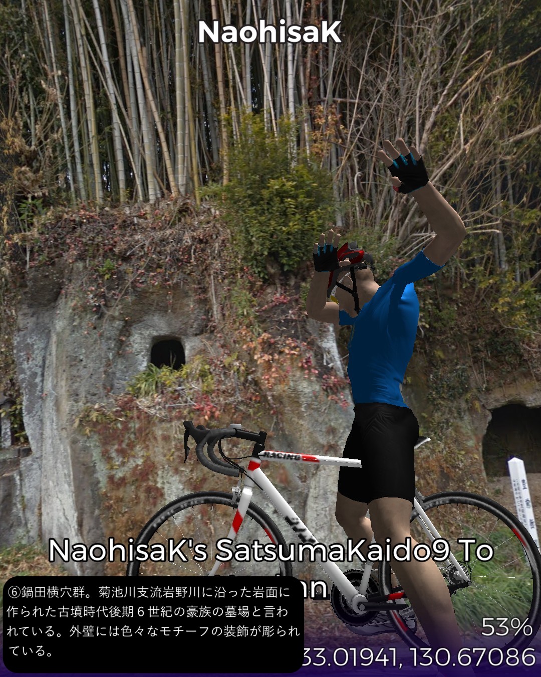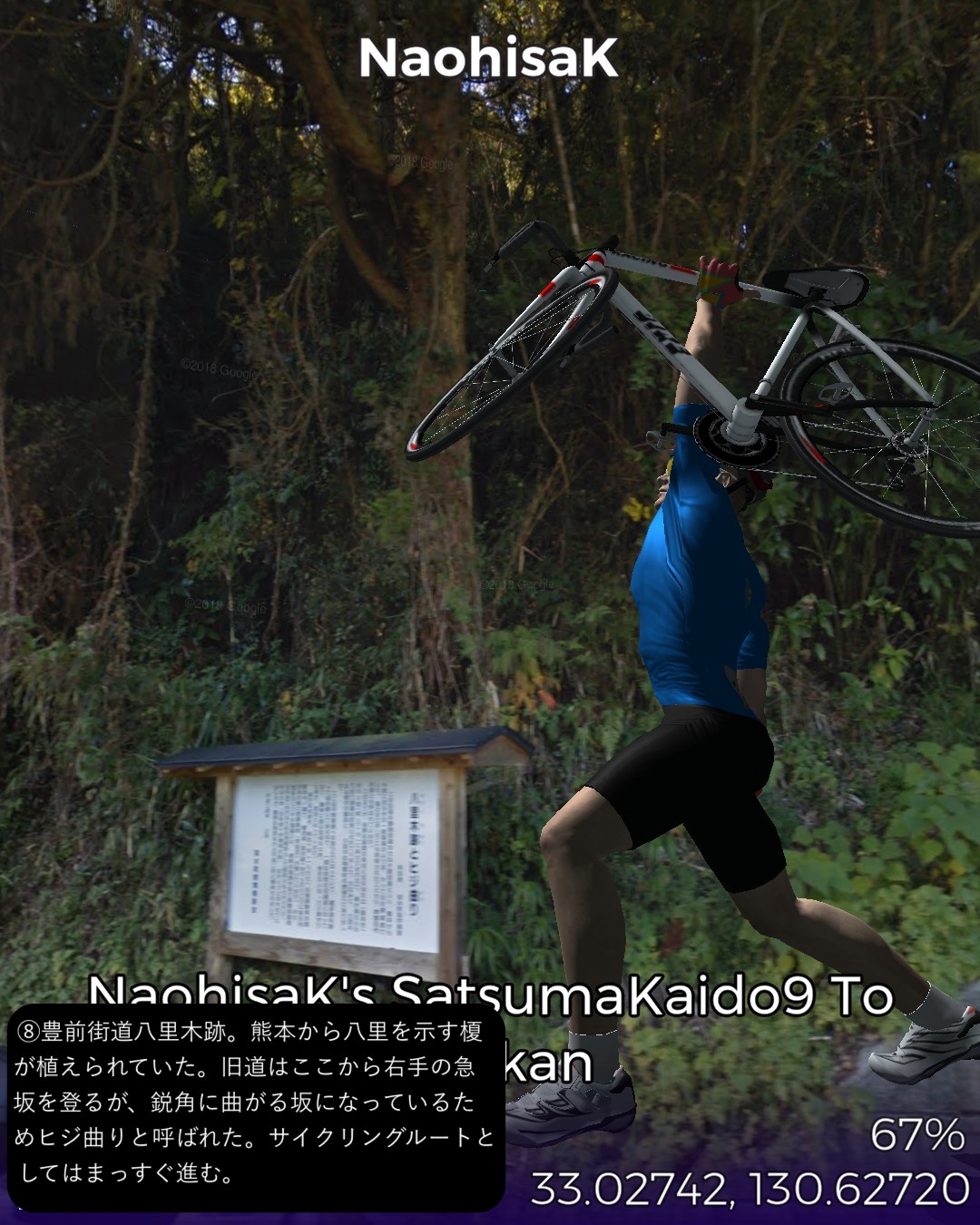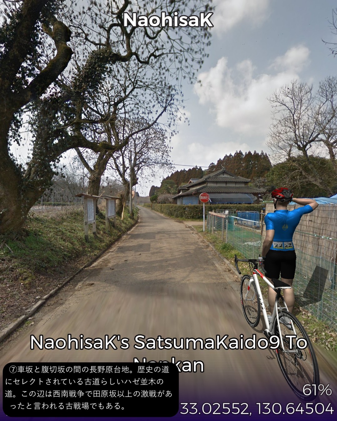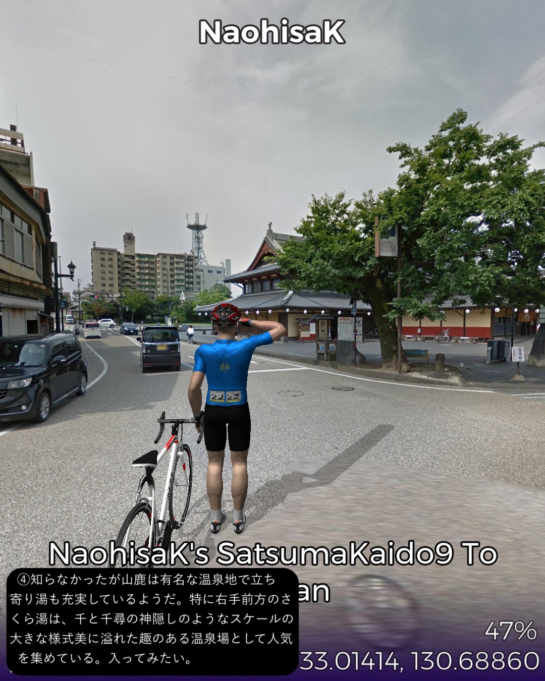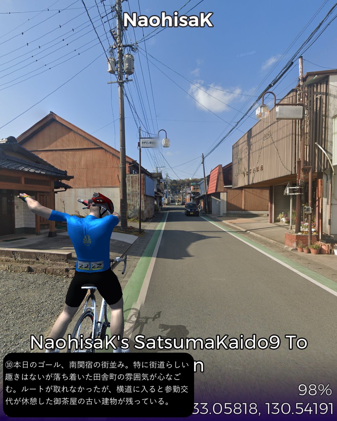 VRサイクリング 薩摩街道9日目。日本一のスイカ産地植木(熊本市北区)の味取新町宿から殿様の温泉地山鹿宿を経て福岡県境あるいは筑後国境に近い南関宿まで、熊本県北部を攻めていく36kmの行程。植木から山鹿まではスイカ栽培のハウス群をすり抜けてゆく田舎道。右手には遠く阿蘇の連山が霞んでいる。山鹿という町の名は聞いたことがあったがこんな素敵な観光地だとは知らなかった。肥後の藩主細川氏が好んだ温泉地として旅館ホテルだけでなく格式ある千と千尋の神隠しに出てくるような立ち寄り湯があったり、江戸時代風の大きな芝居小屋もあるレトロな雰囲気が横溢した町なのだ。しかも豊後街道の宿場町というコンセプトを観光のポイントにしているらしく、街道沿いは映画のセットのような古い商家が立ち並んでいて誠にムードがよろしい。旅館ホテル街もどこかにあると思うが街道沿いはそぞろ歩きに適した雰囲気に徹している。いいですねえ。しばらくここで長逗留したい気分を抑えて後ろ髪を引かれつつ先に進む。いずれリアルに訪ねたい町が1つ増えた。その先も日本歴史の道にノミネートされた西南戦争の古戦場のある地帯など古い街道風景が楽しめる田舎道をズンズン進み県境の町、南関宿にたどり着いた。期待していなかったが思いの他充実したサイクリングルートであった。