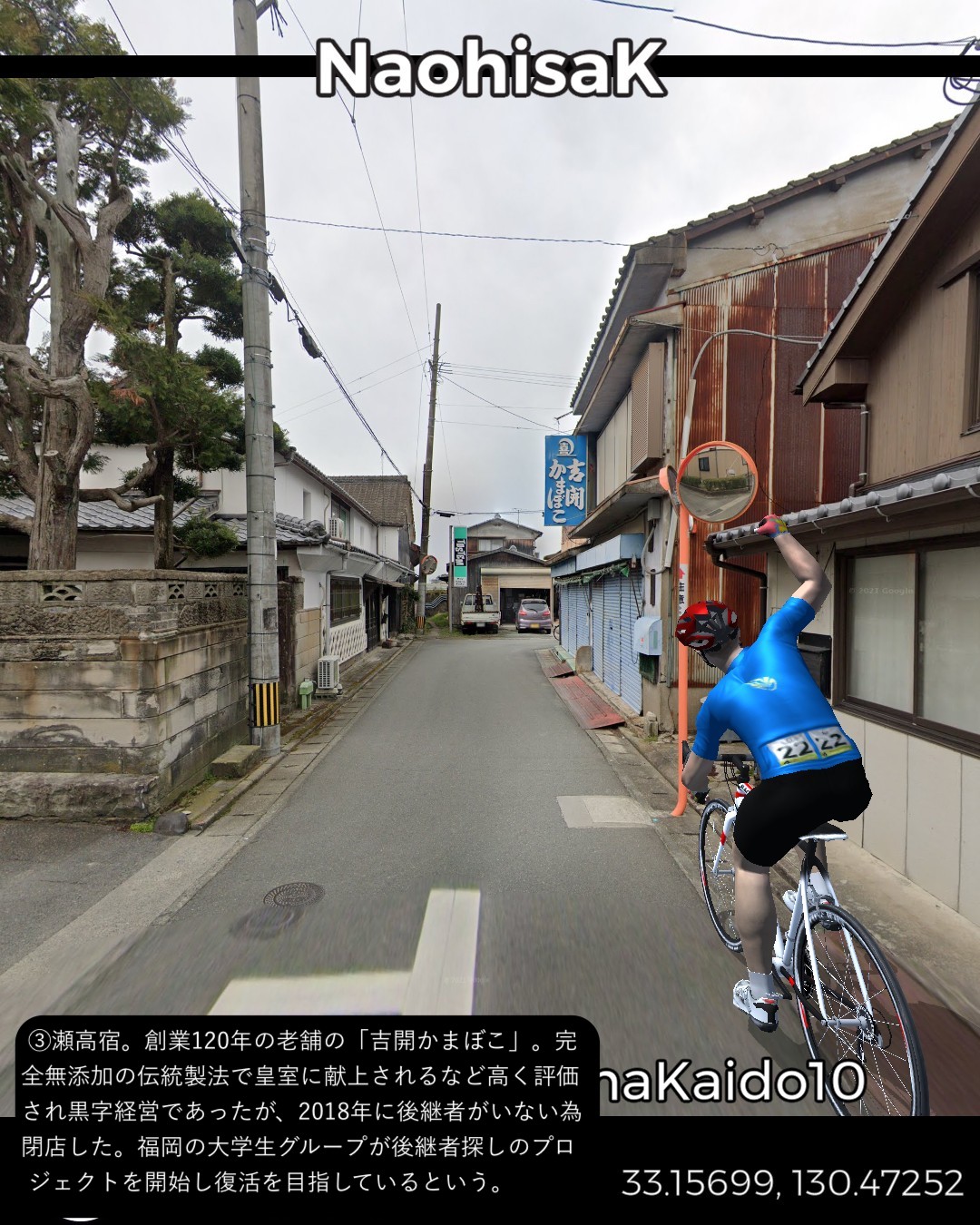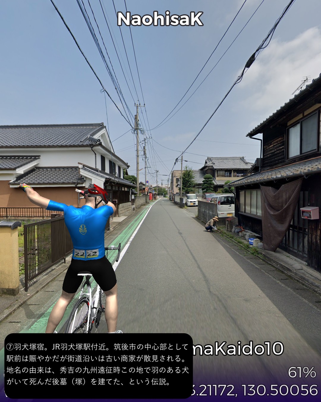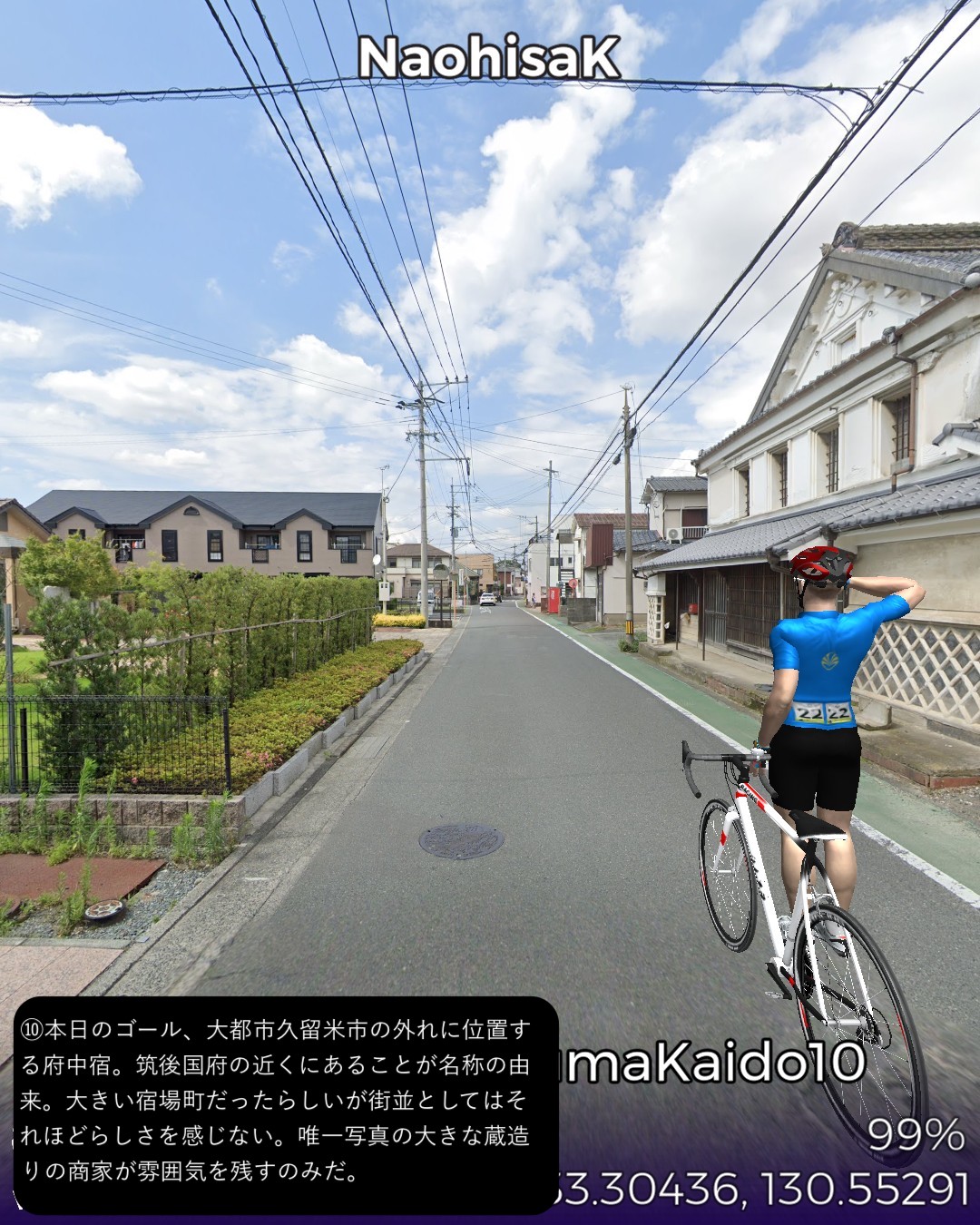 VRサイクリング 薩摩街道10日目。 熊本県北端の町南関宿をスタートし、県境の峠を超えてだだっ広い筑後平野に出て、原町宿、瀬高宿、羽犬塚宿と比較的短いインターバルの宿場を通り過ぎて、福岡県で福岡市、北九州市に次ぐ都市久留米市の市街地から若干外れた府中宿をゴールとする38kmの行程。福岡に住んでいた子供の頃、熊本へドライブに行くことになって、まだ高速道路もない頃、国道を通って県境の峠を越えようとしたところで車が故障し、親父が悪戦苦闘したことを思い出す。結局地元の修理工場を探し出してそこに修理してもらうのをボーッと待って熊本へ行けずそのまま帰宅した残念なエピソードであったが、それが多分この辺じゃなかったかと想像しつつ、肥後の国から筑後の国に入った。山が多い九州においては筑紫平野は格別に広く感じる。いくつか通過した宿場では瀬高宿が古い商家がしっとりとした旧街道筋に佇んでいる雰囲気が感じられて良かった。ゴールの府中宿は、久留米ラーメン、松田聖子、チェッカーズの故郷久留米市の比較的外れにあるので、市街地の喧騒はなく、長閑な街並みであった。昔の筑後の国府が置かれていた場所から府中宿と呼ばれていたようだ。次回はいよいよ薩摩街道の終点に到達する予定。