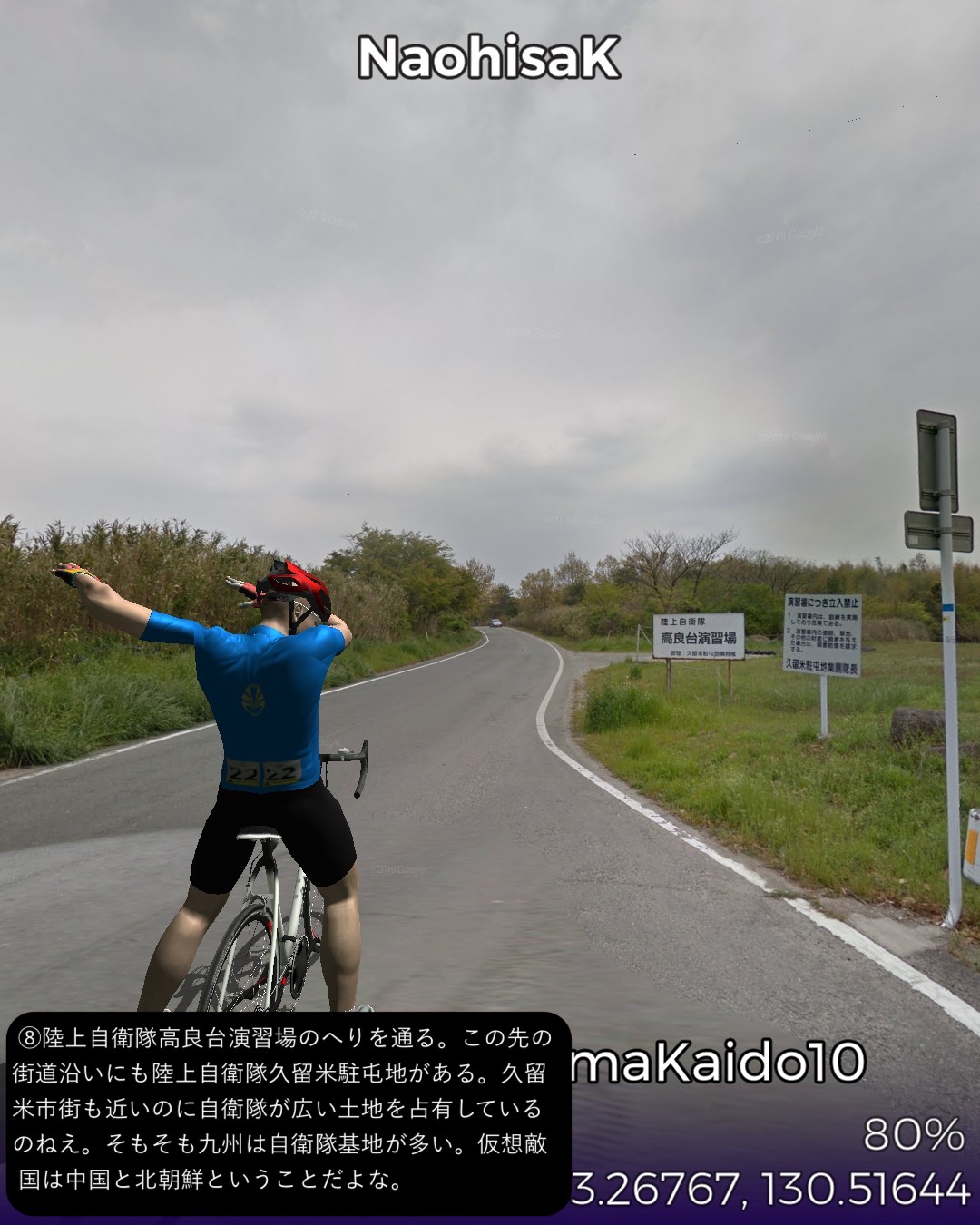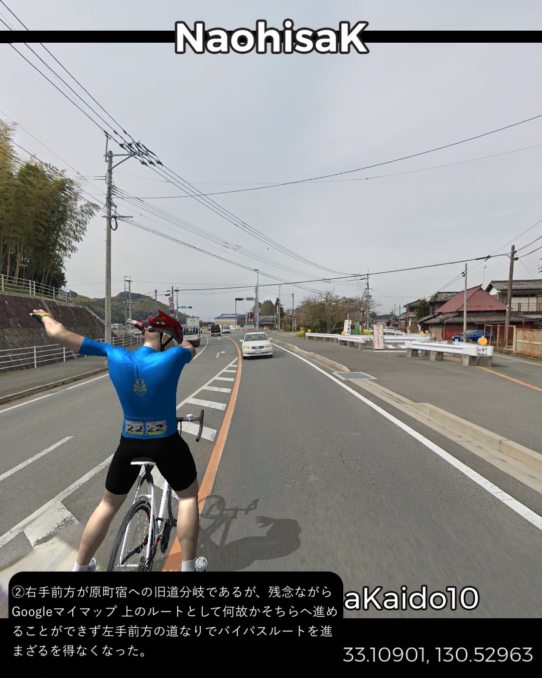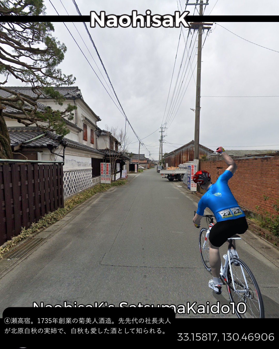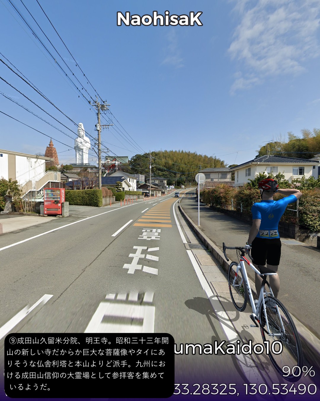 VRサイクリング 薩摩街道10日目。 熊本県北端の町南関宿をスタートし、県境の峠を超えてだだっ広い筑後平野に出て、原町宿、瀬高宿、羽犬塚宿と比較的短いインターバルの宿場を通り過ぎて、福岡県で福岡市、北九州市に次ぐ都市久留米市の市街地から若干外れた府中宿をゴールとする38kmの行程。福岡に住んでいた子供の頃、熊本へドライブに行くことになって、まだ高速道路もない頃、国道を通って県境の峠を越えようとしたところで車が故障し、親父が悪戦苦闘したことを思い出す。結局地元の修理工場を探し出してそこに修理してもらうのをボーッと待って熊本へ行けずそのまま帰宅した残念なエピソードであったが、それが多分この辺じゃなかったかと想像しつつ、肥後の国から筑後の国に入った。山が多い九州においては筑紫平野は格別に広く感じる。いくつか通過した宿場では瀬高宿が古い商家がしっとりとした旧街道筋に佇んでいる雰囲気が感じられて良かった。ゴールの府中宿は、久留米ラーメン、松田聖子、チェッカーズの故郷久留米市の比較的外れにあるので、市街地の喧騒はなく、長閑な街並みであった。昔の筑後の国府が置かれていた場所から府中宿と呼ばれていたようだ。次回はいよいよ薩摩街道の終点に到達する予定。