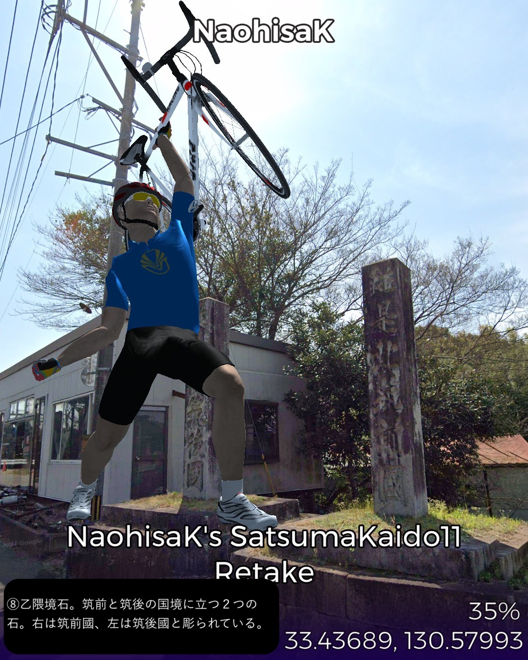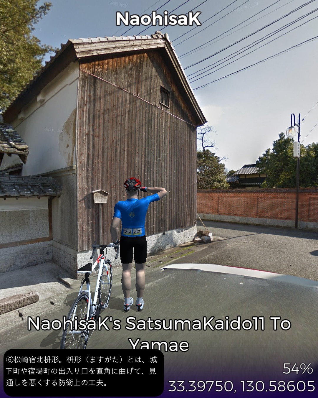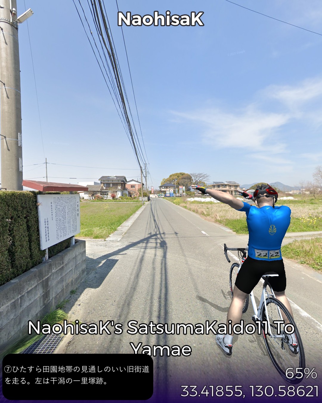 VRサイクリング 薩摩街道11日目 久留米市街の外れにある府中宿をスタートして、今日もだだっ広い筑紫平野をズンズン進み薩摩街道最後の宿場、松崎宿を経て、薩摩街道終点となる山家宿の長崎街道追分まで25kmの行程。本日のルートはほぼ旧道の長閑な田舎道を走る。途中の松崎宿は江戸時代の建造物の旅籠が残り、家並も旧街道の宿場らしい雰囲気に満ちて薩摩街道フィナーレを飾る宿場にふさわしい。南北の入口出口にはそれぞれ構口(かまえぐち)という石垣が残り、またその内側には防衛上の配慮から桝形(ますがた)と呼ばれる直角に曲がるクランクが組まれている。完全無欠な宿場町だ。ゴールは筑紫平野の北端、筑豊地域と隔てる山々が近づいてきた山家宿。3/10に通過した長崎街道との接点、いわゆる追分に戻ってきたことになる。九州のほぼ海岸沿いを時計回りに1周してきたわけだ。さてこれからどこへ進むか。次回のお楽しみ。