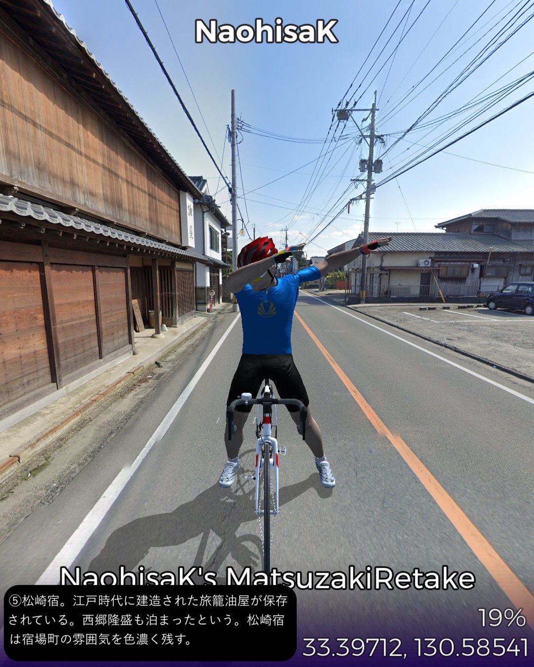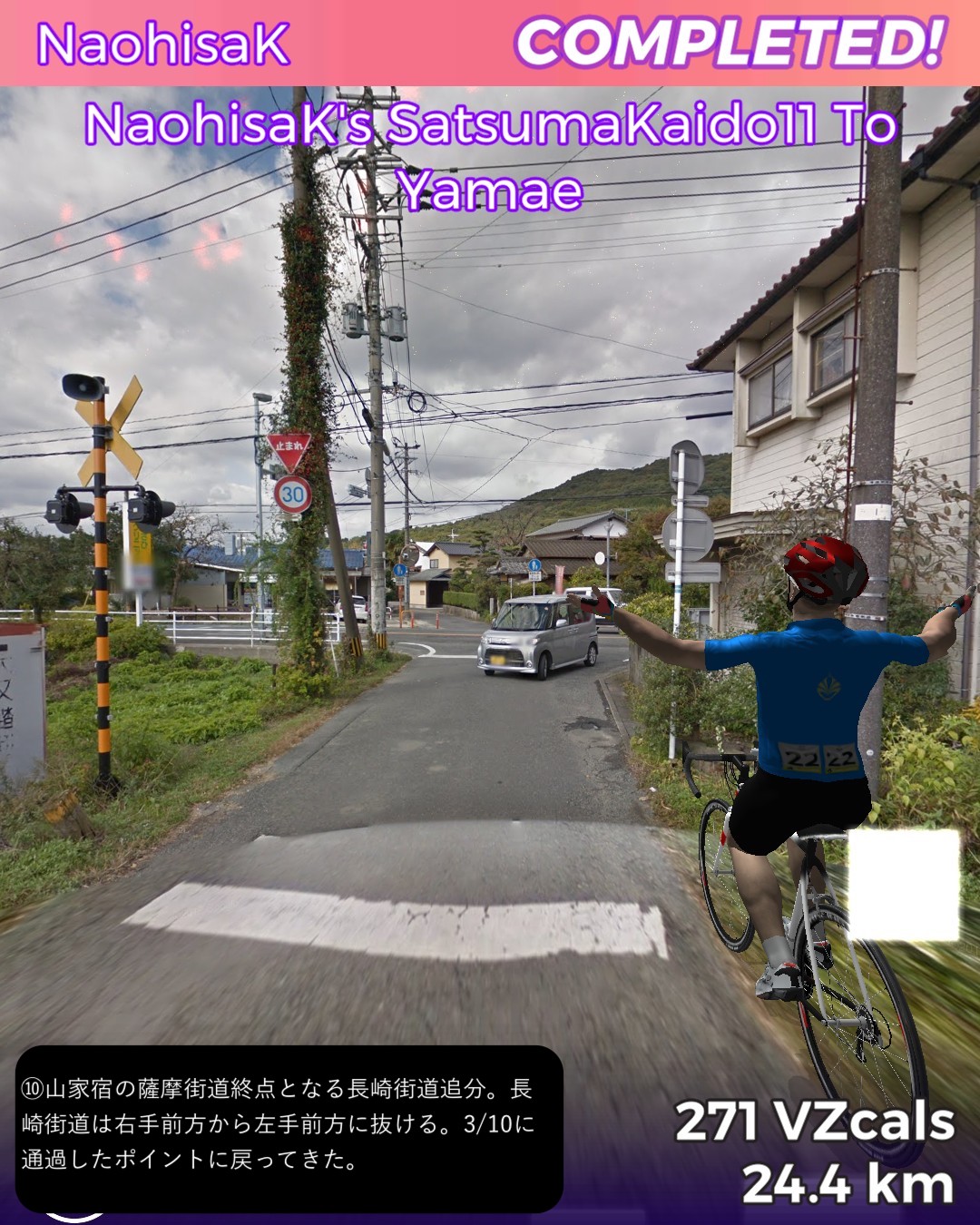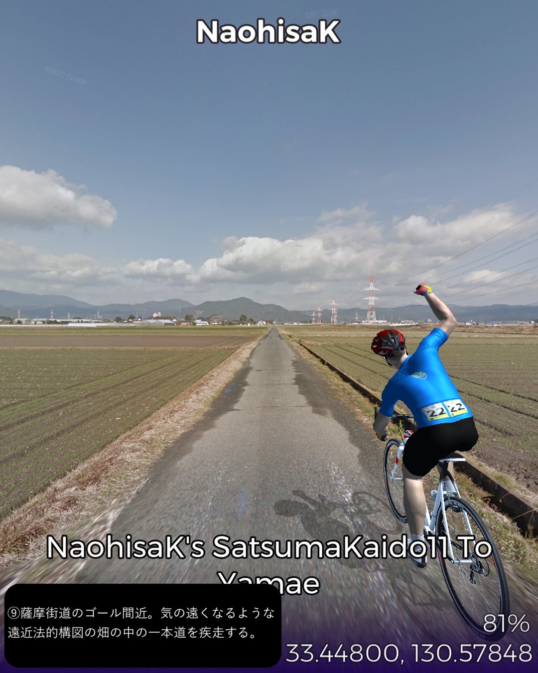 VRサイクリング 薩摩街道11日目 久留米市街の外れにある府中宿をスタートして、今日もだだっ広い筑紫平野をズンズン進み薩摩街道最後の宿場、松崎宿を経て、薩摩街道終点となる山家宿の長崎街道追分まで25kmの行程。本日のルートはほぼ旧道の長閑な田舎道を走る。途中の松崎宿は江戸時代の建造物の旅籠が残り、家並も旧街道の宿場らしい雰囲気に満ちて薩摩街道フィナーレを飾る宿場にふさわしい。南北の入口出口にはそれぞれ構口(かまえぐち)という石垣が残り、またその内側には防衛上の配慮から桝形(ますがた)と呼ばれる直角に曲がるクランクが組まれている。完全無欠な宿場町だ。ゴールは筑紫平野の北端、筑豊地域と隔てる山々が近づいてきた山家宿。3/10に通過した長崎街道との接点、いわゆる追分に戻ってきたことになる。九州のほぼ海岸沿いを時計回りに1周してきたわけだ。さてこれからどこへ進むか。次回のお楽しみ。