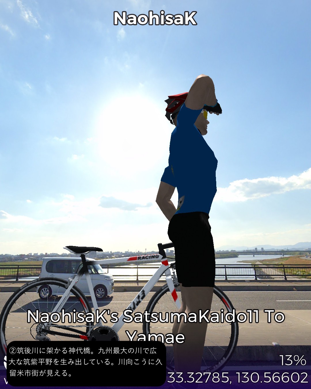 VRサイクリング 薩摩街道8日目 城下町宇土宿をスタートし、川沿い…