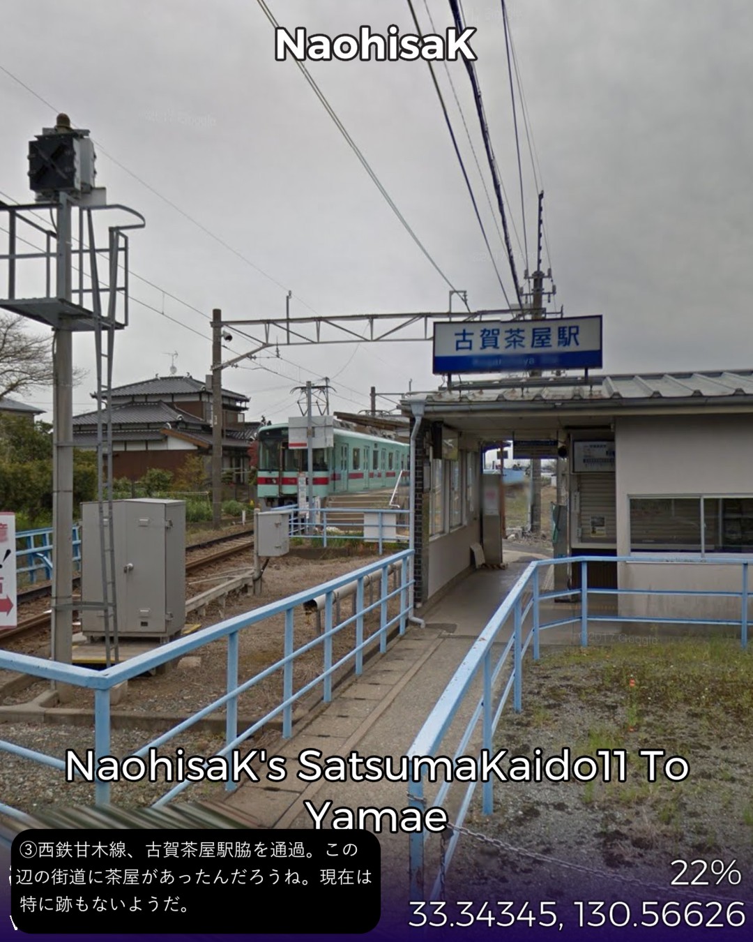 VRサイクリング 薩摩街道11日目 久留米市街の外れにある府中宿をスタートして、今日もだだっ広い筑紫平野をズンズン進み薩摩街道最後の宿場、松崎宿を経て、薩摩街道終点となる山家宿の長崎街道追分まで25kmの行程。本日のルートはほぼ旧道の長閑な田舎道を走る。途中の松崎宿は江戸時代の建造物の旅籠が残り、家並も旧街道の宿場らしい雰囲気に満ちて薩摩街道フィナーレを飾る宿場にふさわしい。南北の入口出口にはそれぞれ構口(かまえぐち)という石垣が残り、またその内側には防衛上の配慮から桝形(ますがた)と呼ばれる直角に曲がるクランクが組まれている。完全無欠な宿場町だ。ゴールは筑紫平野の北端、筑豊地域と隔てる山々が近づいてきた山家宿。3/10に通過した長崎街道との接点、いわゆる追分に戻ってきたことになる。九州のほぼ海岸沿いを時計回りに1周してきたわけだ。さてこれからどこへ進むか。次回のお楽しみ。