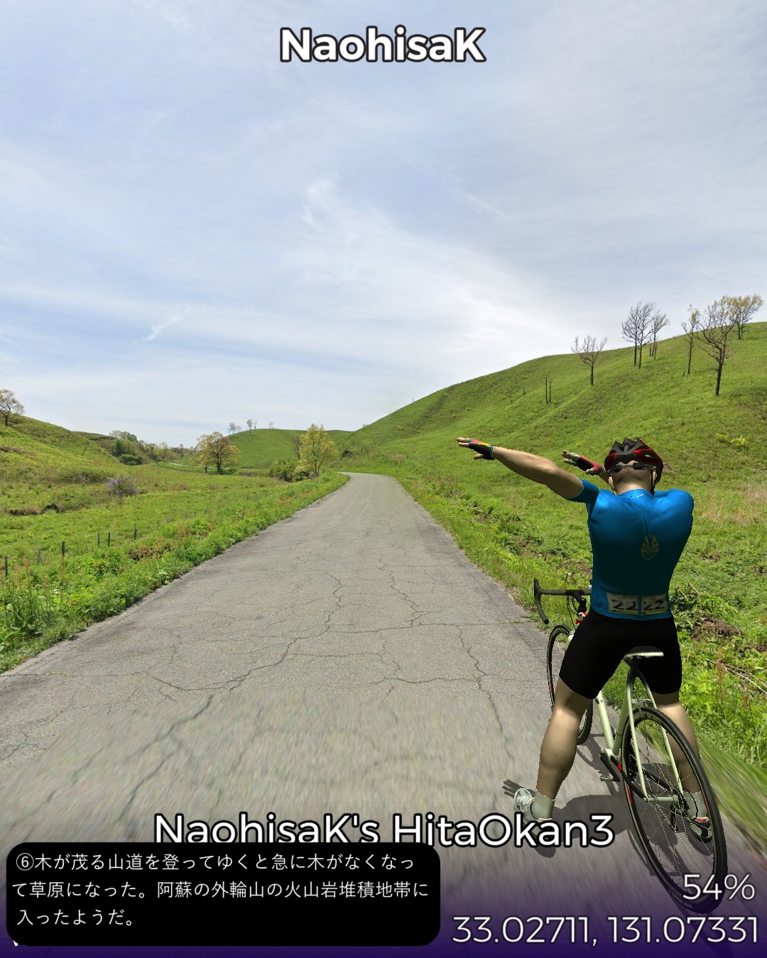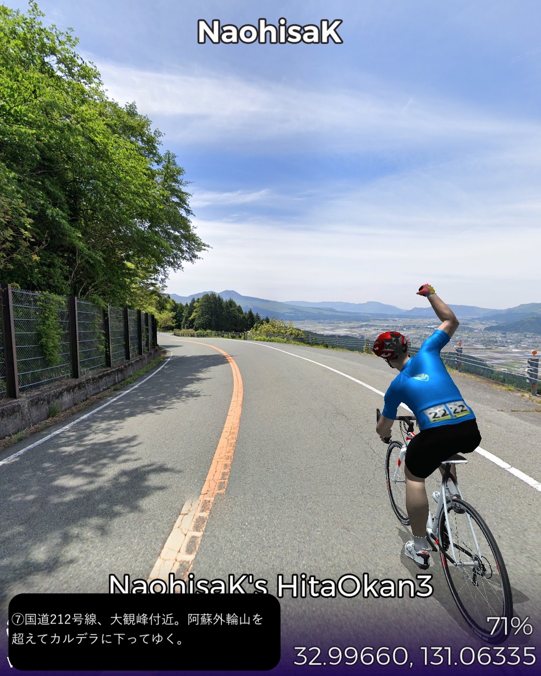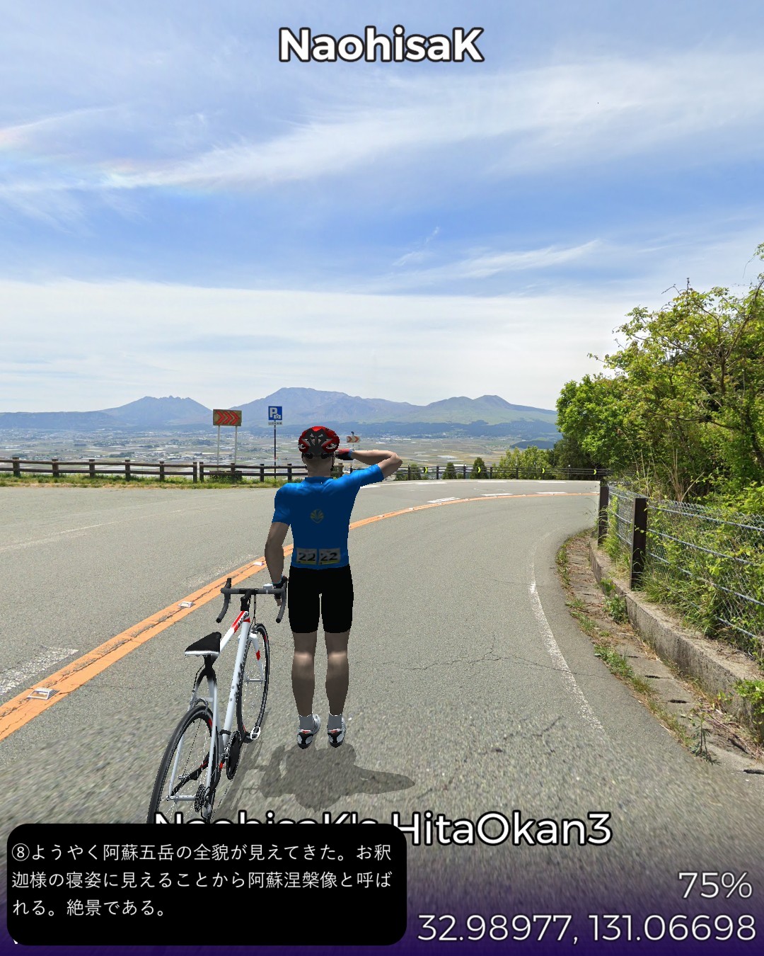 VRサイクリング 日田往還3日目。我が家のルーツの土地北里集落をスタートし、小国町の中心宮原地区を通り南方へ進み、南小国町の通称そば街道を通って阿蘇外輪山を越えて、阿蘇カルデラに位置する内牧宿まで32kmの行程。宮原地区も伯母一家が住んでいたことからわが北里家に縁のある土地だが、訪れたことはないので土地勘はない。でも山に囲まれて渓流が流れ、古い街並が残る雰囲気のいい町だと初めて認識した。日田往還の阿蘇に向かう街道はほぼ国道212号沿いというだけで詳細情報がないのだが多分この宮原地区が宿場だったと思われる。南小国町で国道から分岐して国道と並行する通称そば街道を通ることにした。雰囲気のあるそば屋が六軒ほど点在するのでその通称を得ているが、まさにこちらが多分日田往還の旧街道だったのではないかと推測する。外輪山を登ってゆくと途中から火山特有の草原地帯に変わり、外輪山の稜線まで登ると雄大な阿蘇五岳と広大なカルデラの絶景が広がる。これが九州のクライマックスかな。カルデラ側に山道を下るとまもなく本日のゴール、田園の中の温泉場の宿場内牧宿に着く。次回はここから大分方面に向けて豊後街道を進むこととする。