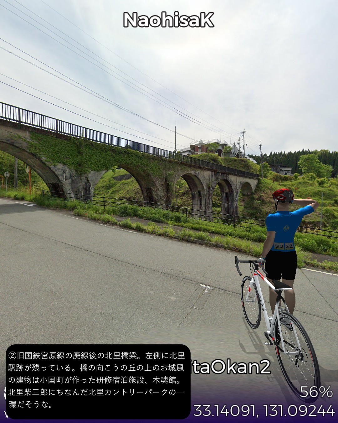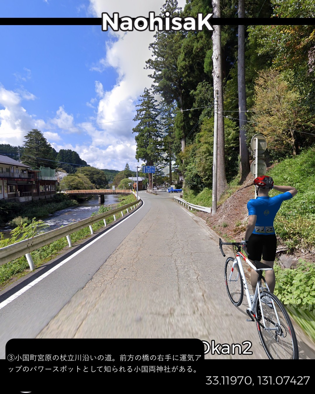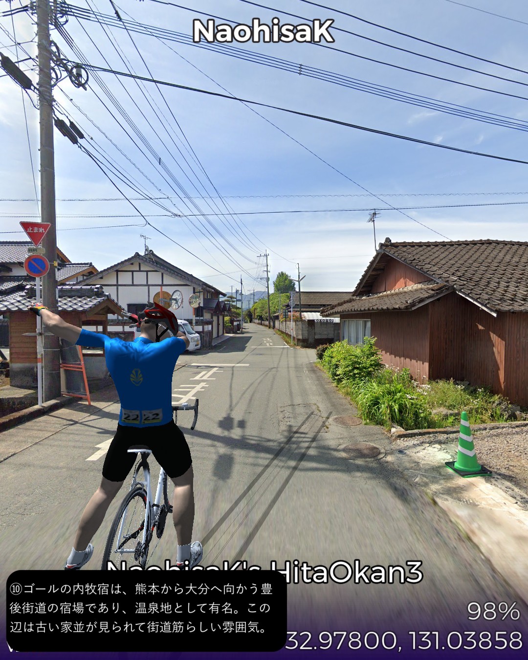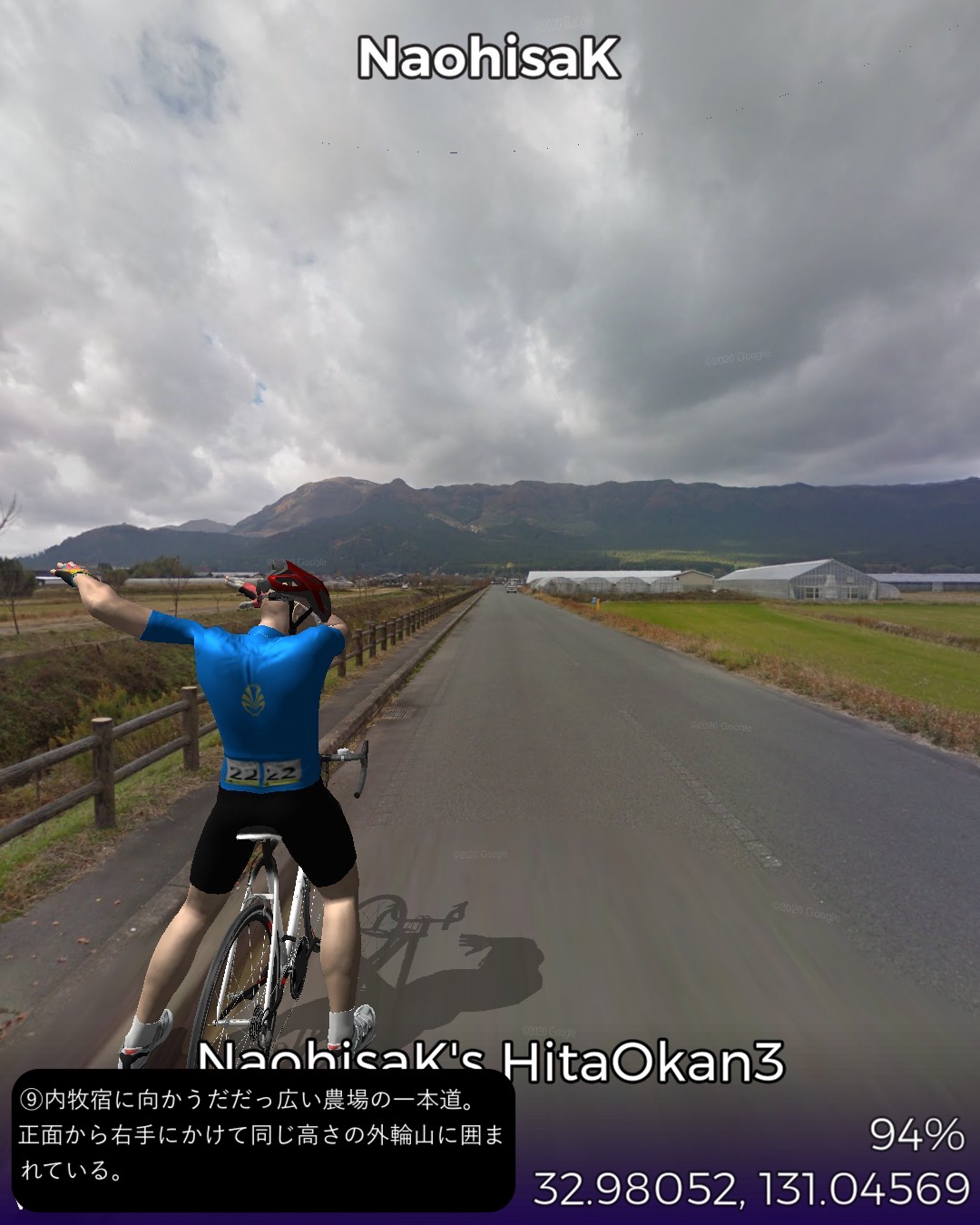 VRサイクリング 日田往還3日目。我が家のルーツの土地北里集落をスタートし、小国町の中心宮原地区を通り南方へ進み、南小国町の通称そば街道を通って阿蘇外輪山を越えて、阿蘇カルデラに位置する内牧宿まで32kmの行程。宮原地区も伯母一家が住んでいたことからわが北里家に縁のある土地だが、訪れたことはないので土地勘はない。でも山に囲まれて渓流が流れ、古い街並が残る雰囲気のいい町だと初めて認識した。日田往還の阿蘇に向かう街道はほぼ国道212号沿いというだけで詳細情報がないのだが多分この宮原地区が宿場だったと思われる。南小国町で国道から分岐して国道と並行する通称そば街道を通ることにした。雰囲気のあるそば屋が六軒ほど点在するのでその通称を得ているが、まさにこちらが多分日田往還の旧街道だったのではないかと推測する。外輪山を登ってゆくと途中から火山特有の草原地帯に変わり、外輪山の稜線まで登ると雄大な阿蘇五岳と広大なカルデラの絶景が広がる。これが九州のクライマックスかな。カルデラ側に山道を下るとまもなく本日のゴール、田園の中の温泉場の宿場内牧宿に着く。次回はここから大分方面に向けて豊後街道を進むこととする。