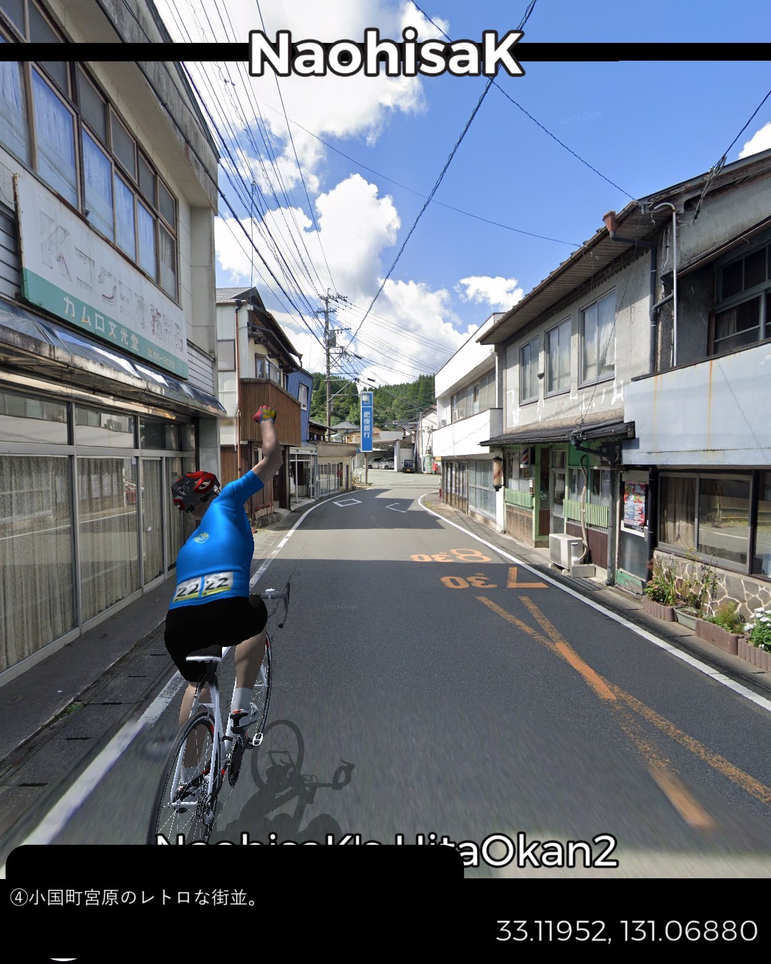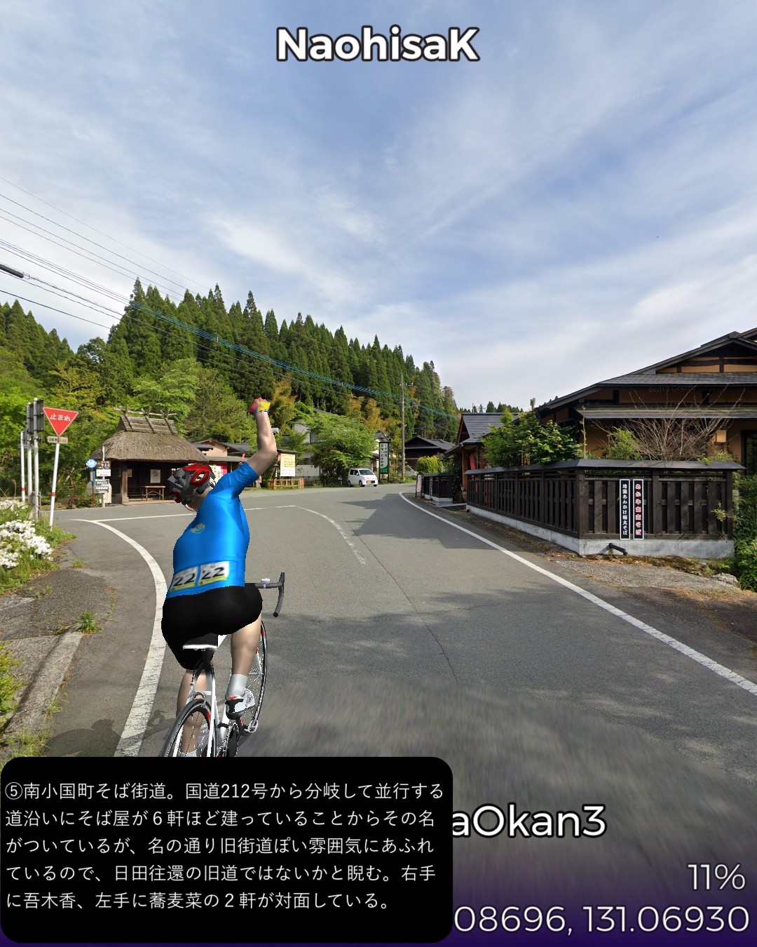 VRサイクリング 日田往還3日目。我が家のルーツの土地北里集落をスタートし、小国町の中心宮原地区を通り南方へ進み、南小国町の通称そば街道を通って阿蘇外輪山を越えて、阿蘇カルデラに位置する内牧宿まで32kmの行程。宮原地区も伯母一家が住んでいたことからわが北里家に縁のある土地だが、訪れたことはないので土地勘はない。でも山に囲まれて渓流が流れ、古い街並が残る雰囲気のいい町だと初めて認識した。日田往還の阿蘇に向かう街道はほぼ国道212号沿いというだけで詳細情報がないのだが多分この宮原地区が宿場だったと思われる。南小国町で国道から分岐して国道と並行する通称そば街道を通ることにした。雰囲気のあるそば屋が六軒ほど点在するのでその通称を得ているが、まさにこちらが多分日田往還の旧街道だったのではないかと推測する。外輪山を登ってゆくと途中から火山特有の草原地帯に変わり、外輪山の稜線まで登ると雄大な阿蘇五岳と広大なカルデラの絶景が広がる。これが九州のクライマックスかな。カルデラ側に山道を下るとまもなく本日のゴール、田園の中の温泉場の宿場内牧宿に着く。次回はここから大分方面に向けて豊後街道を進むこととする。