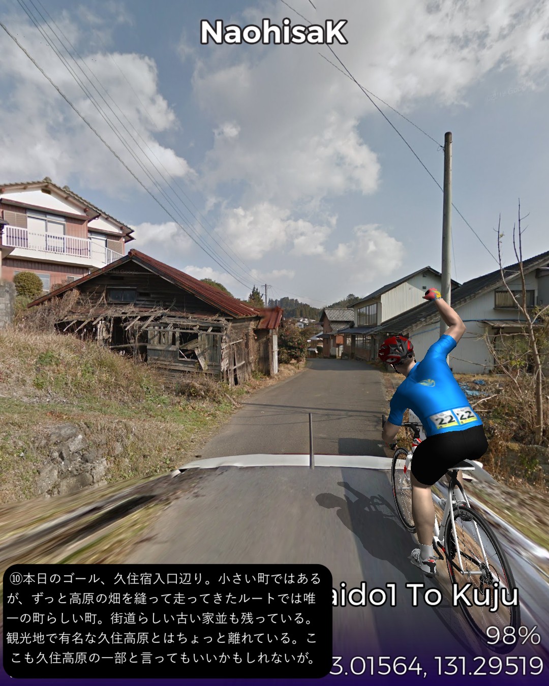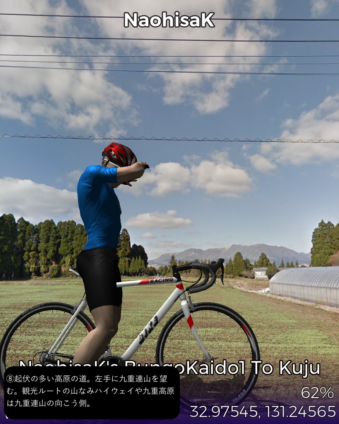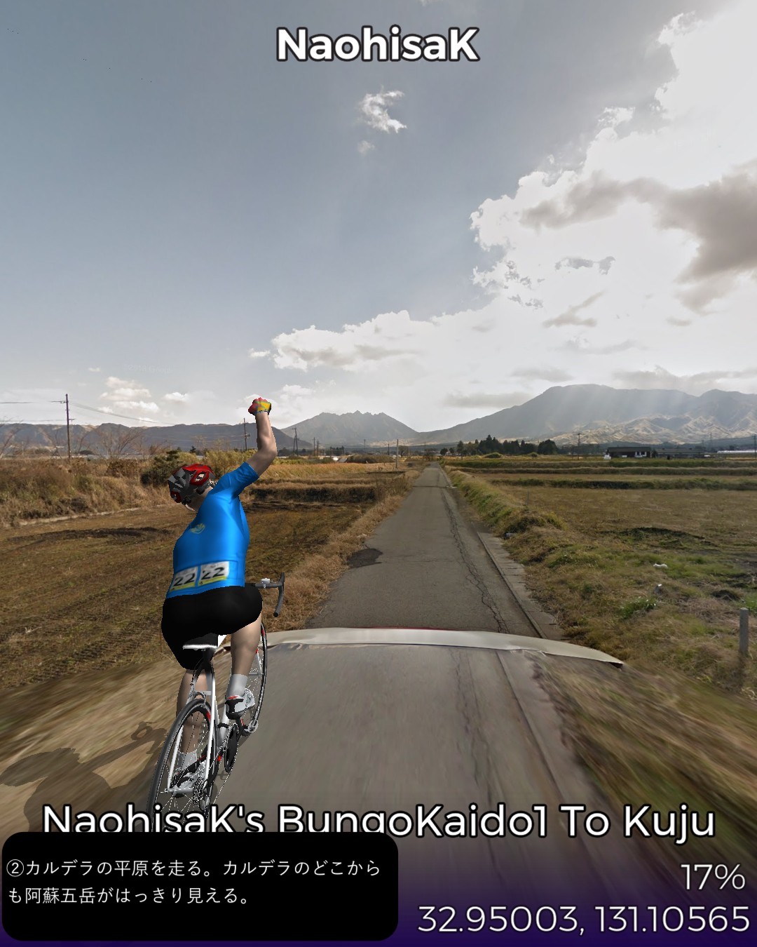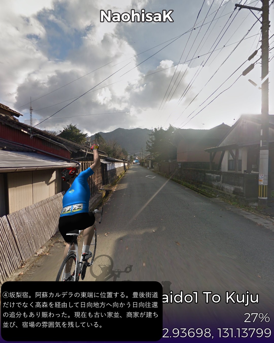 VRサイクリング 豊後街道1日目。阿蘇カルデラの温泉地内牧宿を出て阿蘇山を近くに感じつつカルデラの東端坂梨宿を経て、外輪山を登り、北東へ進路を変えて起伏のある久住高原を延々と進み、ようやくたどり着いた久住宿まで42kmの行程。豊後街道は肥後藩主の細川の殿様が参勤交代で通るルートで、九州の中では長崎街道に次いで街道の整備がされていて、途中の坂梨宿も立派な宿場町の雰囲気を残している。阿蘇を何度か訪れた時は噴火口や草千里などのお決まりの観光コースだったが、今まで行ったことのなかったルートを進んでみて、歴史的背景や知られていない風景など新たな発見があった。外輪山を越えた後久住高原を進んでゆく。久住高原と言えば山なみハイウェイが通る観光地で今まで何度も通ったことがあるが、豊後街道のルートは観光ルートとは距離も離れており、高原野菜の畑と杉の林が続く起伏の多い田舎道である。と言いつつ豊後街道の旧道はかなりの部分ハイキングルート的な道でストリートビューがないので迂回ルート中心となった。