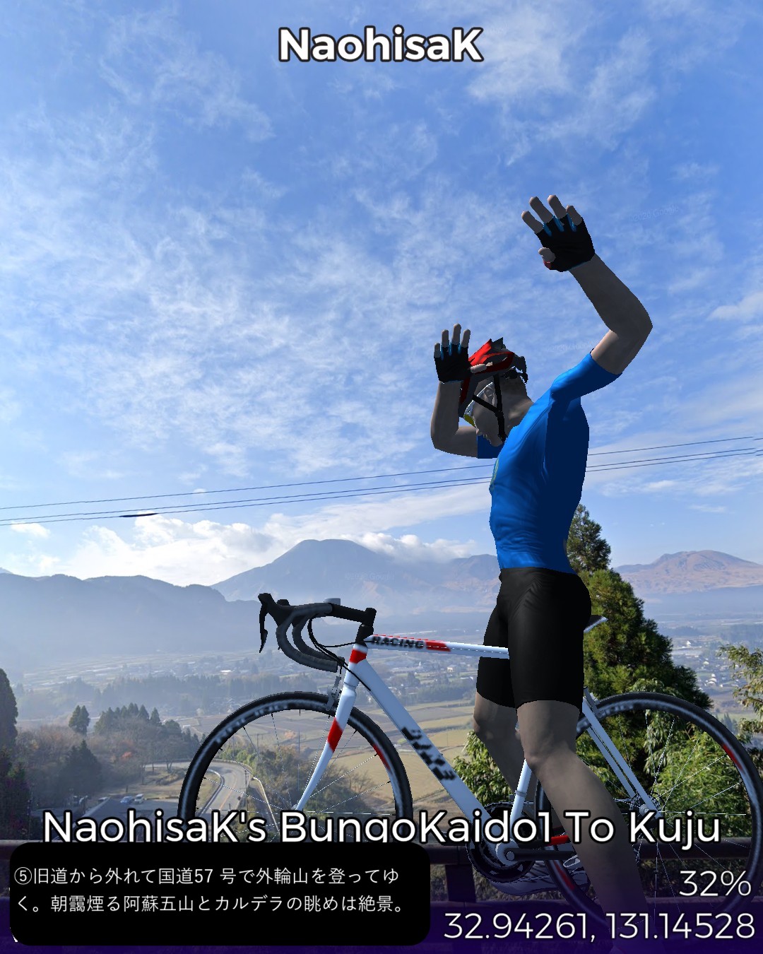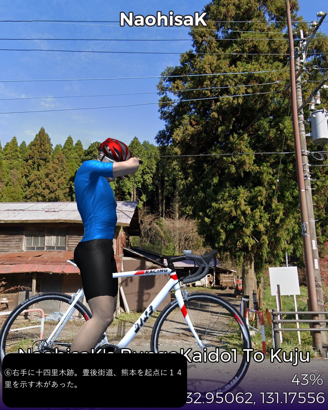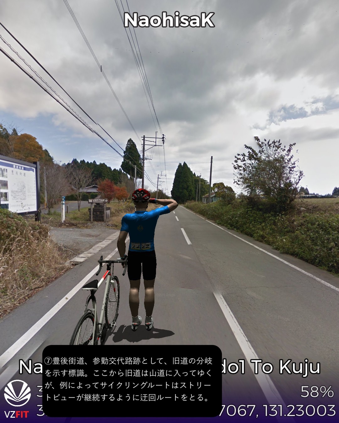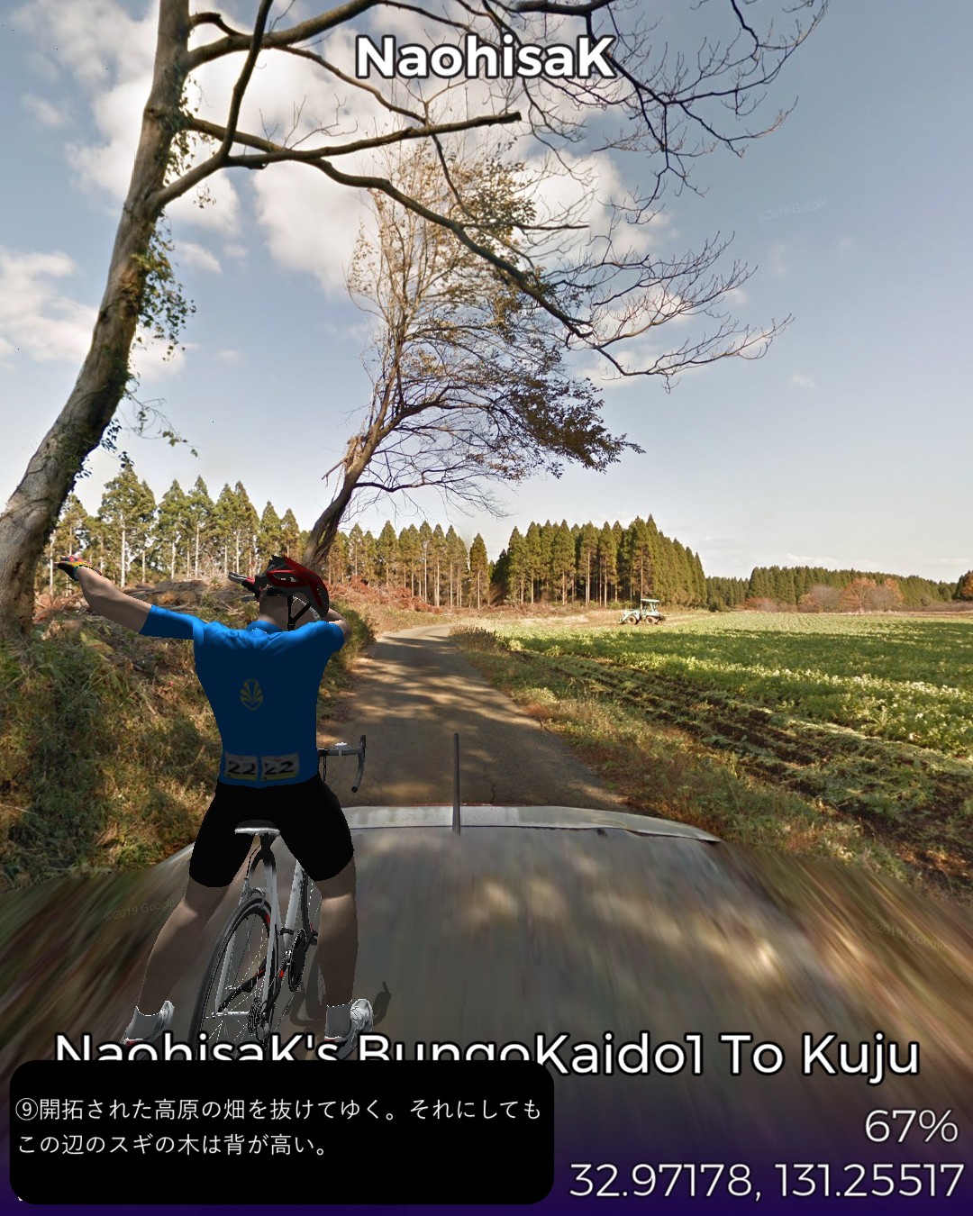 VRサイクリング 豊後街道1日目。阿蘇カルデラの温泉地内牧宿を出て阿蘇山を近くに感じつつカルデラの東端坂梨宿を経て、外輪山を登り、北東へ進路を変えて起伏のある久住高原を延々と進み、ようやくたどり着いた久住宿まで42kmの行程。豊後街道は肥後藩主の細川の殿様が参勤交代で通るルートで、九州の中では長崎街道に次いで街道の整備がされていて、途中の坂梨宿も立派な宿場町の雰囲気を残している。阿蘇を何度か訪れた時は噴火口や草千里などのお決まりの観光コースだったが、今まで行ったことのなかったルートを進んでみて、歴史的背景や知られていない風景など新たな発見があった。外輪山を越えた後久住高原を進んでゆく。久住高原と言えば山なみハイウェイが通る観光地で今まで何度も通ったことがあるが、豊後街道のルートは観光ルートとは距離も離れており、高原野菜の畑と杉の林が続く起伏の多い田舎道である。と言いつつ豊後街道の旧道はかなりの部分ハイキングルート的な道でストリートビューがないので迂回ルート中心となった。