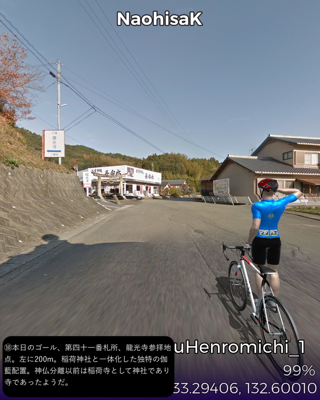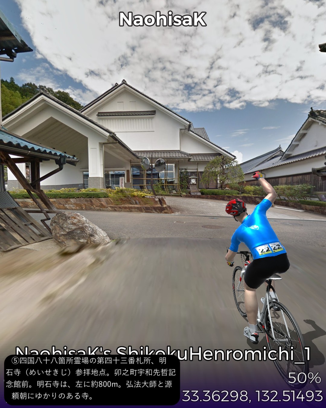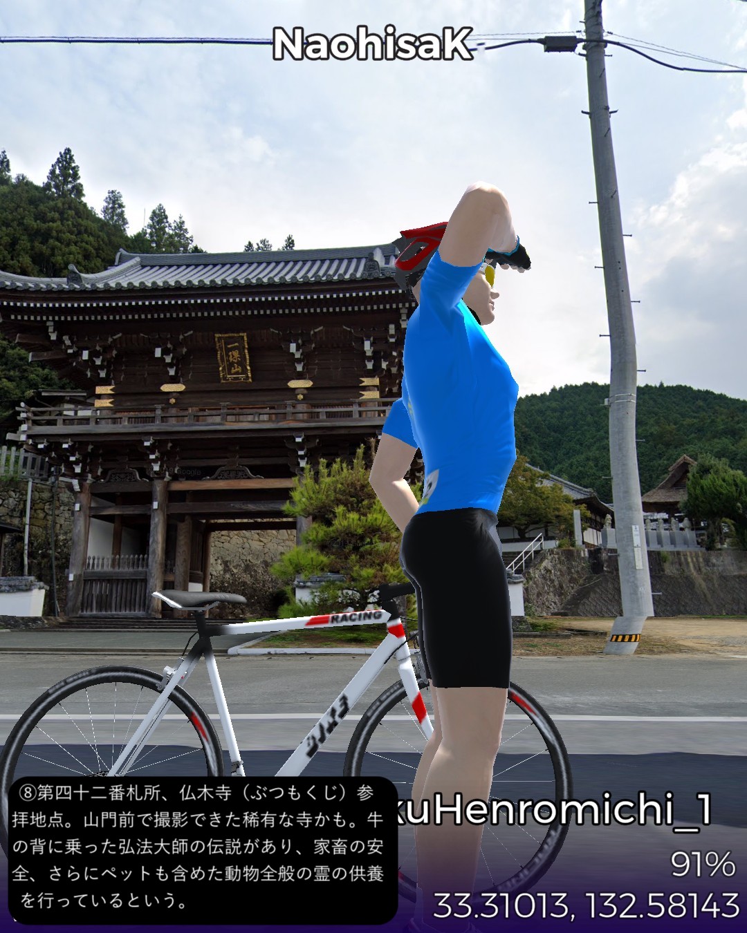 VRサイクリング 四国遍路道1日目。伊予の小京都大洲から遍路道に入り、第四十三番札所明石寺、第四十二番札所仏木寺を参拝し、最後に第四十一番札所、龍光寺を参拝してゴールという39kmの行程。途中、Google Map の都合で本来の遍路道から外れたが、逆に大洲から宇和島へ向かう宇和島街道を進む形になったし法華津峠越えの宇和海の絶景も観れたのでよしとしよう。地図上は愛媛県を南下してい宇和島市の北部まで進んだことになる。