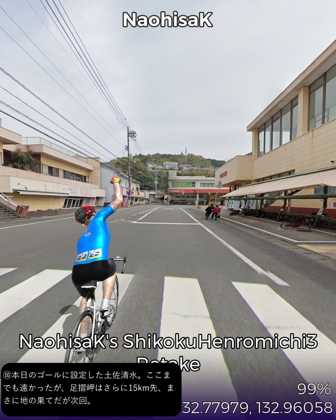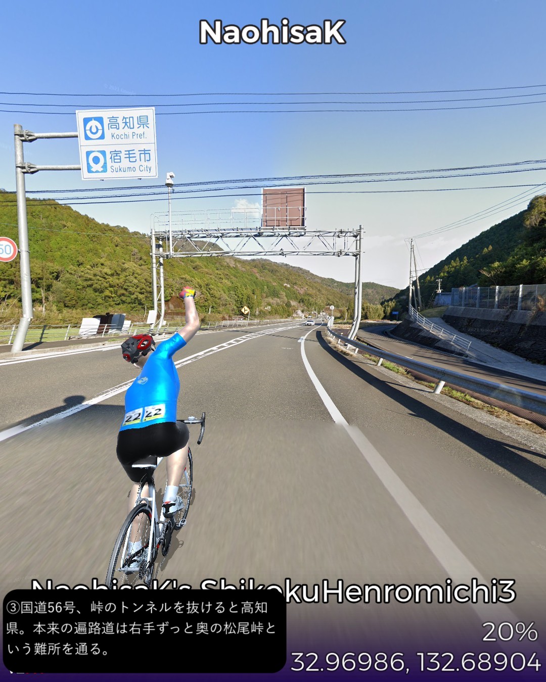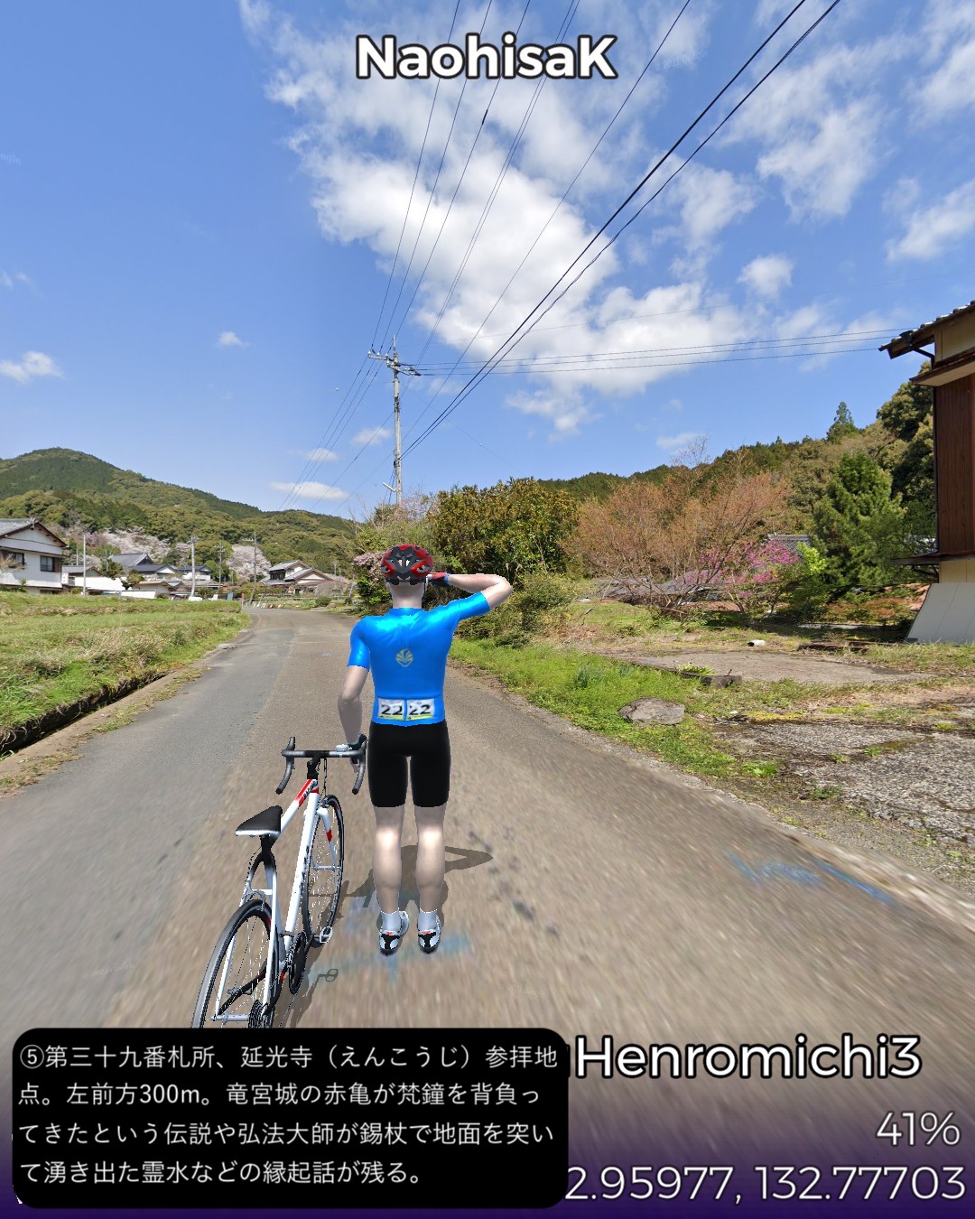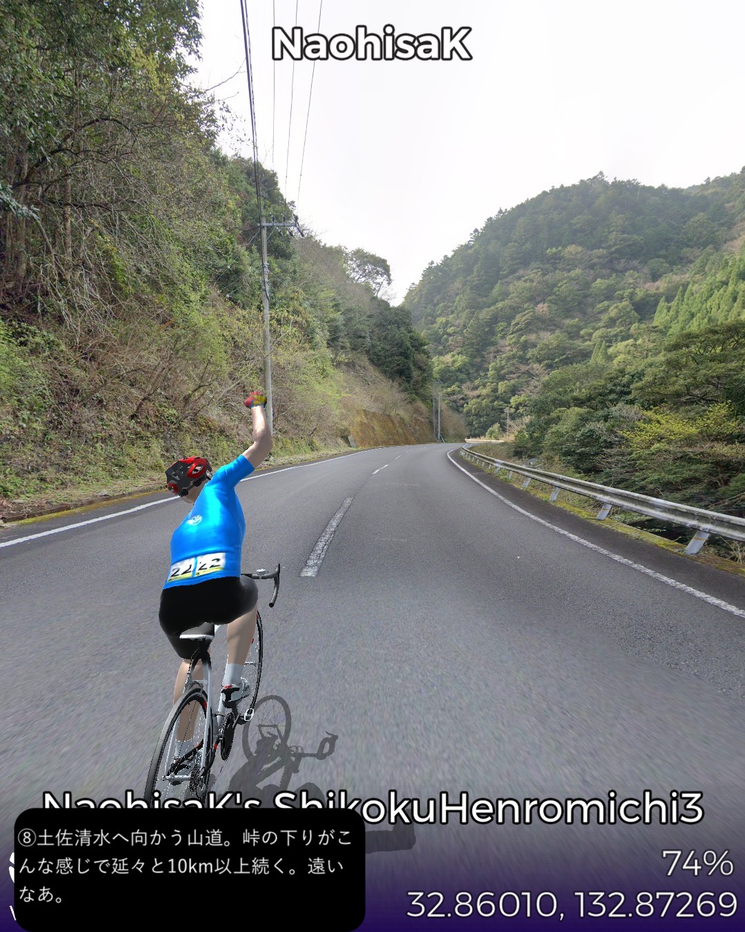 VRサイクリング、四国遍路道3日目。第四十番札所、観自在寺の門前町をスタートし1つ峠を越えて高知県に入り、宿毛市の外れにある第三十九番札所、延光寺の近くで参拝し、2つ峠を越えて本日のゴール漁港の町、土佐清水に至る何と72kmのロングコース。長距離であるがひたすら峠越えのルートであった。土佐清水は鉄道や高速も通っておらず、日本の市の中で東京からの移動時間を最も要する場所の1つとされている。まぁとにかくここまで遠かった。特に四国に入ってから都市と呼べるところを通っていないこともあり遠くまで来た感がブーストされているようだ。ちなみに延光寺まではほぼ遍路道を進んできたが、その先土佐清水までは遍路道は後々足摺岬を回った後のルートとダブるので遍路道から外れて山の中を進むことにしたのだ。さて、次回に到達予定の足摺岬はさらに15km先という超秘境。大学二年の時に行こうとして台風が近づいてきたため宇和島でUターンした。就職した数年後にリベンジで高知からアプローチして足摺岬を訪れたがこの時もとにかく遠かったという印象だけが残っている。