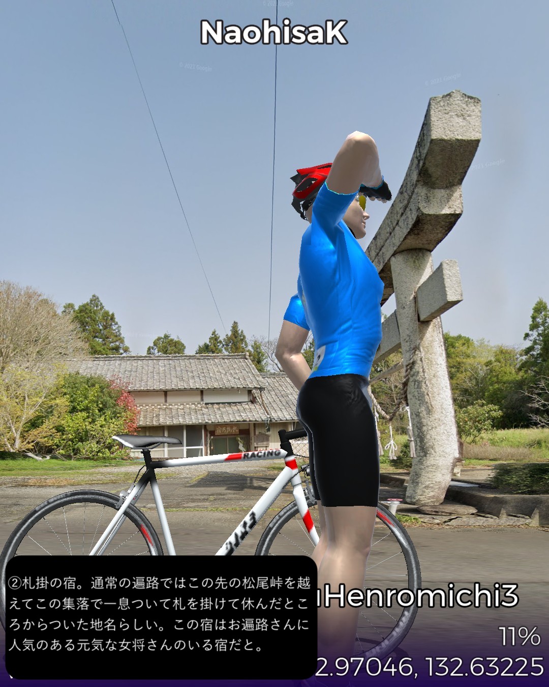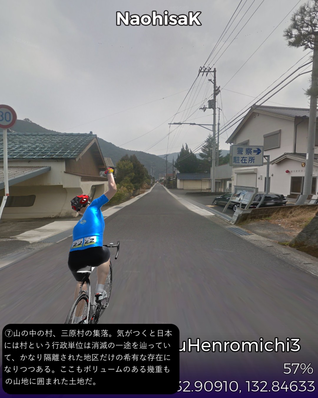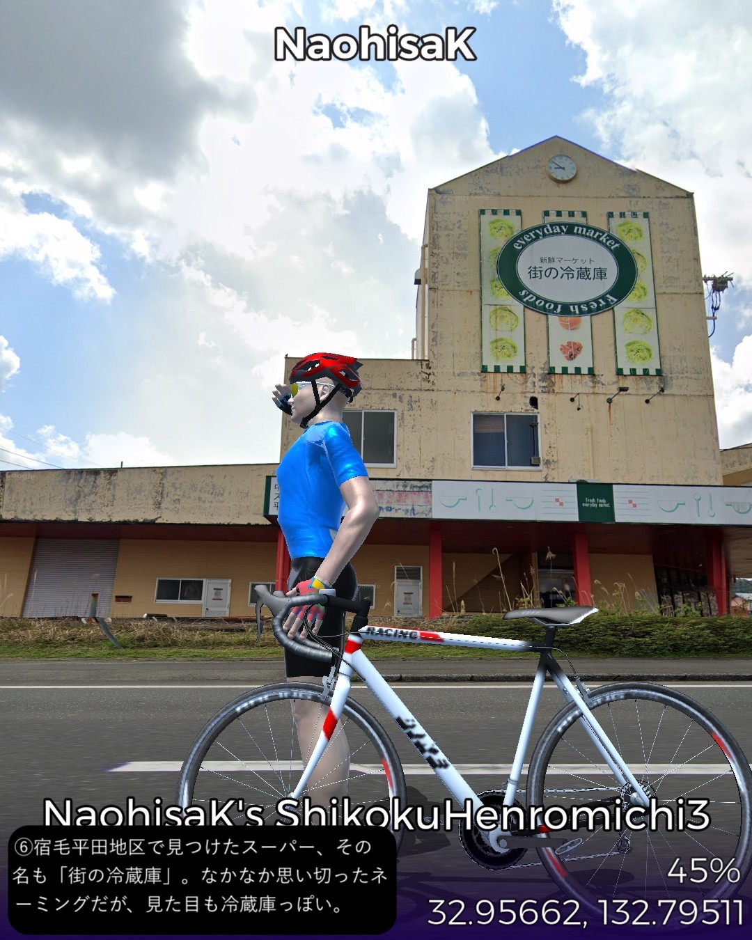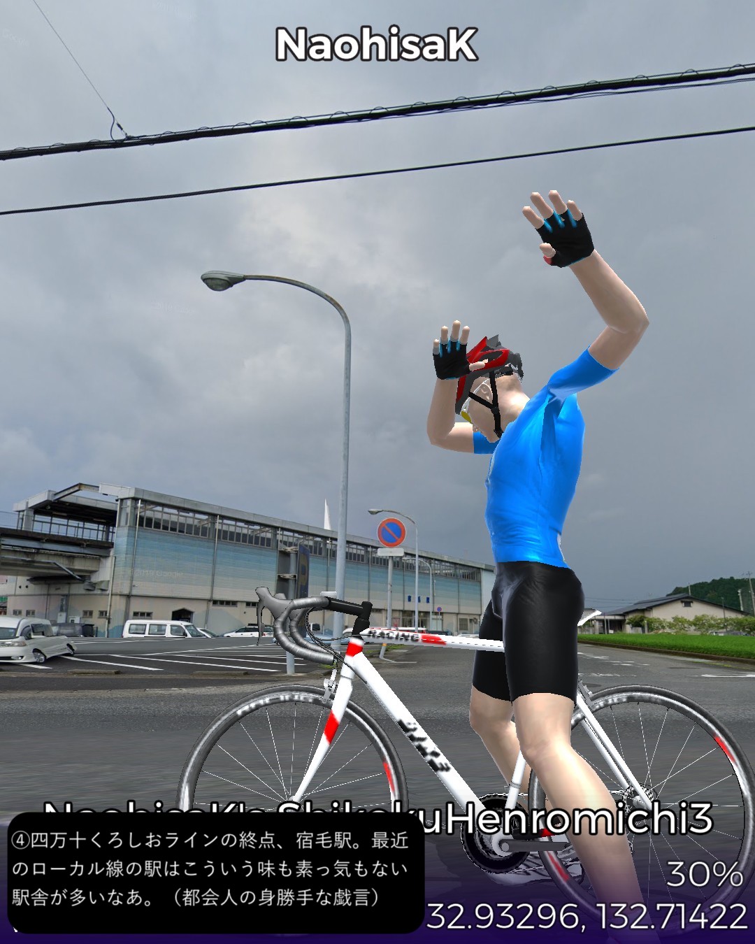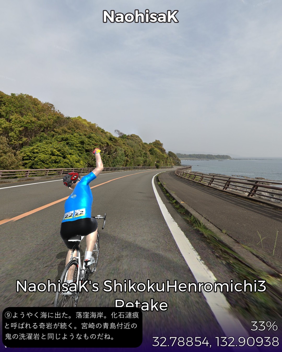 VRサイクリング、四国遍路道3日目。第四十番札所、観自在寺の門前町をスタートし1つ峠を越えて高知県に入り、宿毛市の外れにある第三十九番札所、延光寺の近くで参拝し、2つ峠を越えて本日のゴール漁港の町、土佐清水に至る何と72kmのロングコース。長距離であるがひたすら峠越えのルートであった。土佐清水は鉄道や高速も通っておらず、日本の市の中で東京からの移動時間を最も要する場所の1つとされている。まぁとにかくここまで遠かった。特に四国に入ってから都市と呼べるところを通っていないこともあり遠くまで来た感がブーストされているようだ。ちなみに延光寺まではほぼ遍路道を進んできたが、その先土佐清水までは遍路道は後々足摺岬を回った後のルートとダブるので遍路道から外れて山の中を進むことにしたのだ。さて、次回に到達予定の足摺岬はさらに15km先という超秘境。大学二年の時に行こうとして台風が近づいてきたため宇和島でUターンした。就職した数年後にリベンジで高知からアプローチして足摺岬を訪れたがこの時もとにかく遠かったという印象だけが残っている。