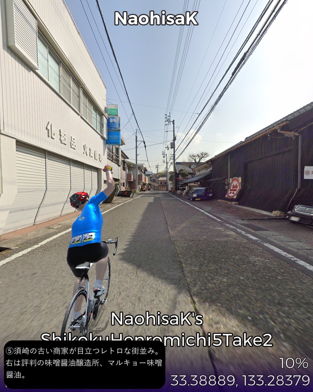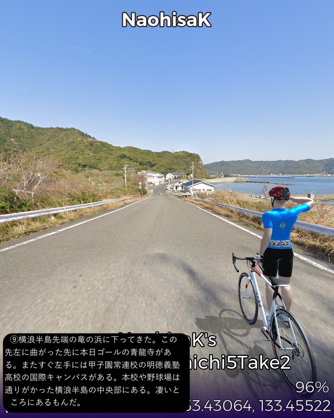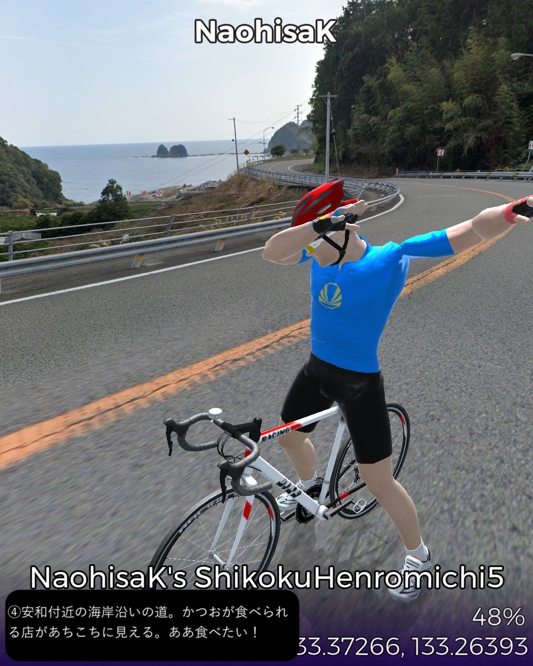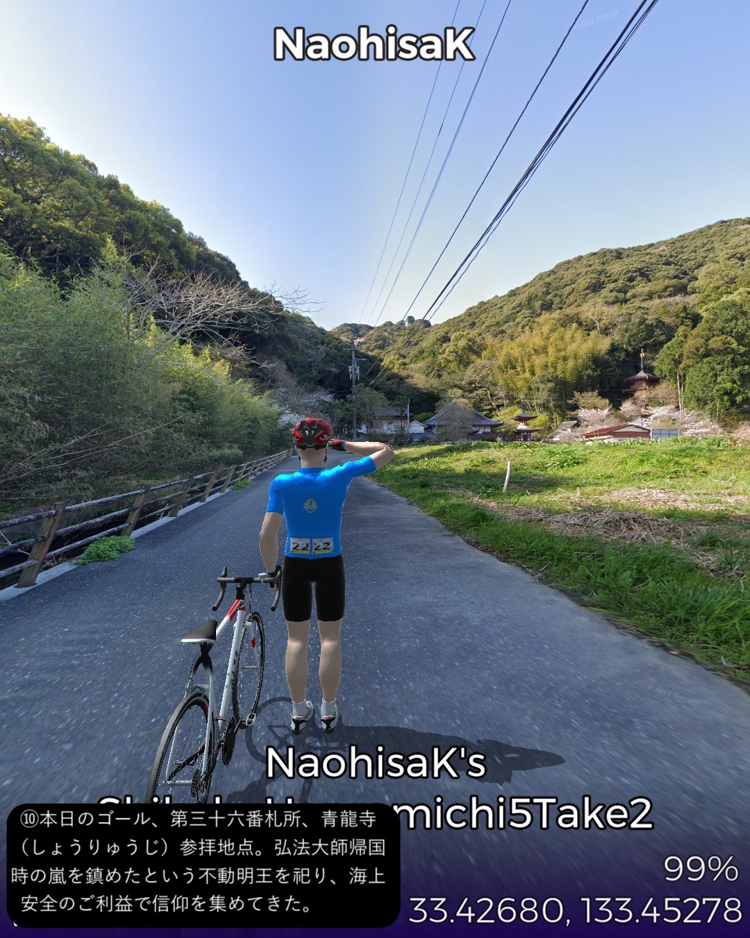 VRサイクリング、四国遍路道に戻ってその5日目。四万十川上流の四万十町窪川にある第37番札所、岩本寺からスタートし、高知方面へ主に国道56号に沿って進み、須崎市街を抜けて、横浪半島の先端にある第36番札所、青龍寺まで一気に進む59kmの行程。今まで四国の南西部でうろうろしていた鬱憤を晴らすかのような快進撃で高知市の近くまで進んできたわけだ。四万十川遡りルートは当然ながら山間のどこまでも変わり映えのしない風景ばかり眺めてきたわけだが、今回は海岸沿いを疾走する爽快なサイクリング。特に後半の須崎から横浪半島のルートが思いがけず素晴らしかった。須崎市街はレトロな味のある家並が楽しめて良かったが、その後横浪半島に入ると、細長い半島の右は断崖絶壁で荒れた太平洋の海岸、左は奥まった通称横浪三里の浦ノ内湾の鏡のように静かな海岸を、尾根のスカイラインから眺めつつ走る絶景の道が続く。ゴールの青龍寺は長閑な山の麓に山桜に埋れた山寺らしい雰囲気を醸していた。朱塗りの三重塔が一点豪華な感じで良い。ここまではしばらく霊場間の距離が長かったが、この先高知市近辺では短めのインターバルで参拝することになる。
