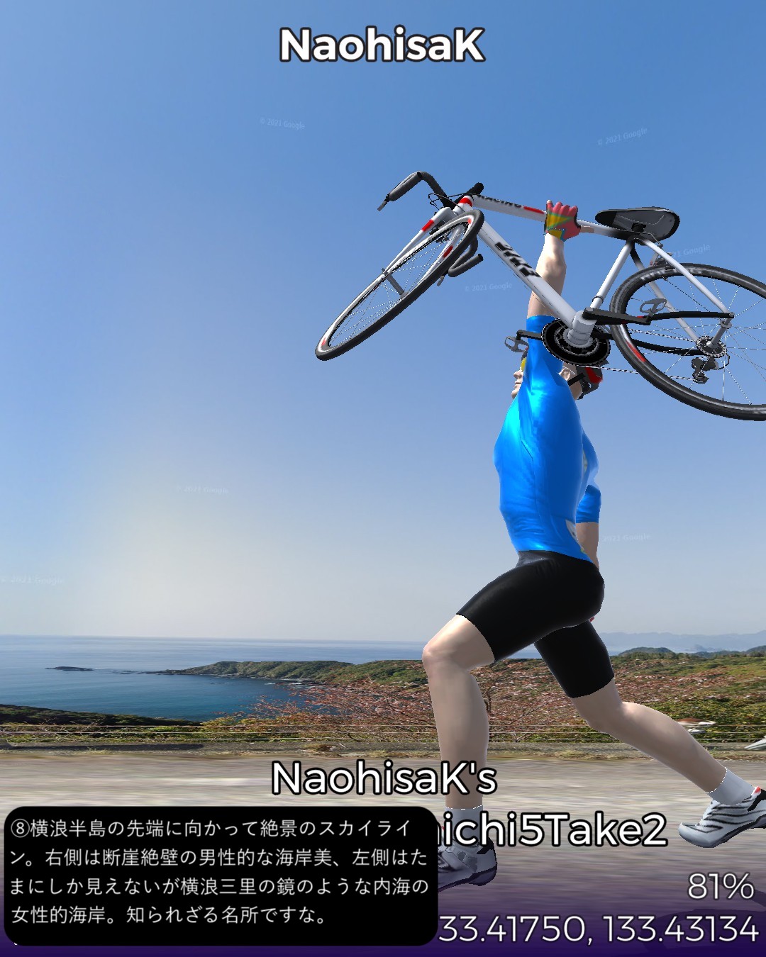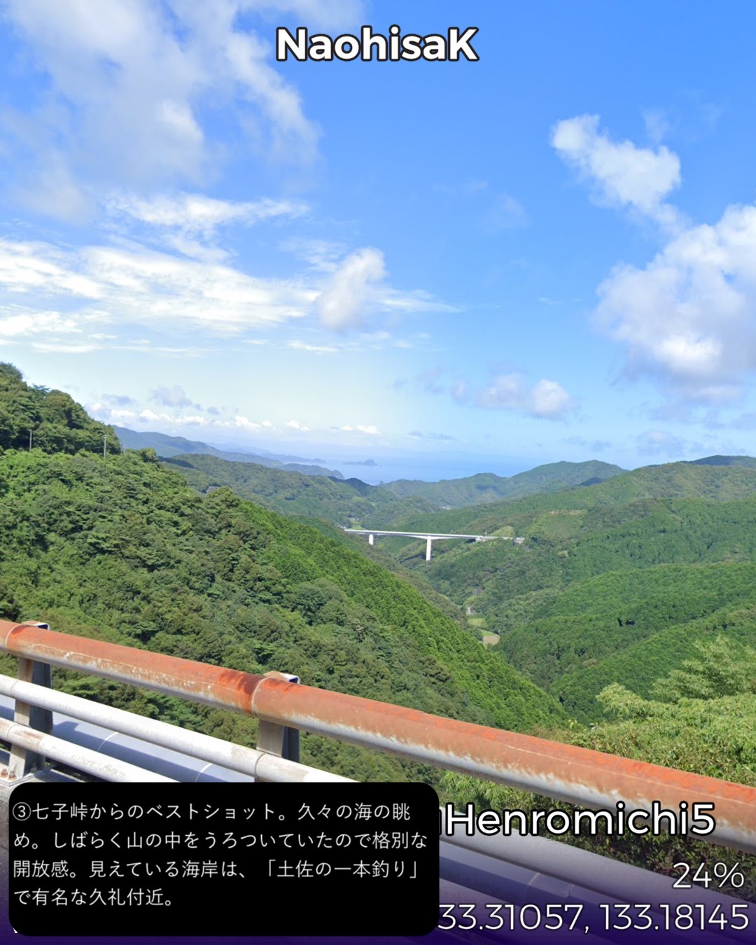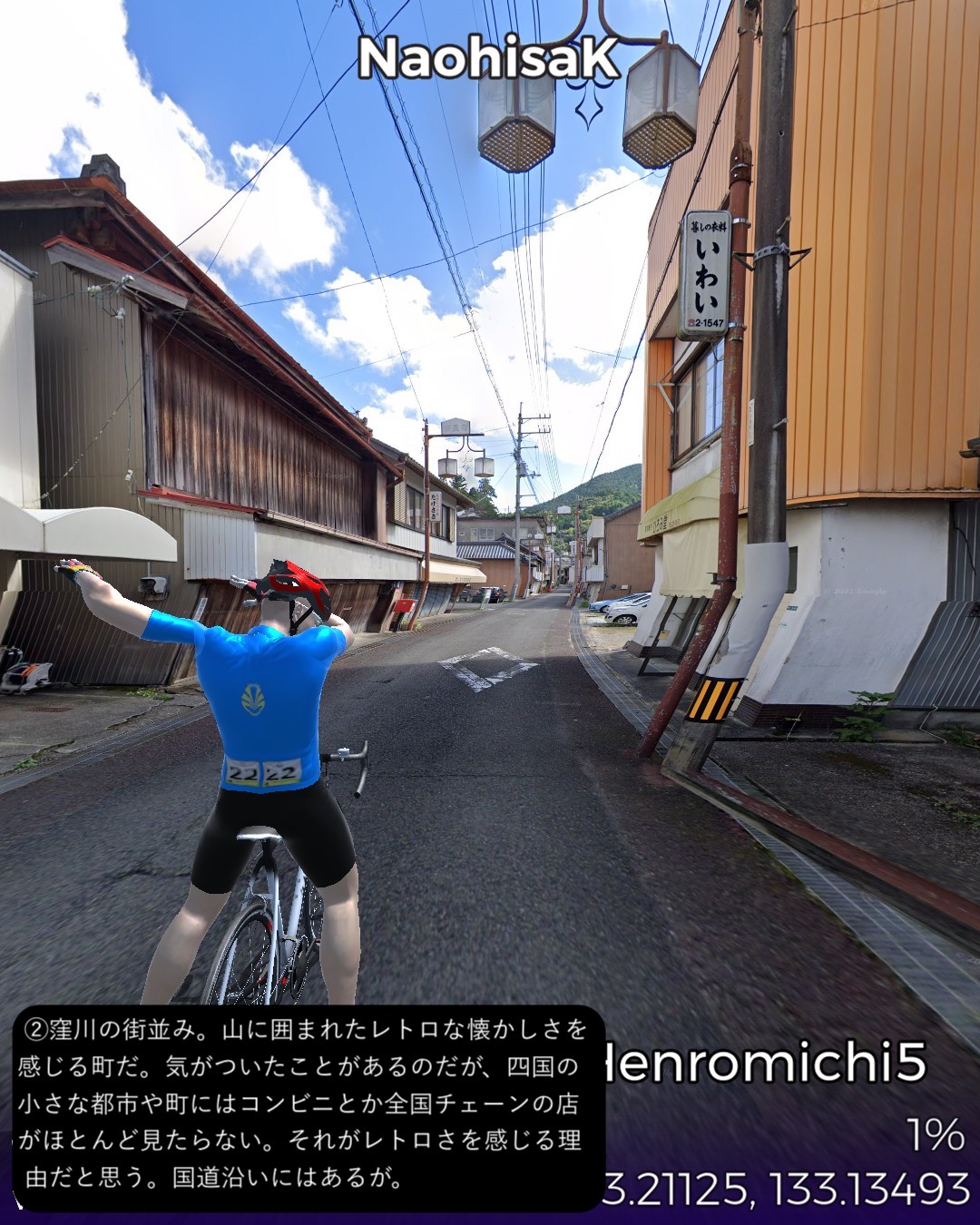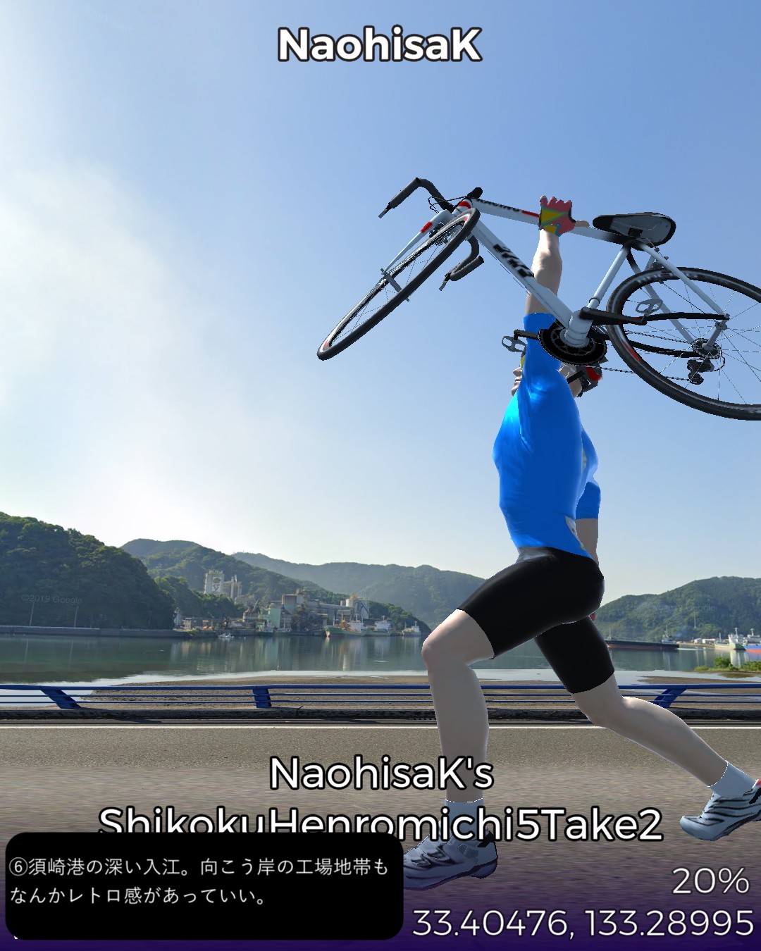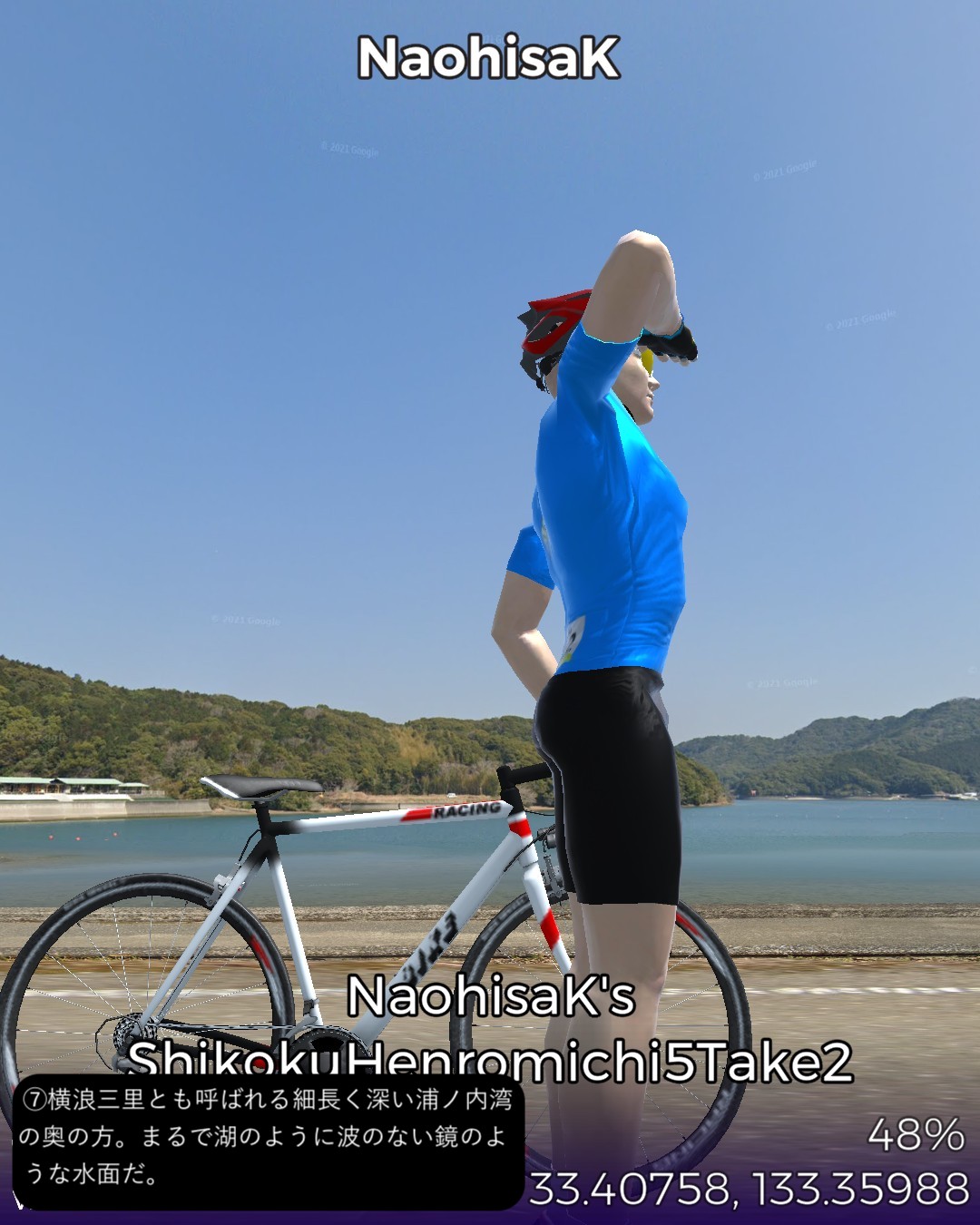 VRサイクリング、四国遍路道に戻ってその5日目。四万十川上流の四万十町窪川にある第37番札所、岩本寺からスタートし、高知方面へ主に国道56号に沿って進み、須崎市街を抜けて、横浪半島の先端にある第36番札所、青龍寺まで一気に進む59kmの行程。今まで四国の南西部でうろうろしていた鬱憤を晴らすかのような快進撃で高知市の近くまで進んできたわけだ。四万十川遡りルートは当然ながら山間のどこまでも変わり映えのしない風景ばかり眺めてきたわけだが、今回は海岸沿いを疾走する爽快なサイクリング。特に後半の須崎から横浪半島のルートが思いがけず素晴らしかった。須崎市街はレトロな味のある家並が楽しめて良かったが、その後横浪半島に入ると、細長い半島の右は断崖絶壁で荒れた太平洋の海岸、左は奥まった通称横浪三里の浦ノ内湾の鏡のように静かな海岸を、尾根のスカイラインから眺めつつ走る絶景の道が続く。ゴールの青龍寺は長閑な山の麓に山桜に埋れた山寺らしい雰囲気を醸していた。朱塗りの三重塔が一点豪華な感じで良い。ここまではしばらく霊場間の距離が長かったが、この先高知市近辺では短めのインターバルで参拝することになる。