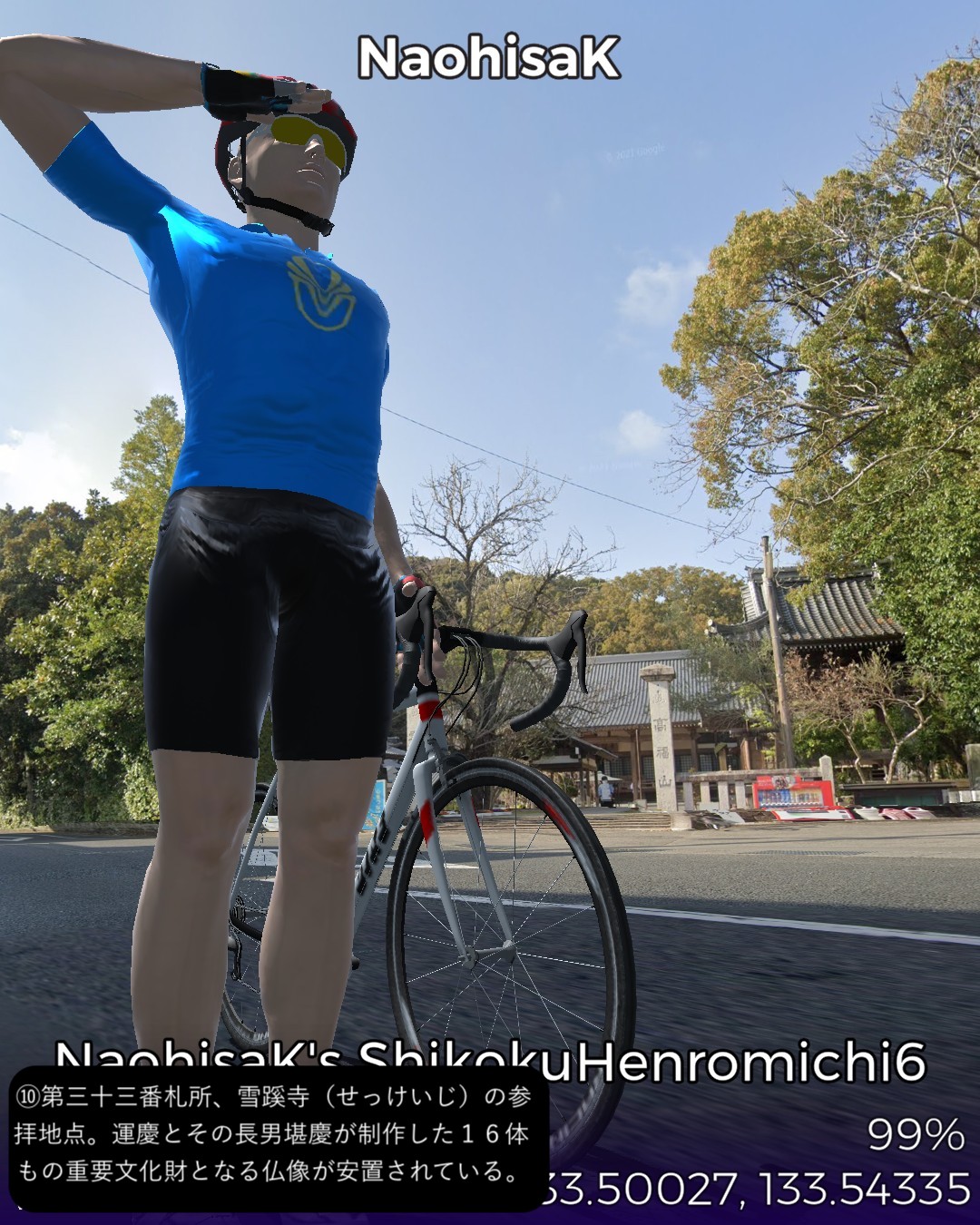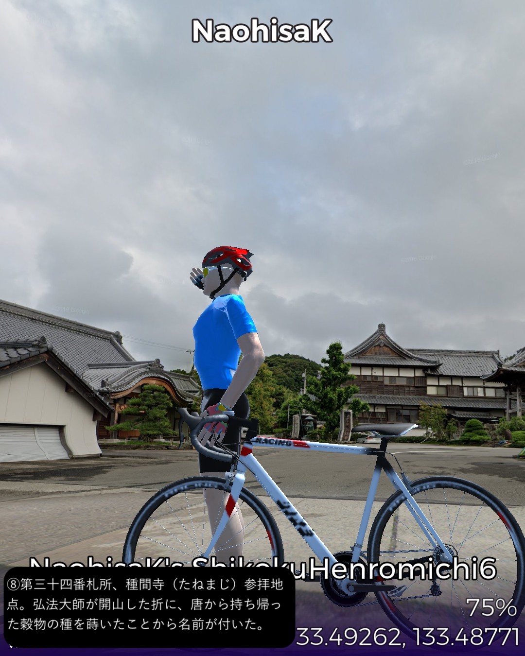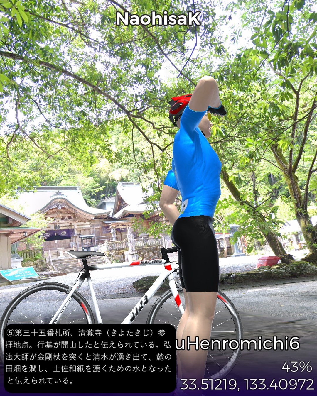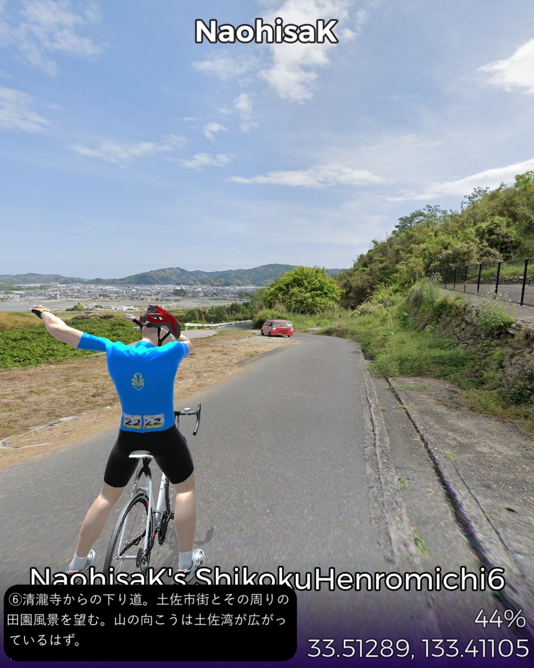 VRサイクリング、四国遍路道6日目は、横浪半島先端の第三十六番札所、青龍寺から出発。海峡を渡って一山越え、土佐市街を抜けて山の上の第三十五番札所、清瀧寺を詣で、日本一の清流、仁淀川を渡って第三十四番札所、種間寺、さらにもう少し先の第三十三番札所、雪蹊寺をゴールとする31kmの行程。にわかにお遍路さん的に忙しくなってきた。この辺は高知にも近く霊場が建てこんでいるのだ。まだまだこの霊場ラッシュは次回まで続く予定。本日のハイライトは山の上の清瀧寺かな。比較的低い山なのだが、山麓の谷間に身を寄せ合う集落を抜けて田舎道の狭い登山道をウネウネと登ると、土佐市街と周辺の広大な田園風景が広がる。寺は山の上の鬱蒼とした森の中で厳かな雰囲気を醸していた。