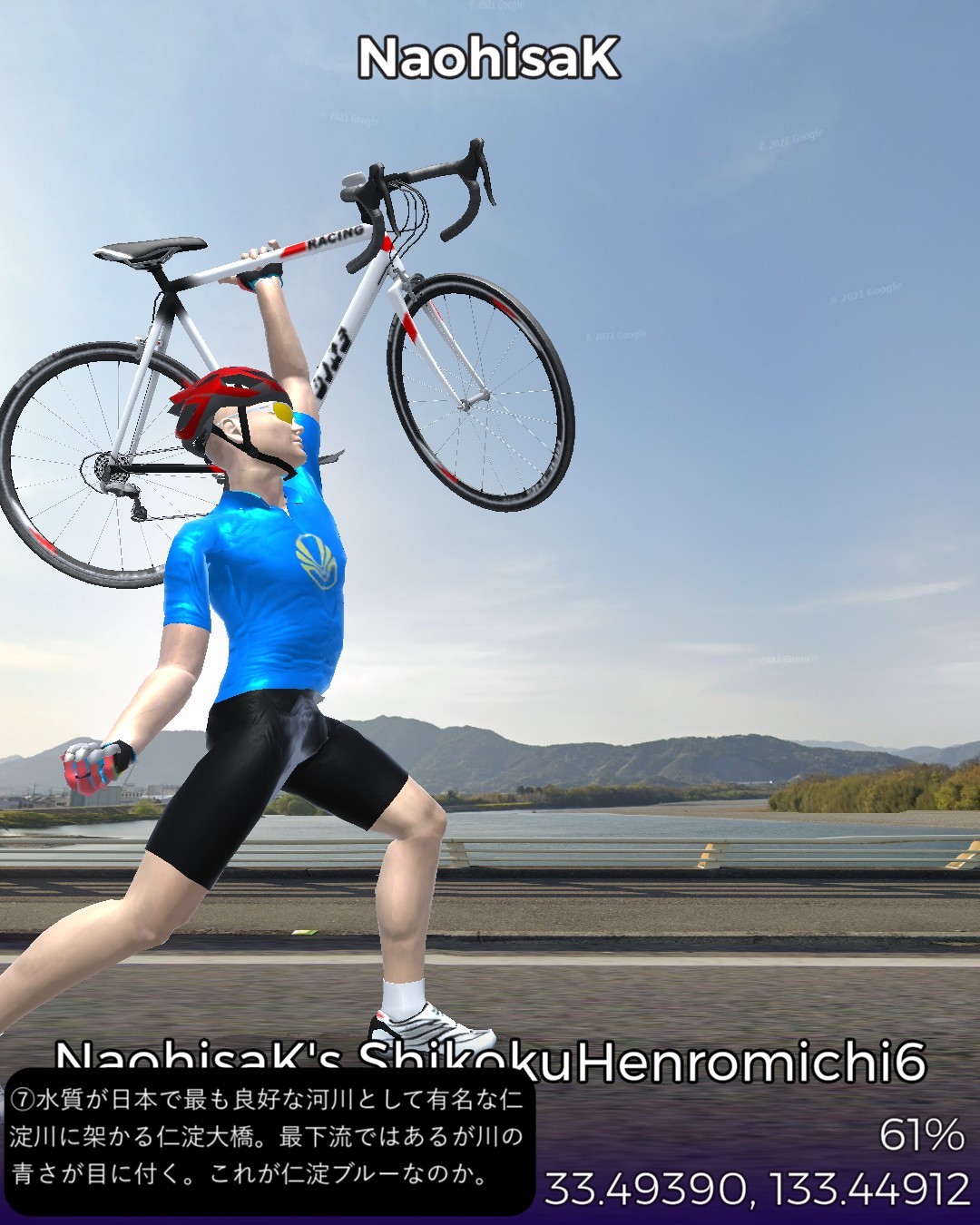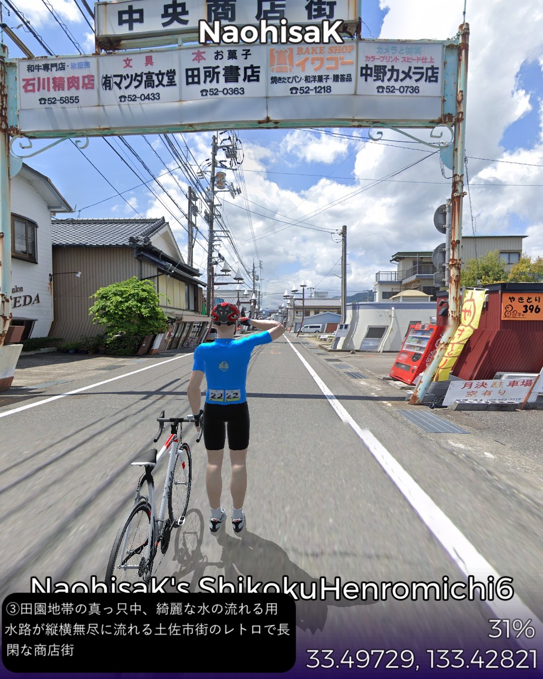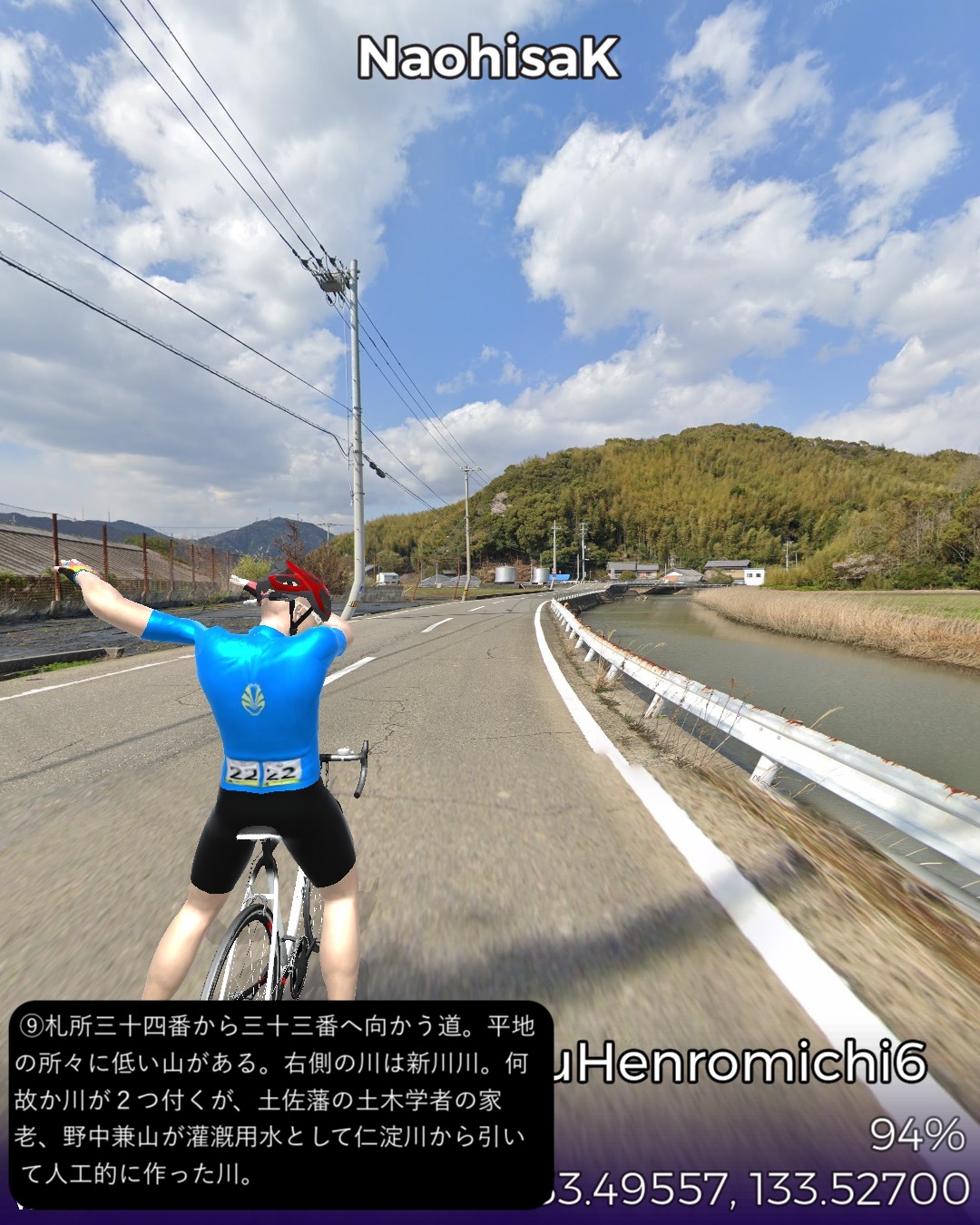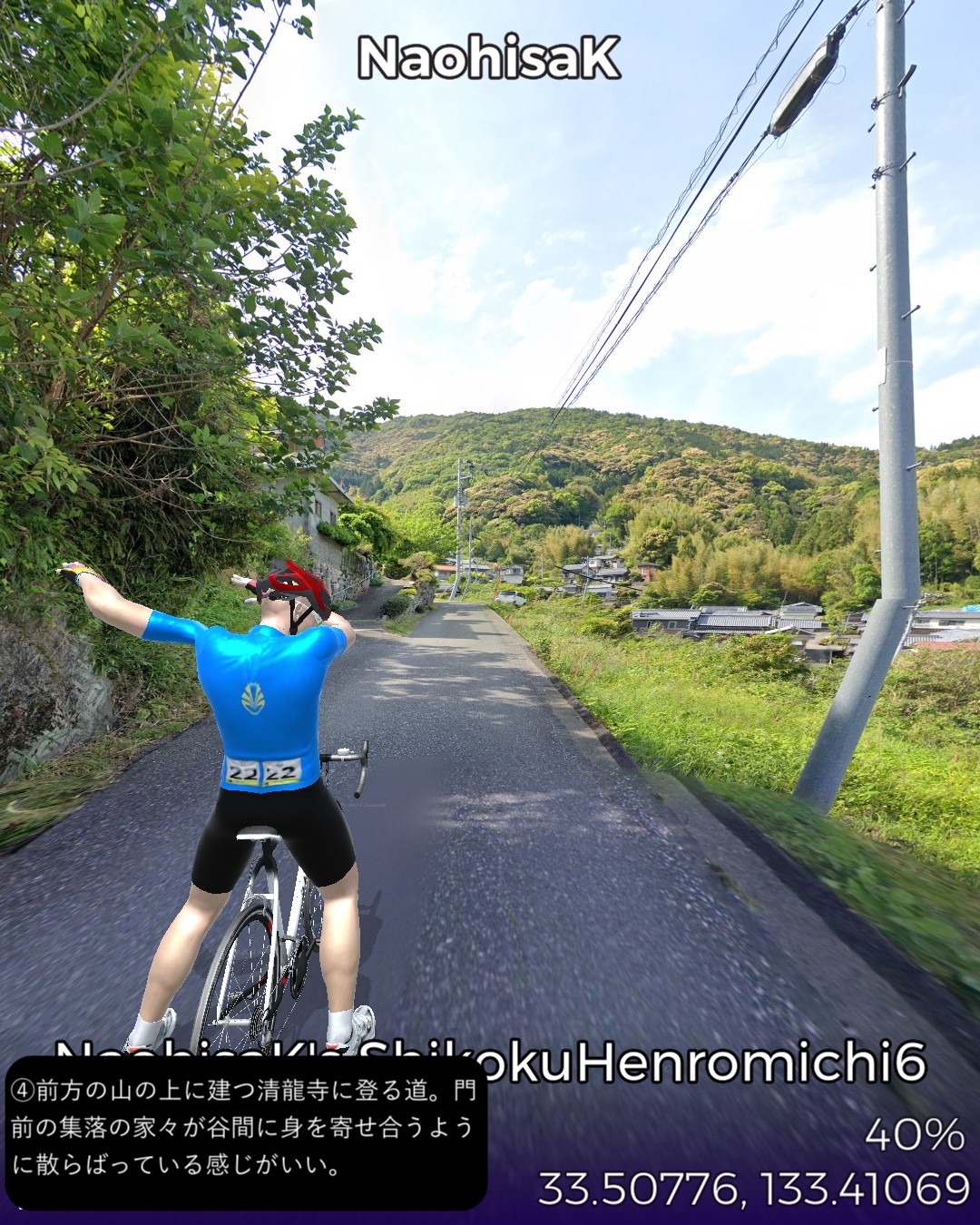VRサイクリング、四国遍路道6日目は、横浪半島先端の第三十六番札所、青龍寺から出発。海峡を渡って一山越え、土佐市街を抜けて山の上の第三十五番札所、清瀧寺を詣で、日本一の清流、仁淀川を渡って第三十四番札所、種間寺、さらにもう少し先の第三十三番札所、雪蹊寺をゴールとする31kmの行程。にわかにお遍路さん的に忙しくなってきた。この辺は高知にも近く霊場が建てこんでいるのだ。まだまだこの霊場ラッシュは次回まで続く予定。本日のハイライトは山の上の清瀧寺かな。比較的低い山なのだが、山麓の谷間に身を寄せ合う集落を抜けて田舎道の狭い登山道をウネウネと登ると、土佐市街と周辺の広大な田園風景が広がる。寺は山の上の鬱蒼とした森の中で厳かな雰囲気を醸していた。