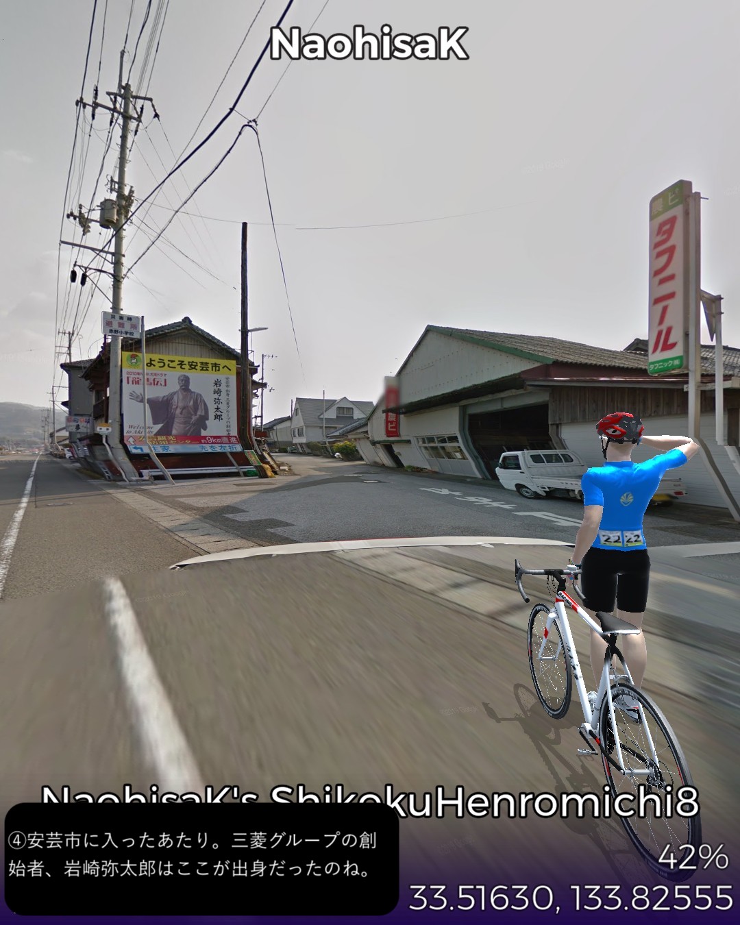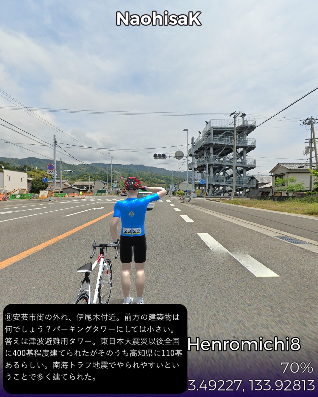 VRサイクリング、四国遍路道8日目 高知の東側香南市にある第二十八番札所、大日寺をスタートし、室戸岬方面へ海岸通りを進み、岩崎弥太郎生誕の地、安芸を経て、今までで一番過酷な登り道の先にある第二十七番札所、神峯寺に至る38kmの行程。今回はほぼ海沿いのルートとなるが、高知から室戸岬にかけての海岸は砂浜のビーチが多い。高知県の海岸沿いは、足摺岬にかけての西側もそうであるが、津波の備えの配慮がただ物ではない。所々に津波の到達予想範囲を示す看板が立てられているし、津波避難タワーというのも数カ所で目撃した。津波避難タワーは、見た目はミニ立体駐車場タワーのようなスロープ付きの剥き出しの鉄筋コンクリート製の4階建程度の建造物で、東日本大震災以後日本中で400基ほど建てられたがそのうち110基は高知県に建てられたらしい。南海トラフ地震により一番津波被害が想定される地域ということでケアされたようだ。次回は室戸岬まで進む予定。