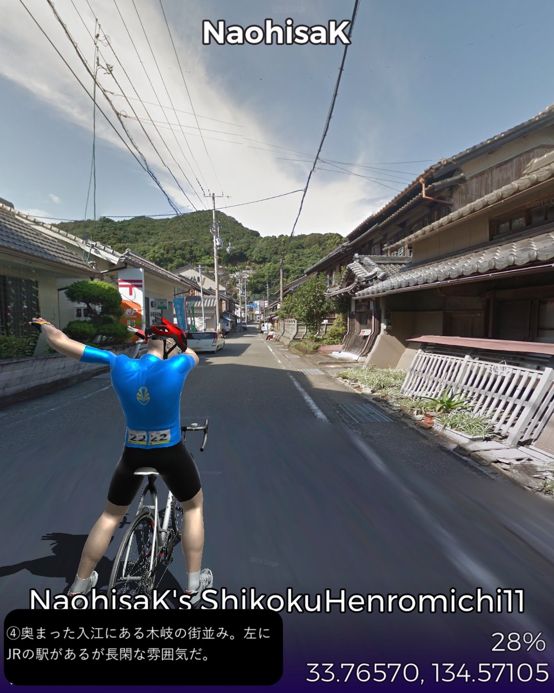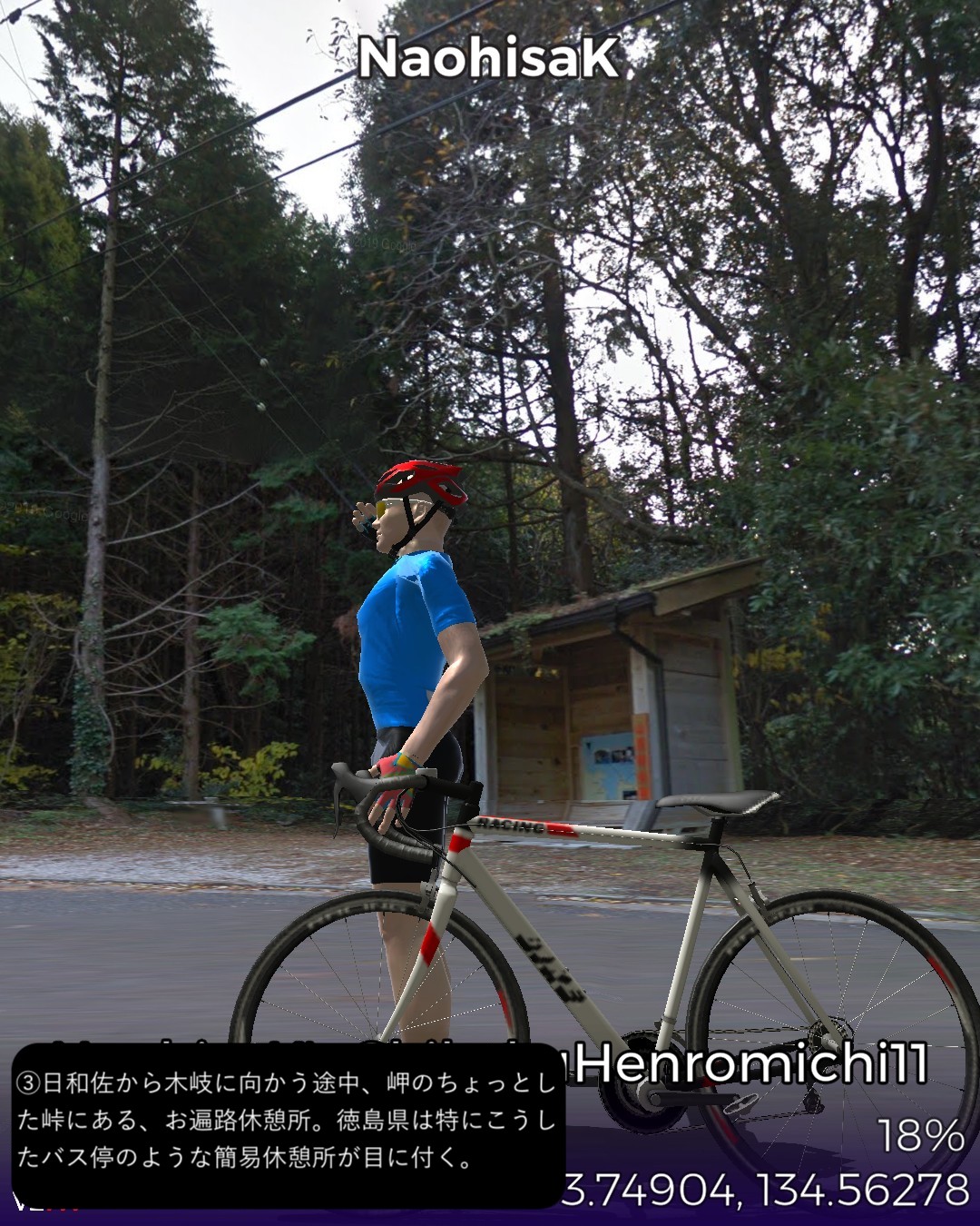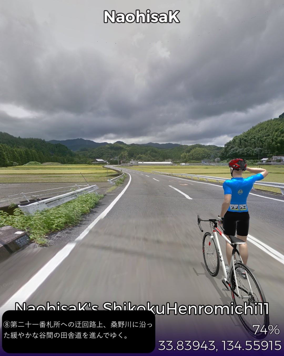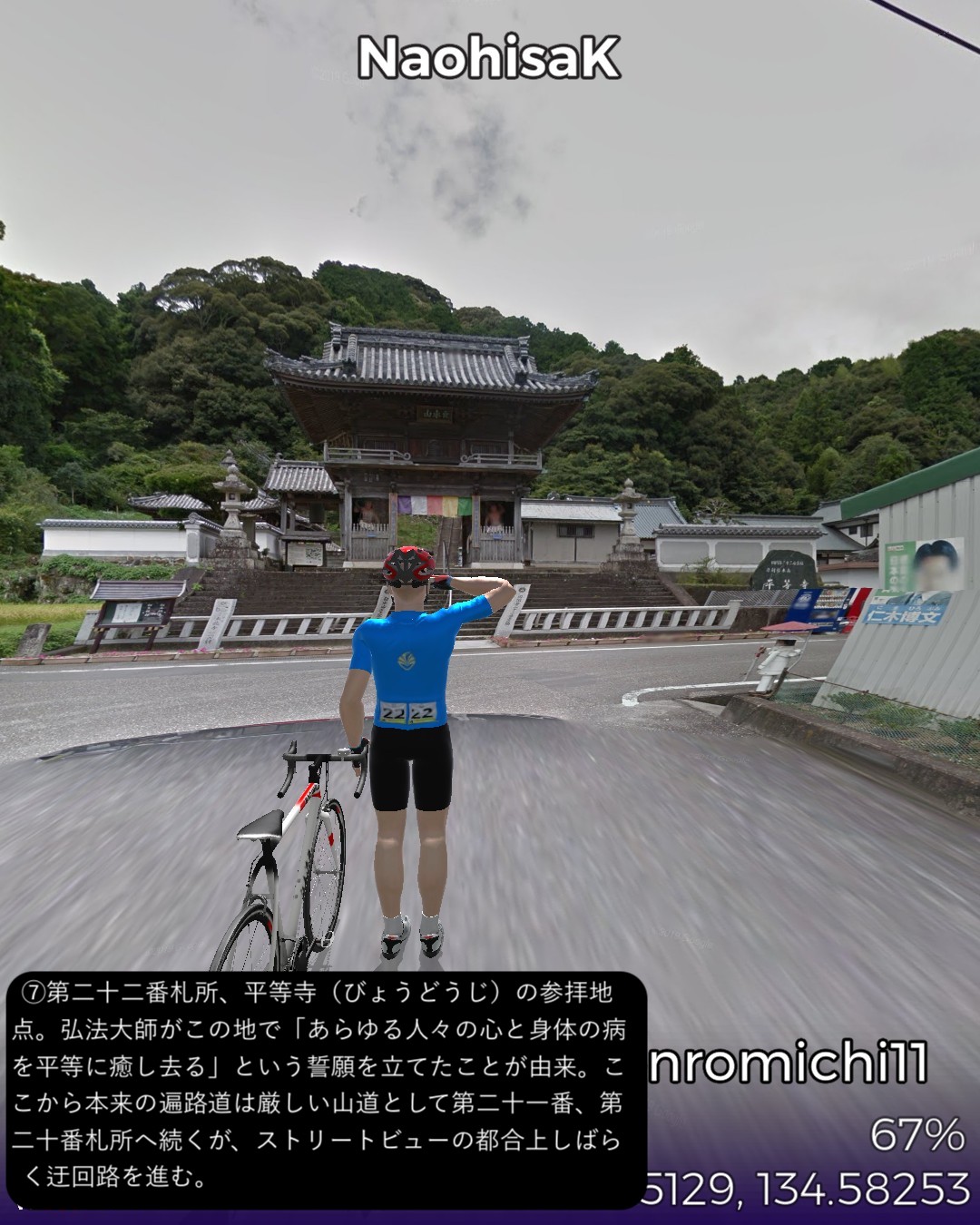 VRサイクリング、四国遍路道11日目。厄除けの霊場第二十三番札所、薬王寺前をスタートし、アオウミガメの産卵で有名な日和佐海岸を通り抜けそのまま岬と入江が交互に現れるリアス式海岸沿いをしばらく進み、その後久々に本格的に山中に入り一山越えた先の第二十二番札所、平等寺、そこから険しい山中に入る本来の遍路道の迂回路の谷間を進んで第二十一番札所、太龍寺へ登るロープウェイの発着場付近の参拝地点をゴールとする39kmの行程。前半の日和佐から由岐に至るリアス式海岸が、室戸岬から続く海岸沿いの道中で一番美しい海岸という印象が残った。ウミガメが産卵地に選んだのも分かる気がする。後半の久々の山道はなかなか険しかった。四国上陸した時の佐田岬半島が四国山脈の西の端に相当するが、この辺は四国山脈の東の端に相当するらしい。そういう意味では四国を横断してきたんだな、という感慨がわく。次回は山を抜けて一気に徳島市街へ進む予定。