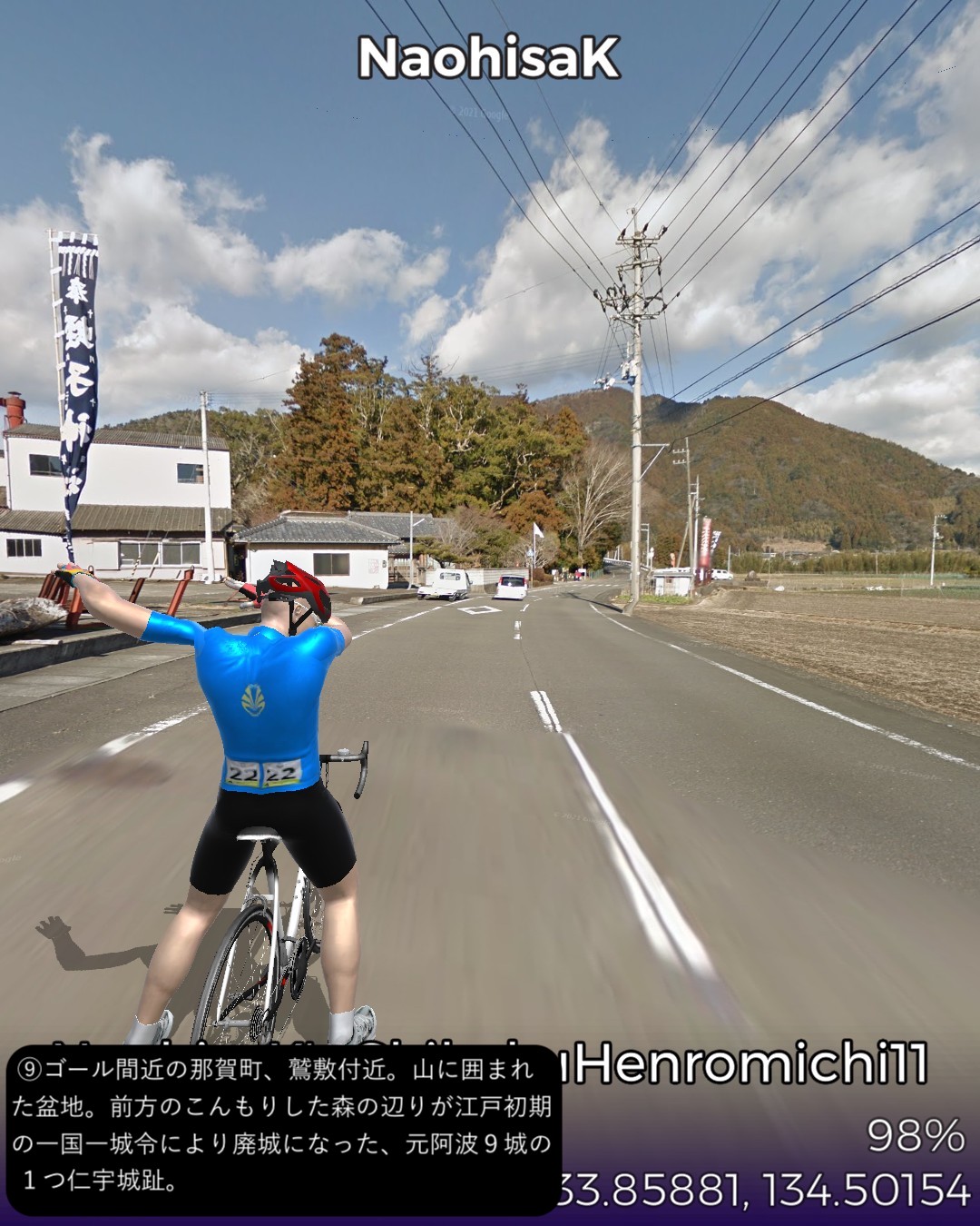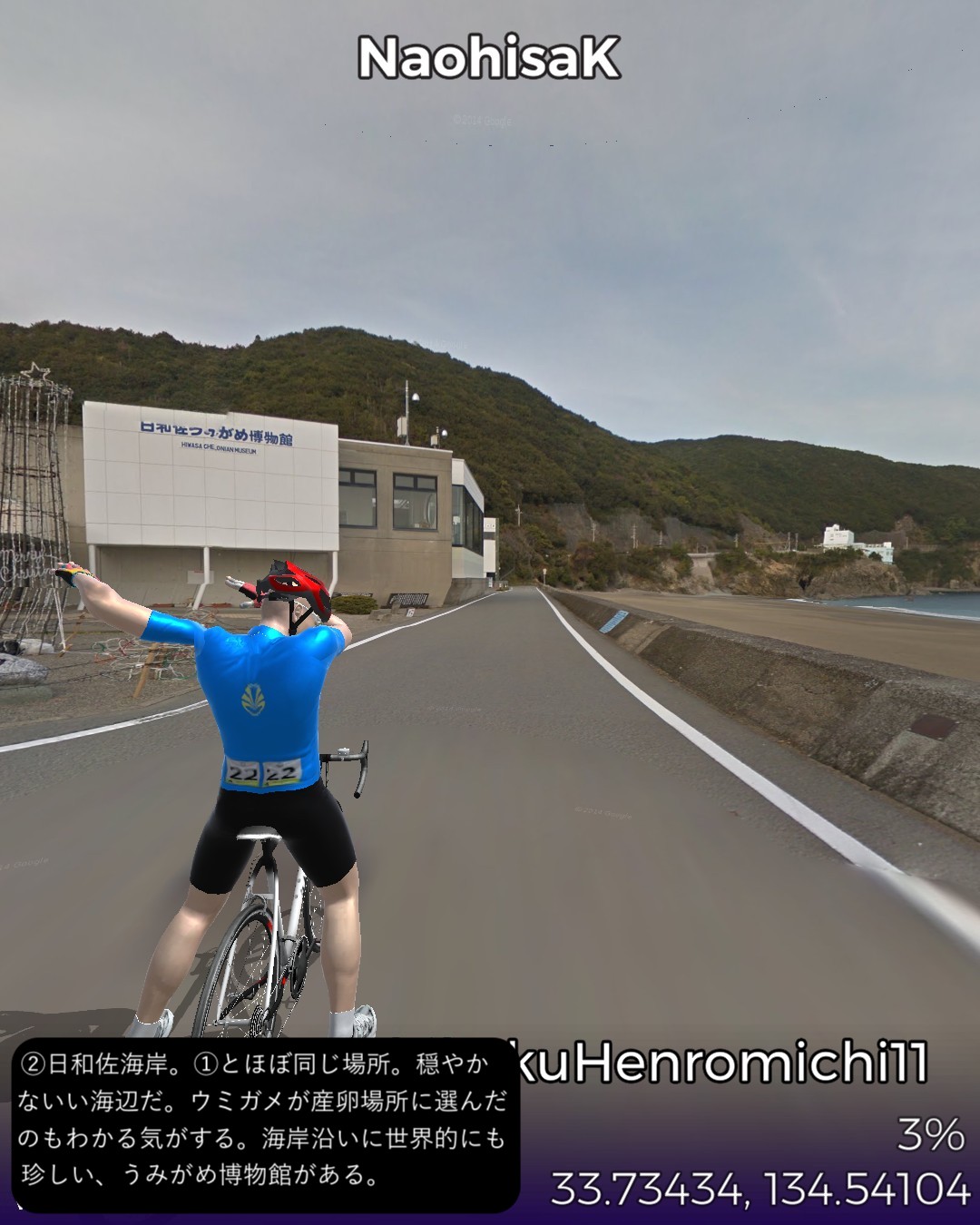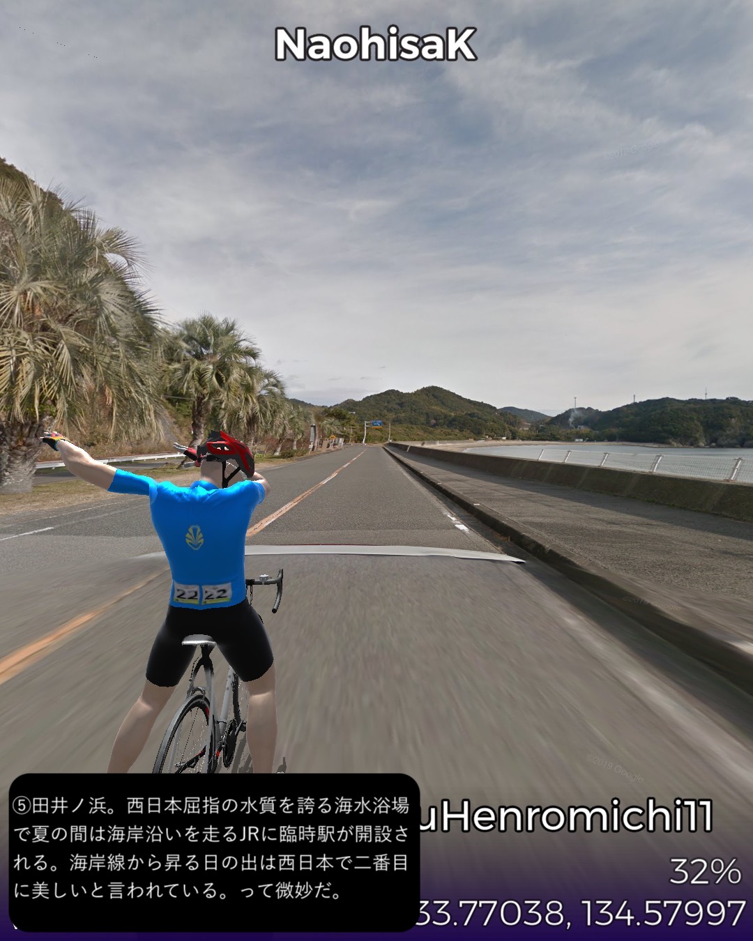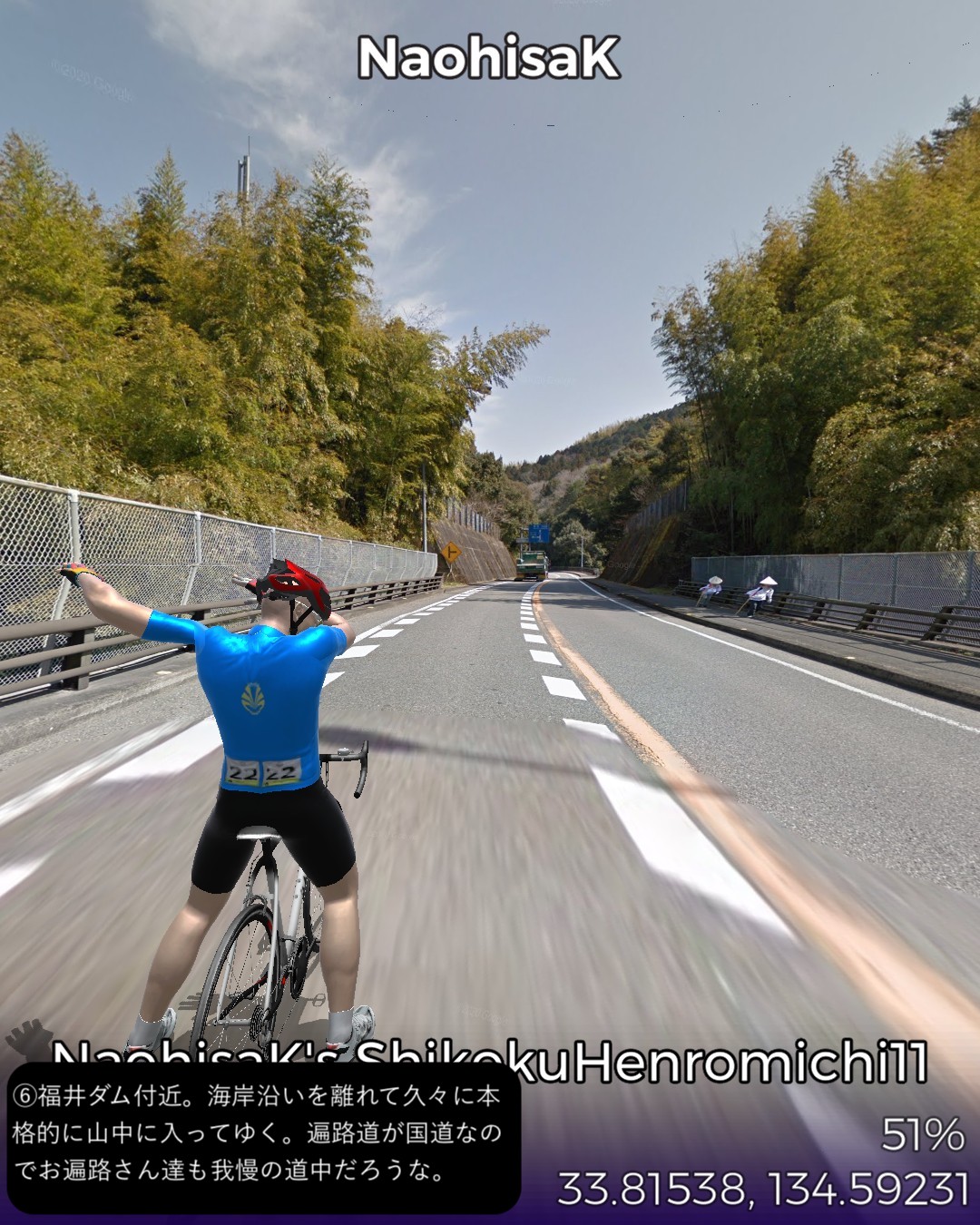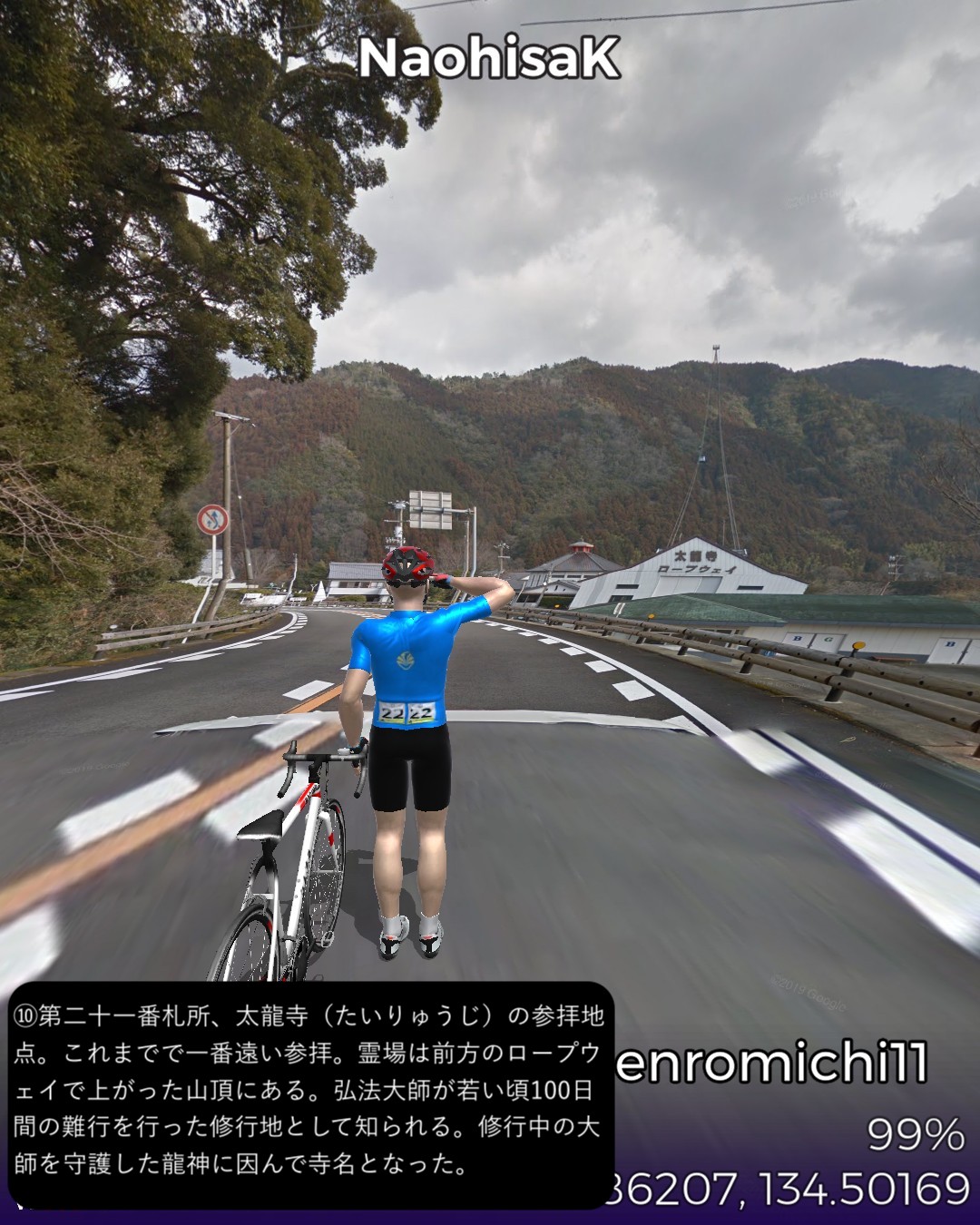 VRサイクリング、四国遍路道11日目。厄除けの霊場第二十三番札所、薬王寺前をスタートし、アオウミガメの産卵で有名な日和佐海岸を通り抜けそのまま岬と入江が交互に現れるリアス式海岸沿いをしばらく進み、その後久々に本格的に山中に入り一山越えた先の第二十二番札所、平等寺、そこから険しい山中に入る本来の遍路道の迂回路の谷間を進んで第二十一番札所、太龍寺へ登るロープウェイの発着場付近の参拝地点をゴールとする39kmの行程。前半の日和佐から由岐に至るリアス式海岸が、室戸岬から続く海岸沿いの道中で一番美しい海岸という印象が残った。ウミガメが産卵地に選んだのも分かる気がする。後半の久々の山道はなかなか険しかった。四国上陸した時の佐田岬半島が四国山脈の西の端に相当するが、この辺は四国山脈の東の端に相当するらしい。そういう意味では四国を横断してきたんだな、という感慨がわく。次回は山を抜けて一気に徳島市街へ進む予定。