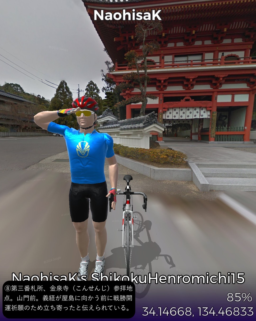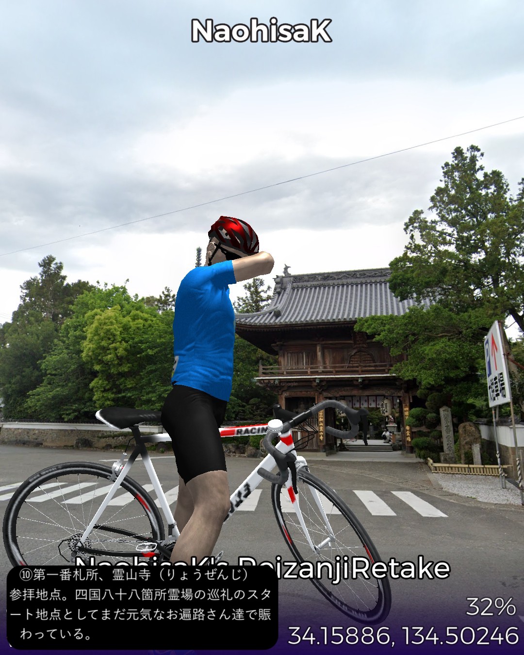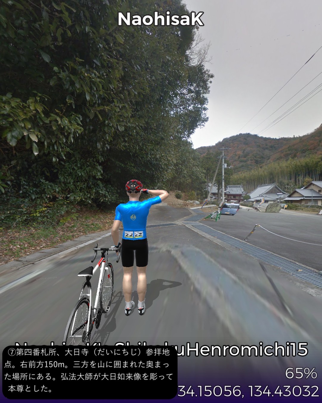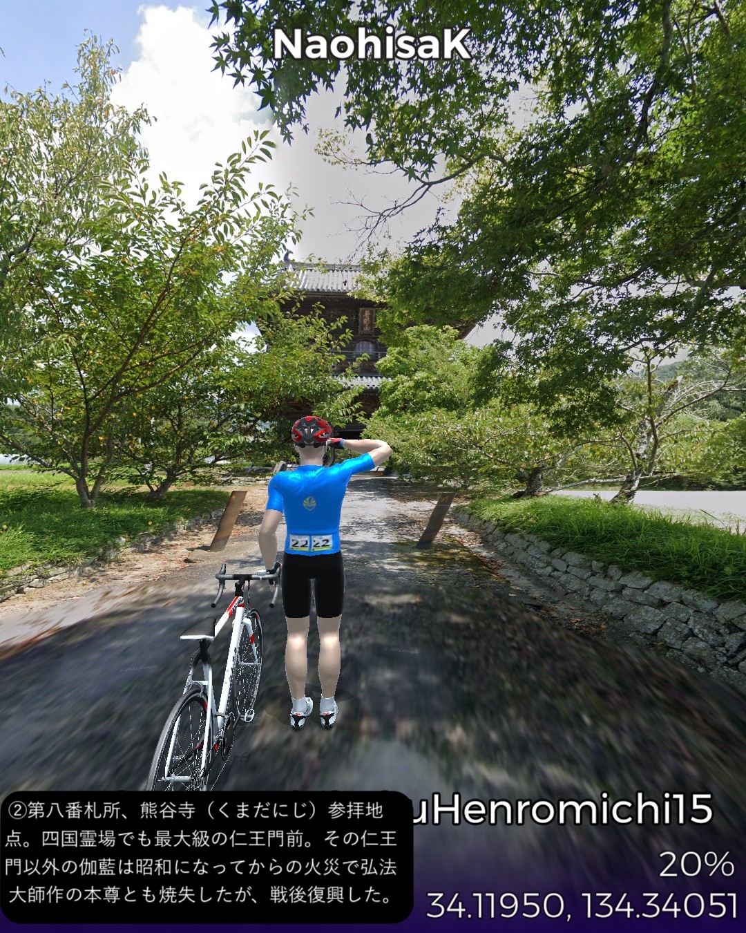 VRサイクリング、四国遍路道15日目。徳島県阿波市第十番札所、切幡寺を出発して、吉野川の北側の丘陵地帯を東へ進み、27kmの行程に9寺の霊場を巡り、第一番札所、霊山寺に至るルート。何とも参拝参拝で忙しい回となった。これで四国に入って第四十三番札所明石寺を皮切りに途中から逆順という不適当な巡礼を進めてきたが、前半は霊場から霊場が離れていてなかなか進まなかったが、徳島県に入ってからはあっという間に進んだ。それにしても一般のお遍路さんは今日のルートを逆に進んで長旅の始まりとなるわけだが、第十一番札所まではほぼ平地の遍路道でどんどん霊場を進めて行けるが、その後が大変なんですよ、とついそこら辺を歩いているお遍路さんに言いたくなる。まあそんなことは百も承知で準備しているのでしょうが。とは言え、私もようやく巡礼の半分が終わったところで、次は結構近くにある通常の巡礼の最終地、第八十八番札所へワープしてそこからまた逆順の巡礼を続ける予定である。