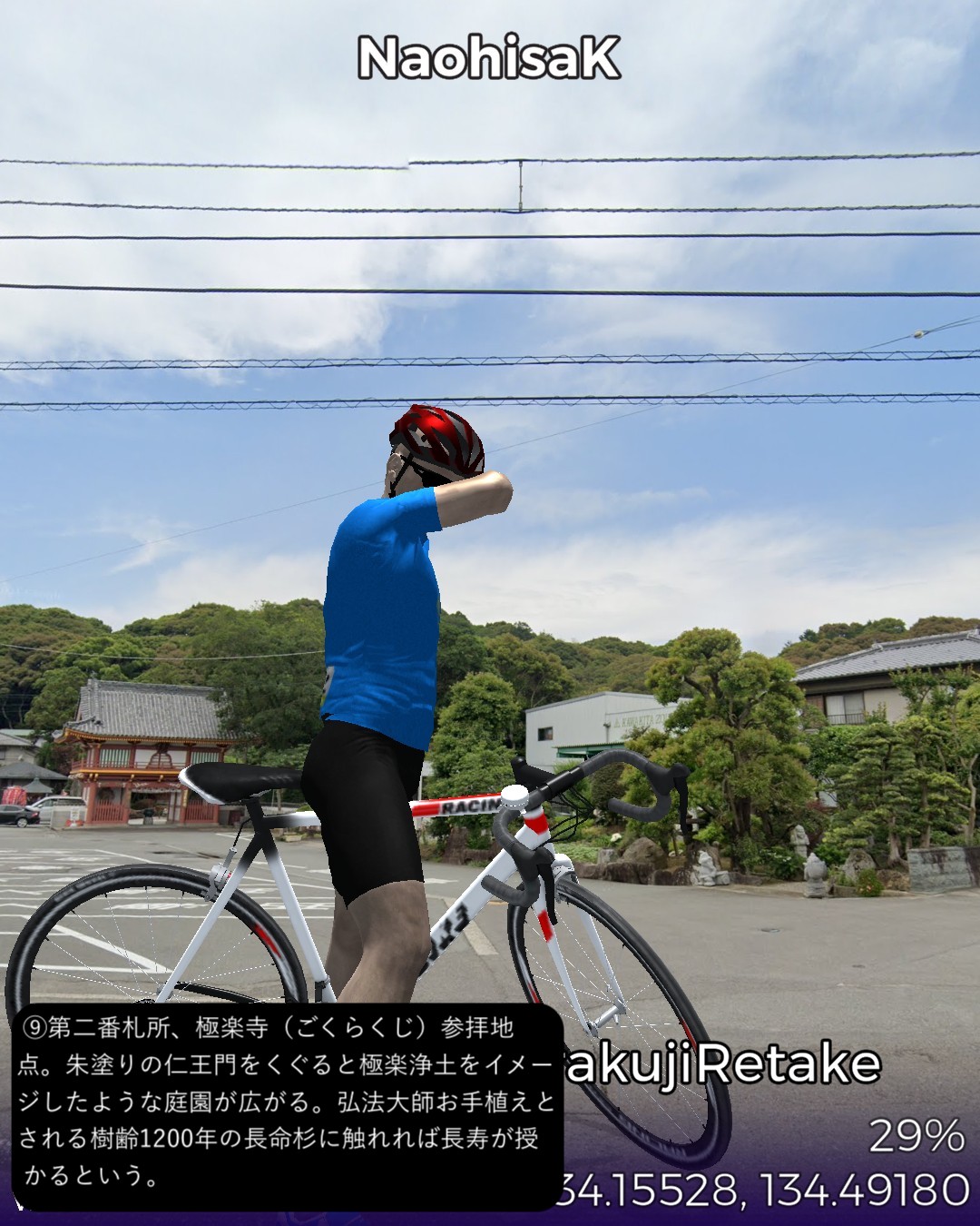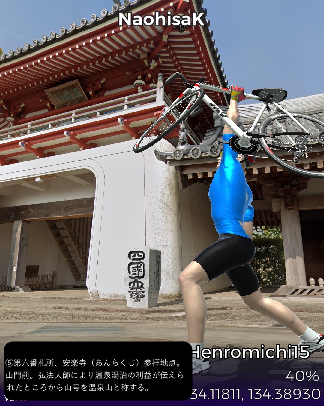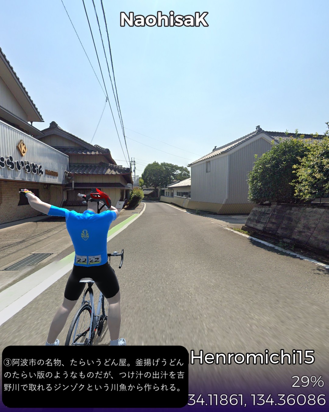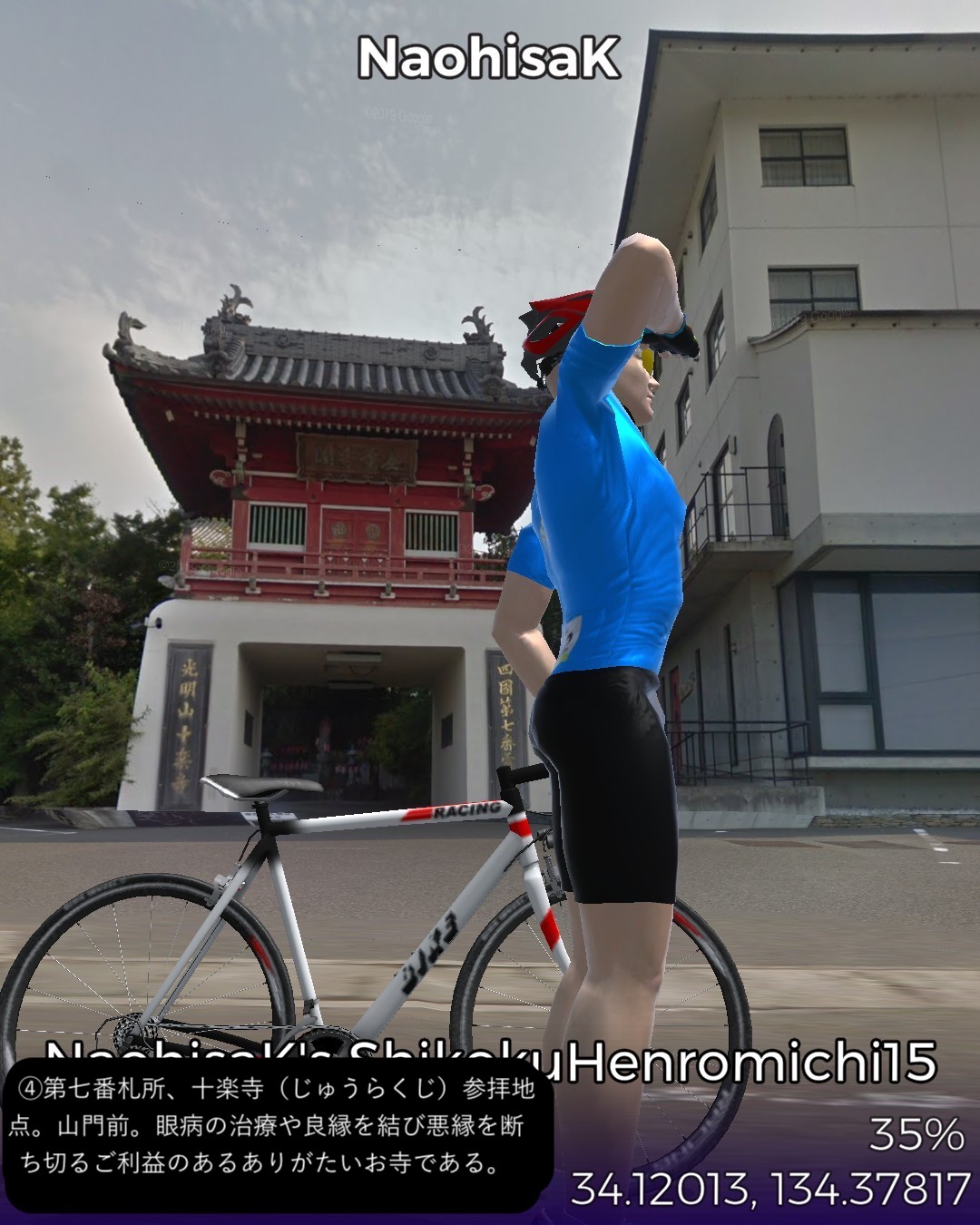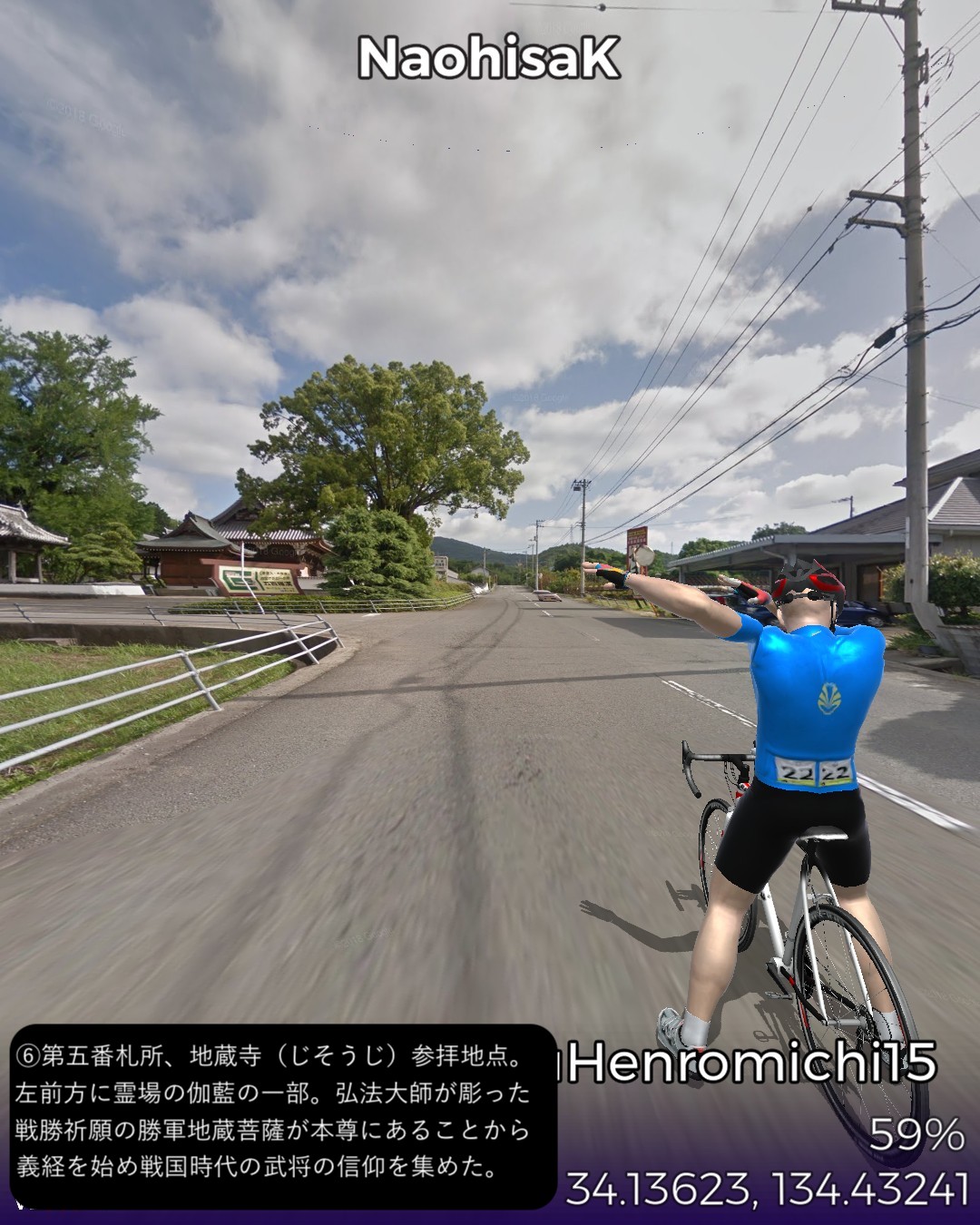 VRサイクリング、四国遍路道15日目。徳島県阿波市第十番札所、切幡寺を出発して、吉野川の北側の丘陵地帯を東へ進み、27kmの行程に9寺の霊場を巡り、第一番札所、霊山寺に至るルート。何とも参拝参拝で忙しい回となった。これで四国に入って第四十三番札所明石寺を皮切りに途中から逆順という不適当な巡礼を進めてきたが、前半は霊場から霊場が離れていてなかなか進まなかったが、徳島県に入ってからはあっという間に進んだ。それにしても一般のお遍路さんは今日のルートを逆に進んで長旅の始まりとなるわけだが、第十一番札所まではほぼ平地の遍路道でどんどん霊場を進めて行けるが、その後が大変なんですよ、とついそこら辺を歩いているお遍路さんに言いたくなる。まあそんなことは百も承知で準備しているのでしょうが。とは言え、私もようやく巡礼の半分が終わったところで、次は結構近くにある通常の巡礼の最終地、第八十八番札所へワープしてそこからまた逆順の巡礼を続ける予定である。