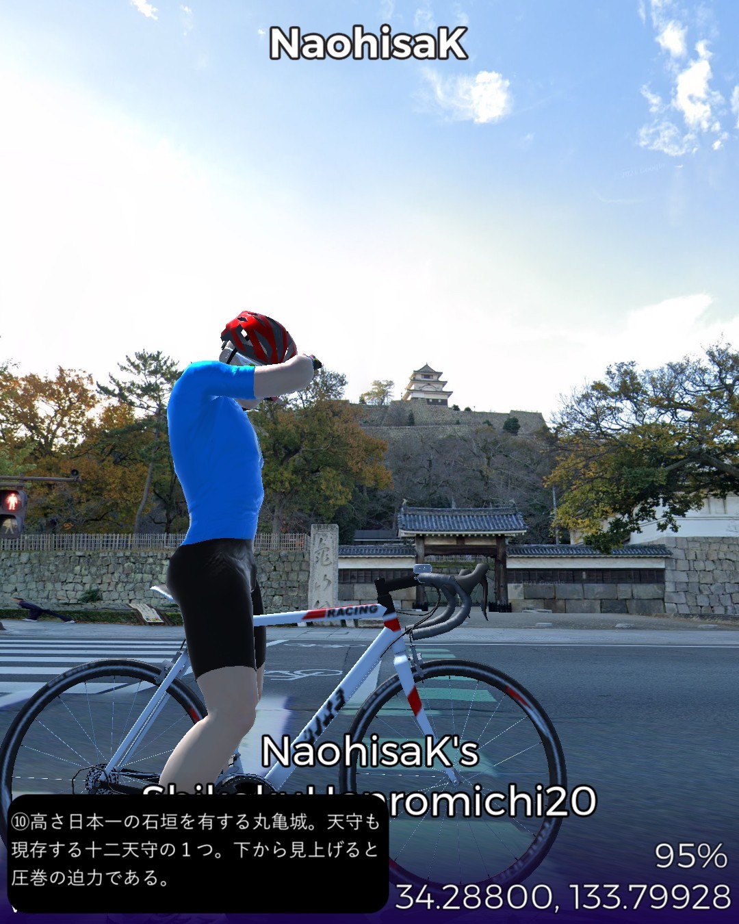 VRサイクリング、四国遍路道20日目。前回山の上の第八十一番札所白峯寺に登る途中の麓からスタートし、五色台の山のへりの田園地帯を進み、第八十番札所、国分寺、そこから引き返す方向でJR予讃線に沿って進み、第七十九番札所、天皇寺から坂出のレトロな市街地に入り、さらに家並が途切れないまま隣町の宇多津の古い街並みに入って第七十八番札所、郷照寺、さらに隣町、より近代的な丸亀市街、そびえたつ石垣の上の堂々たる丸亀城を眺めつつ、ゴールとした丸亀港へ至る、26kmの行程。坂出から丸亀の市街地に入る前の田園地帯に点在する、山下うどん、がもううどん等うどん県を代表する有名製麺所を通り過ぎたが、ロケーションがいいねえ。こういう長閑な田舎の製麺所の屋外で食べる評判の一杯は美味しいんだろうな。坂出、宇多津のレトロな街並みも雰囲気があって良い。次回は遍路道を進むのを休止して、これも古くからの巡礼の道である金毘羅街道を利用して金毘羅宮へ行ってみることにする。