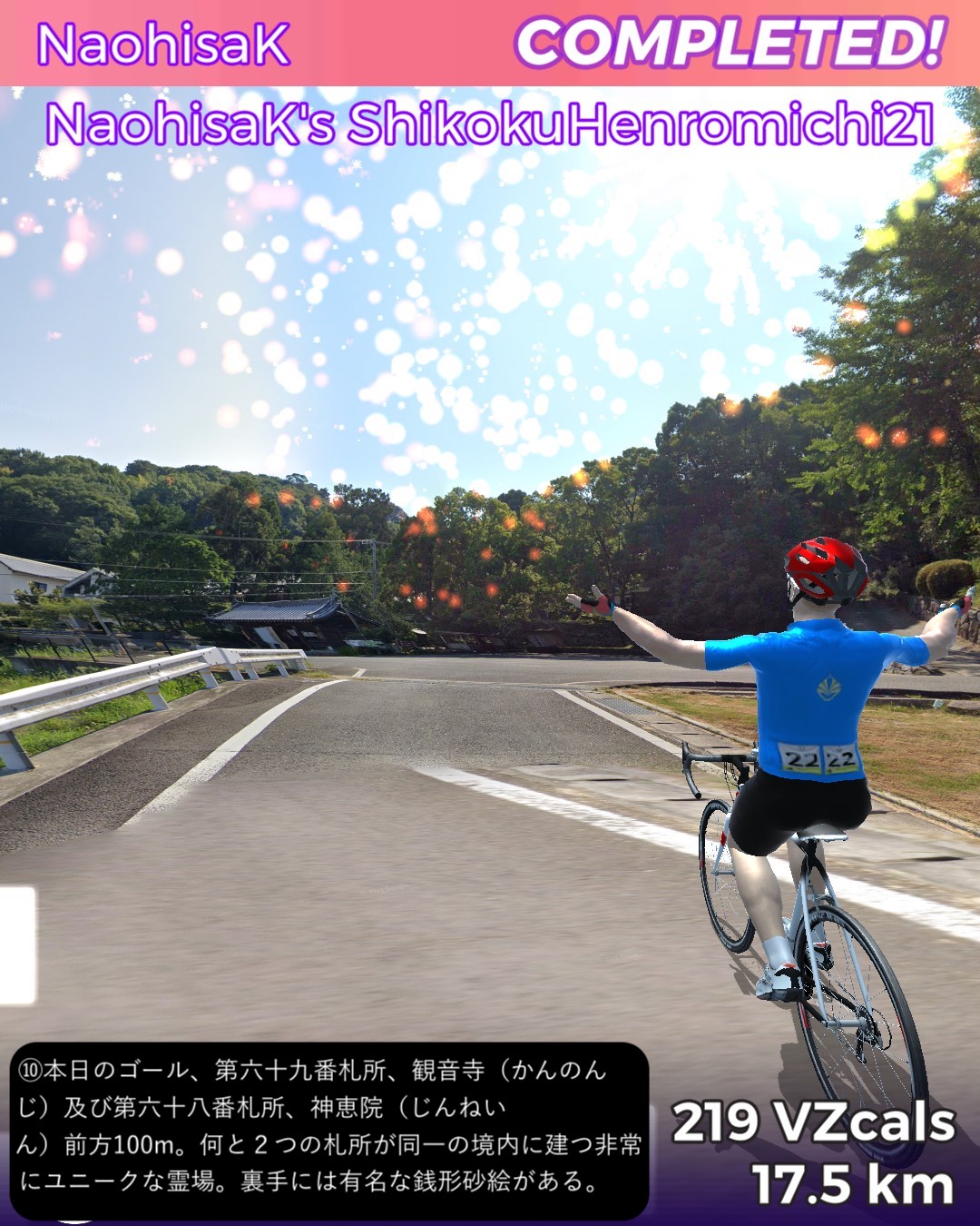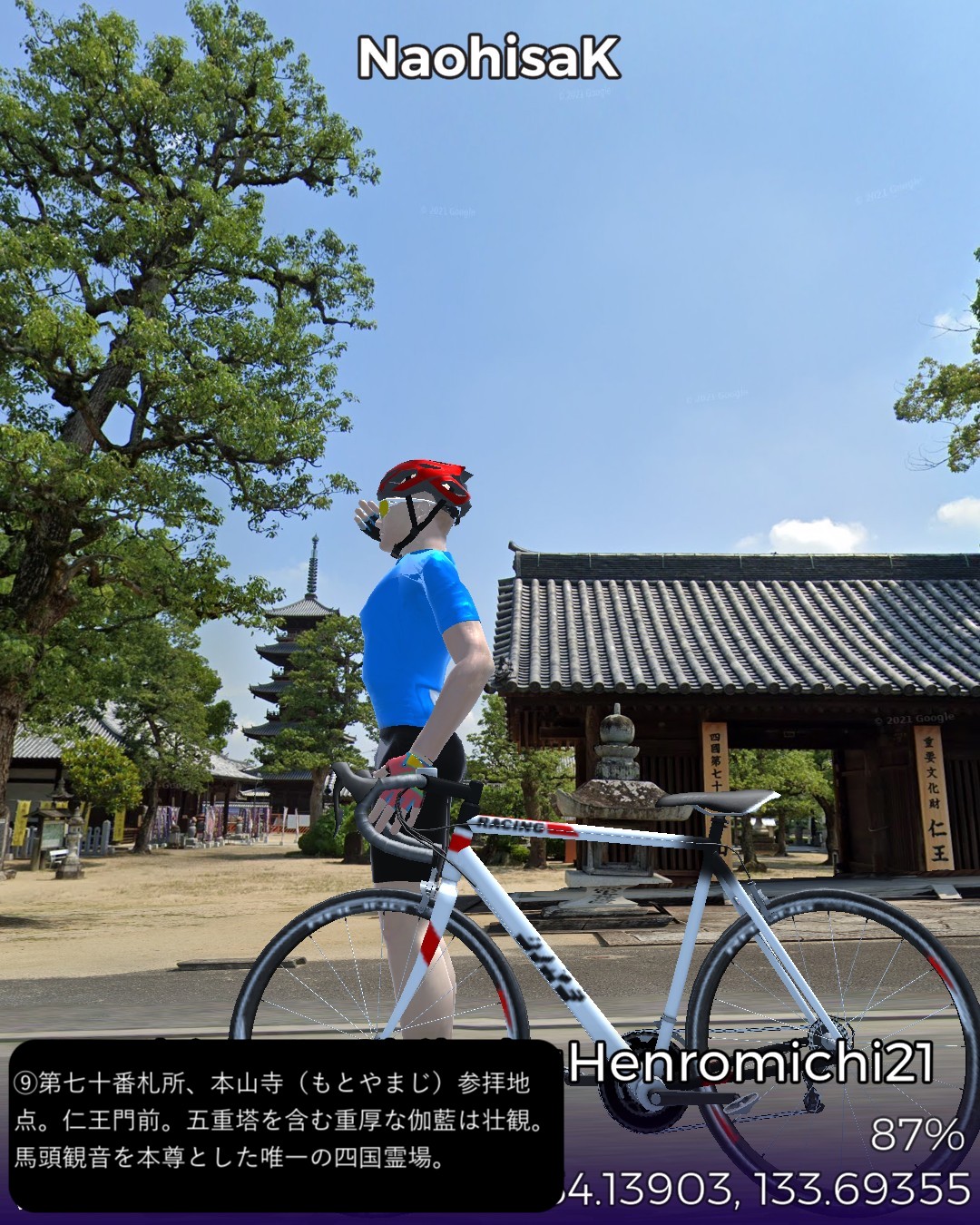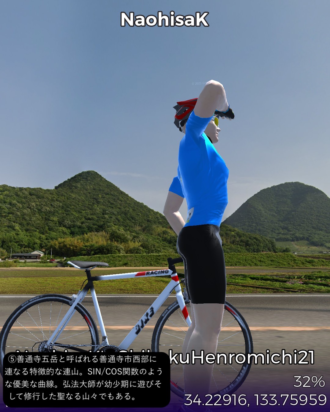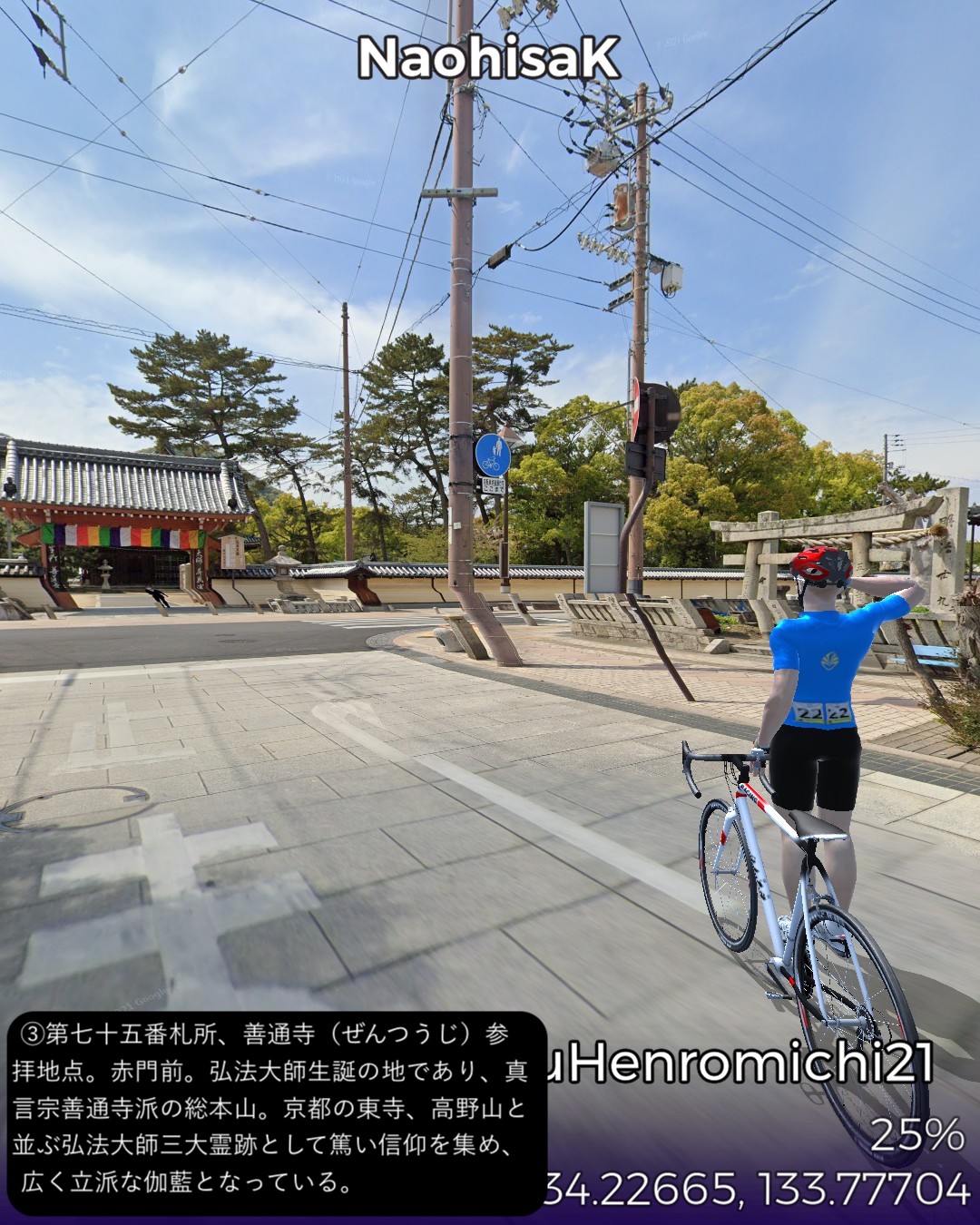 VRサイクリング、四国遍路道21日目。今回は今までの最多の霊場巡り三昧の日。金毘羅街道終点の多度津を出て、第七十七番札所、道隆寺を皮切りに、善通寺市、三豊市、観音寺市と南西方向に移動しつつ、最後はゴールの第六十八番札所、神恵院まで、10霊場を一気に巡礼する36kmの行程。第七十五番札所、市の名前になっている善通寺が弘法大師の生誕の地なので、どうやらマイホームタウンに霊場となる寺を多く建ててしまったと見た。その弘法大師のホームタウンである善通寺市付近からどこでも眺められる、善通寺五岳と呼ばれるSin/Cos関数のような優美な波形を描く山なみの連山が非常に印象的だ。幼少期の弘法大師、空海もこの不思議な稜線の山なみを眺めて成長したのかと想像すると感慨深い。本日のルートで霊場の数が稼げたのはアクセスの便利な平野部に展開していたことにもよると思われるが、次回はまた山岳方面に分け入ってゆく。お遍路はこの平野部の楽勝なコースと山岳部の難関コースを交互に繰り返しながら進んでゆく。山あり谷ありの人生そのものですな。