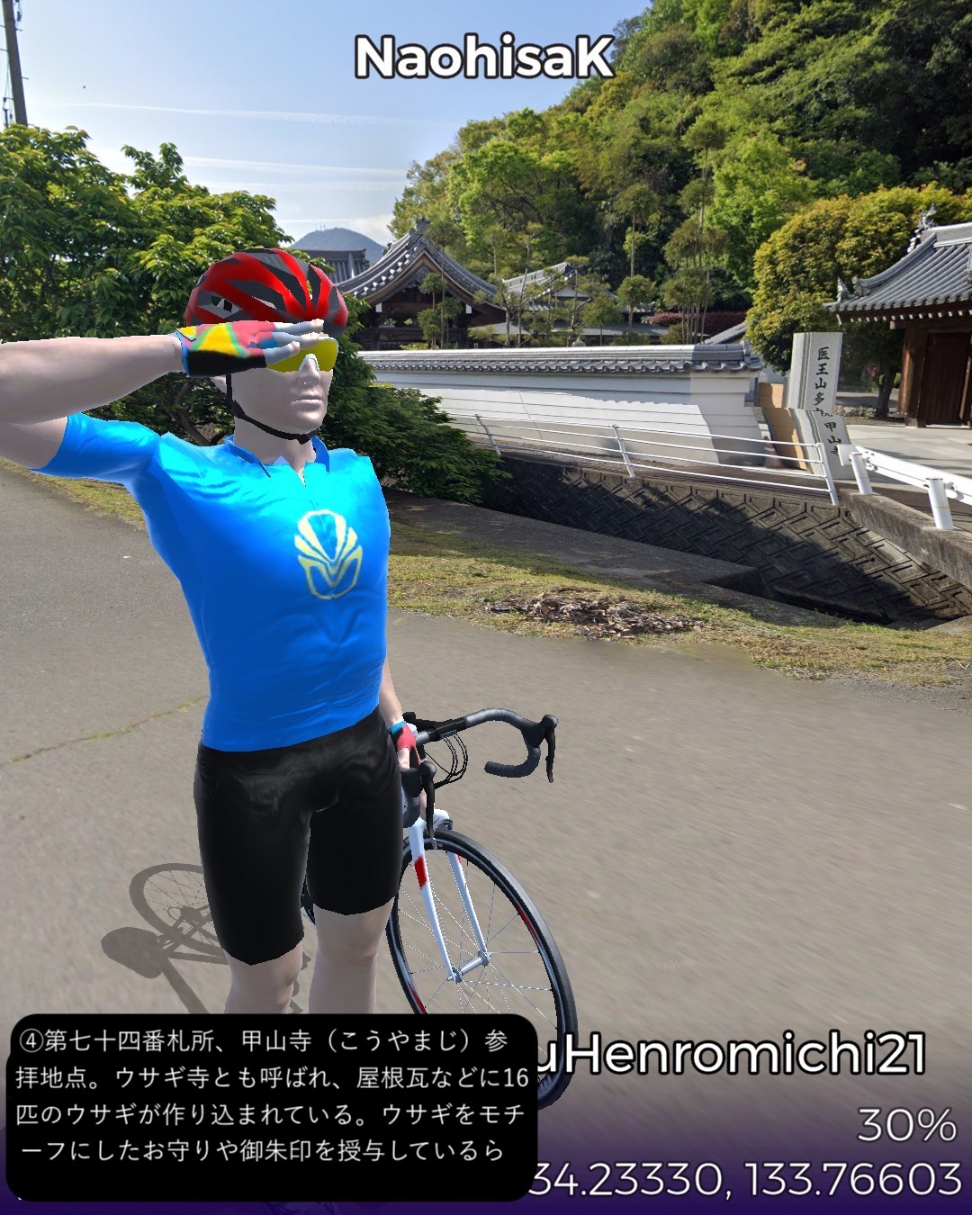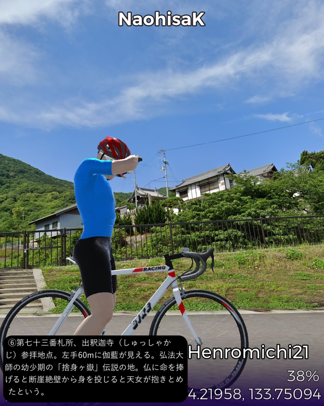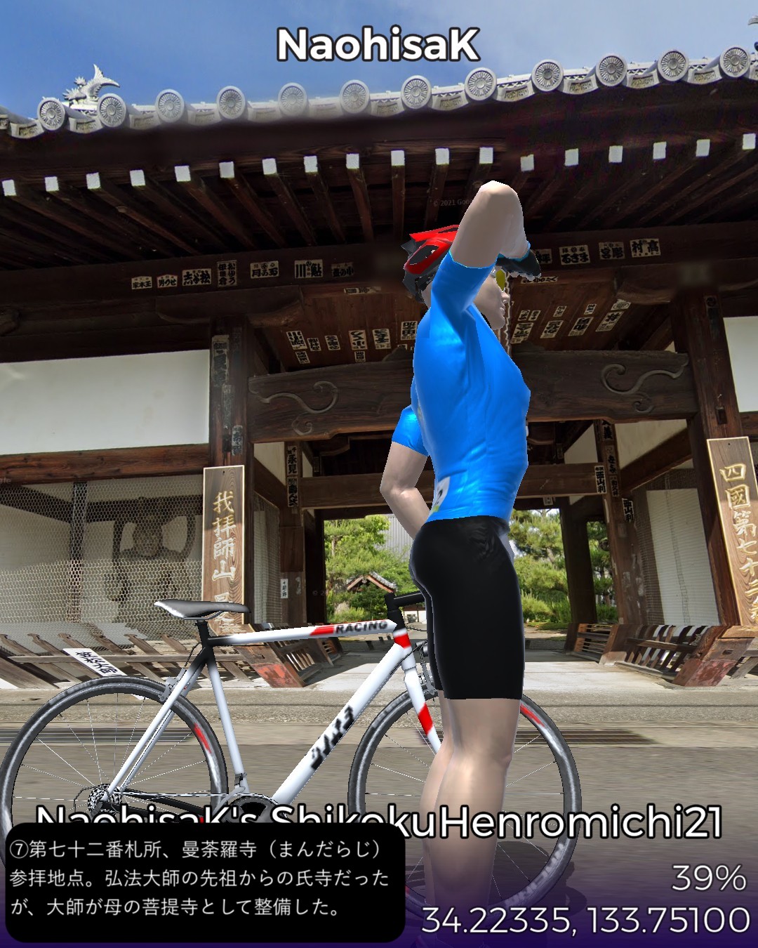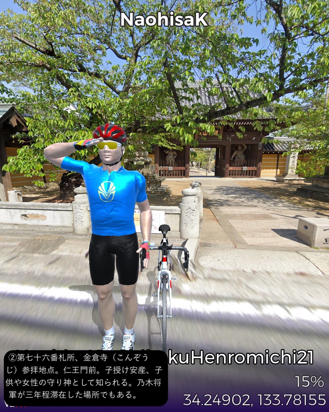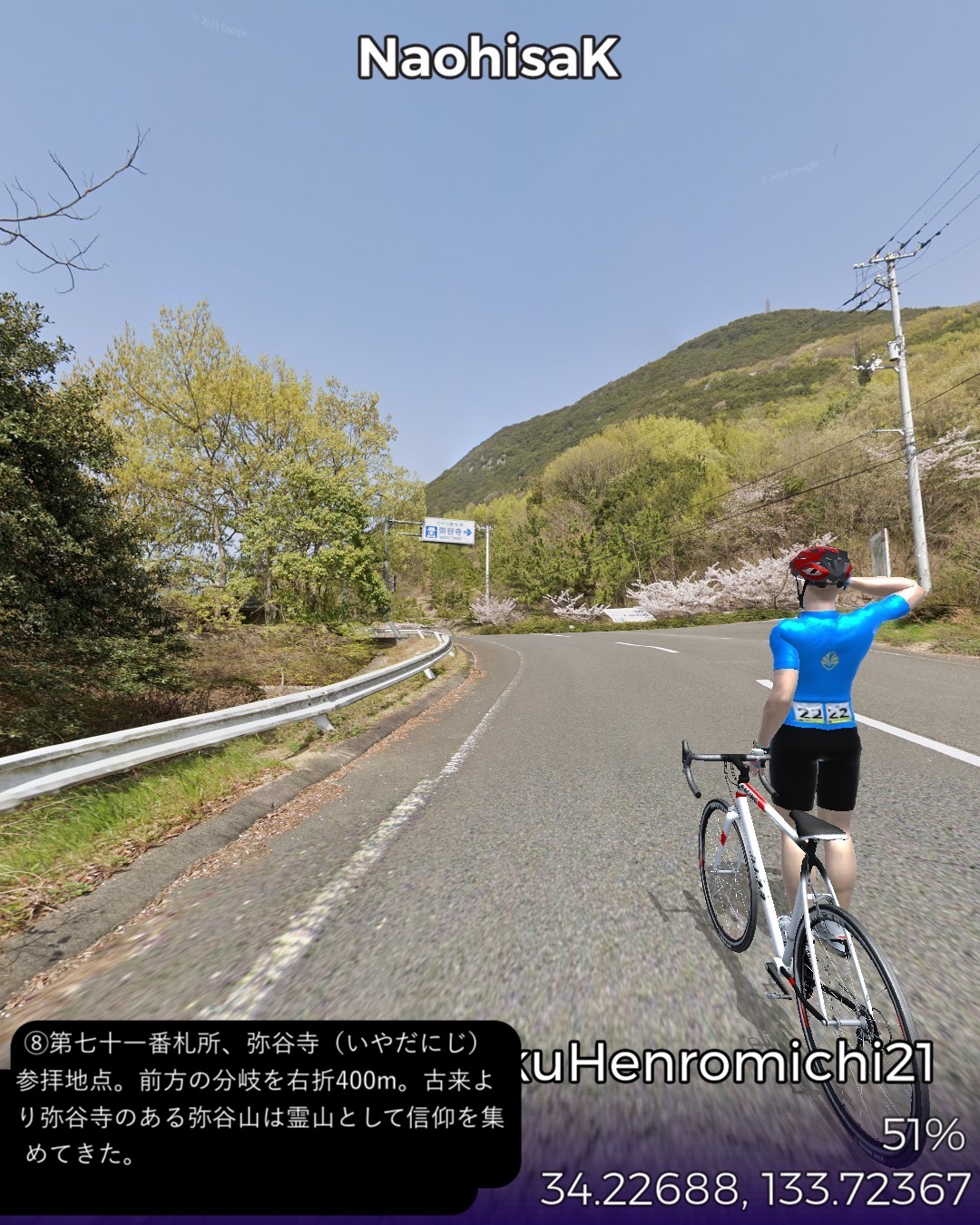 VRサイクリング、四国遍路道21日目。今回は今までの最多の霊場巡り三昧の日。金毘羅街道終点の多度津を出て、第七十七番札所、道隆寺を皮切りに、善通寺市、三豊市、観音寺市と南西方向に移動しつつ、最後はゴールの第六十八番札所、神恵院まで、10霊場を一気に巡礼する36kmの行程。第七十五番札所、市の名前になっている善通寺が弘法大師の生誕の地なので、どうやらマイホームタウンに霊場となる寺を多く建ててしまったと見た。その弘法大師のホームタウンである善通寺市付近からどこでも眺められる、善通寺五岳と呼ばれるSin/Cos関数のような優美な波形を描く山なみの連山が非常に印象的だ。幼少期の弘法大師、空海もこの不思議な稜線の山なみを眺めて成長したのかと想像すると感慨深い。本日のルートで霊場の数が稼げたのはアクセスの便利な平野部に展開していたことにもよると思われるが、次回はまた山岳方面に分け入ってゆく。お遍路はこの平野部の楽勝なコースと山岳部の難関コースを交互に繰り返しながら進んでゆく。山あり谷ありの人生そのものですな。