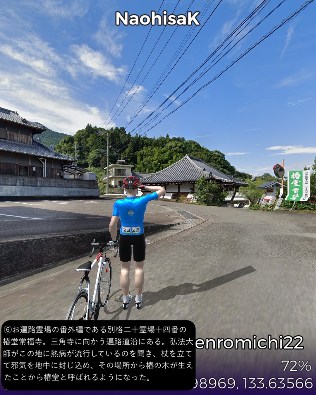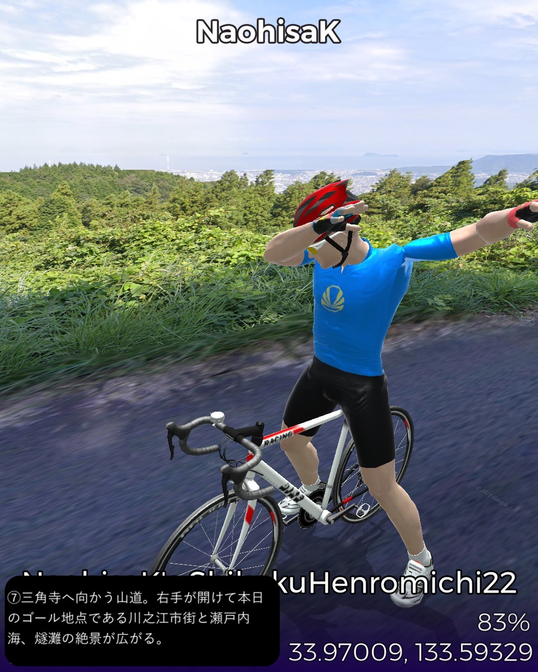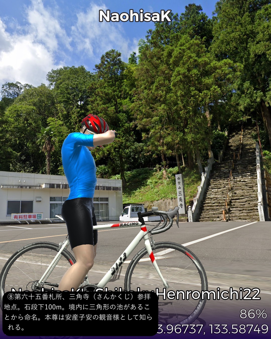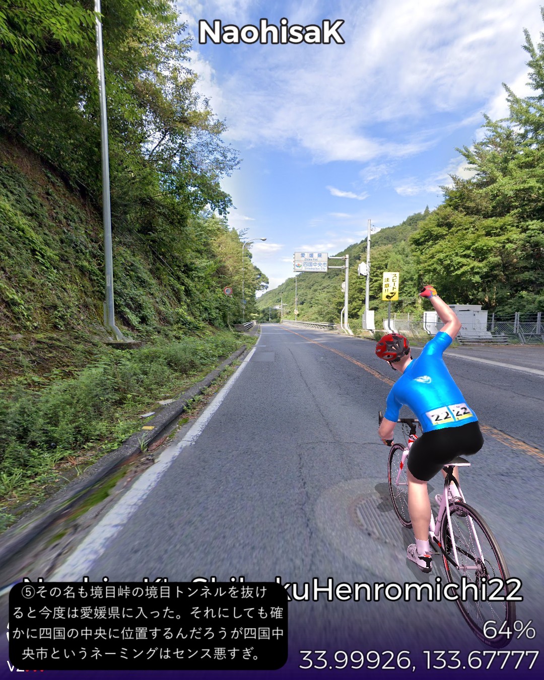VRサイクリング、四国遍路道22日目。観音寺市第六十八番札所神恵院をスタートし、その裏山の銭形展望台に登ったが有名な銭形砂絵はストリートビューでは観れずそのまま下りて遍路道を進み田園地帯を抜けて険しい山地へ分け入るルート。途中で第六十七番札所大興寺と第六十六番札所雲辺寺、及び第六十五番札所三角寺を参拝しつつ、最後にまた海側へ下り四国中央市の中心川之江の市街をゴールとする53kmの行程。途中の霊場、大興寺は寺の裏手で伽藍も見えず、雲辺寺は遥か山の上の寺の所在地からロープウェイで下った山麓駅のそばという地点となって距離の自乗で効きそうなご利益はかなり薄いであろう。その雲辺寺の麓からは険しい山地を横切って徳島県に入り、さらにもう1つ峠を超えて愛媛県に入る。この辺は香川、徳島、愛媛の3県の境界が錯綜する地域なのだ。ついでに高知県の県境もそれほど遠くない場所にある。よって四国中央という手抜きの都市名は地理的には納得できる。本日3つ目の霊場三角寺も山の中であるがここは寺の正面に出ることができた。本日のゴール地点日本一の紙の町川之江は遍路道から外れるが、次回走る土佐北街道の出発点となる。しばらく巡礼の旅を中断して、再度土佐の地へ向かう予定。