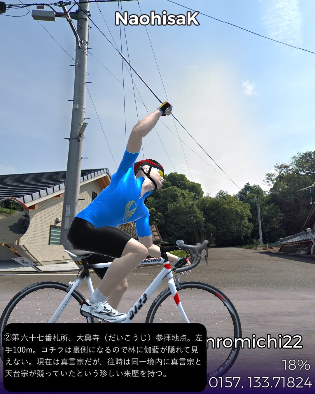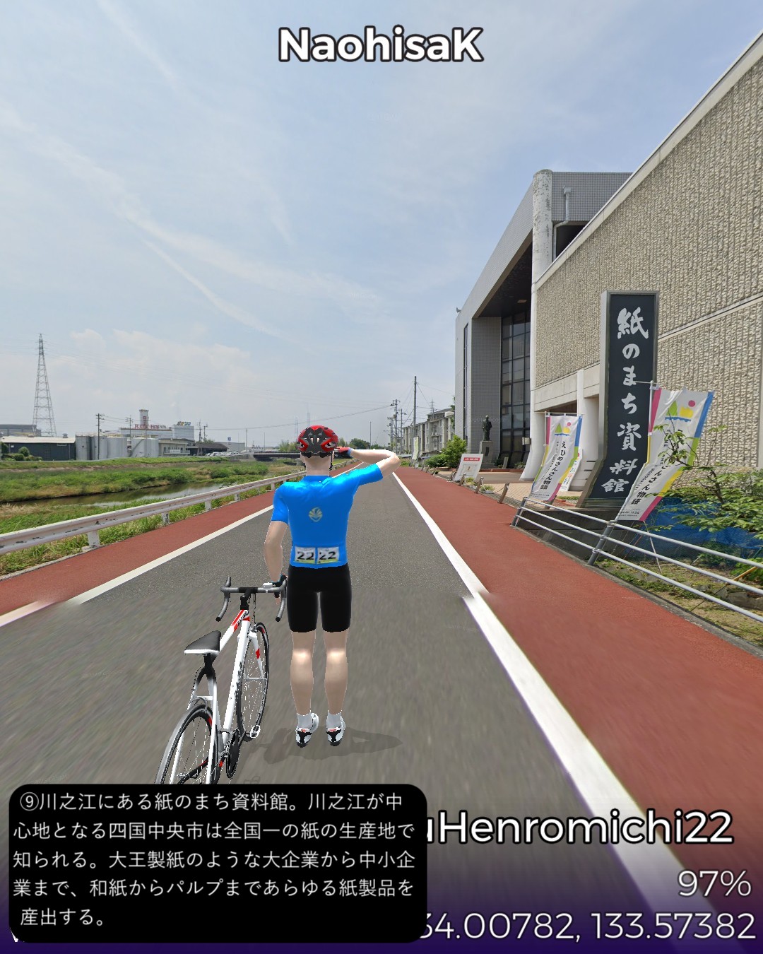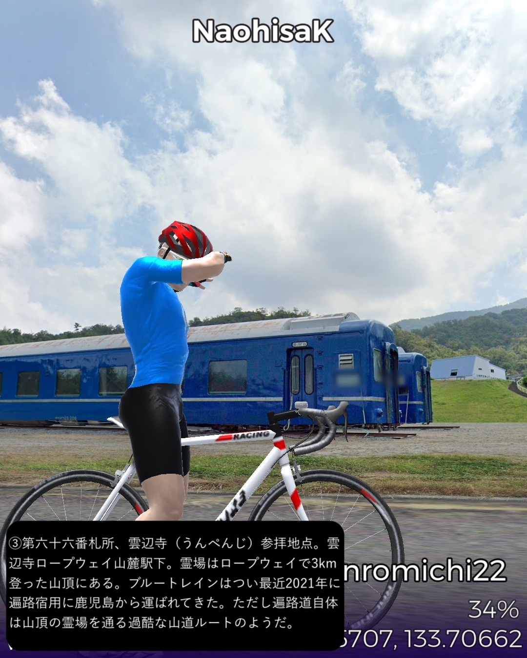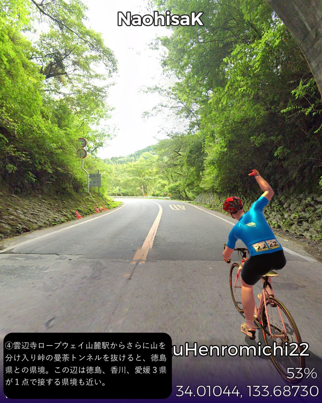 VRサイクリング、四国遍路道22日目。観音寺市第六十八番札所神恵院をスタートし、その裏山の銭形展望台に登ったが有名な銭形砂絵はストリートビューでは観れずそのまま下りて遍路道を進み田園地帯を抜けて険しい山地へ分け入るルート。途中で第六十七番札所大興寺と第六十六番札所雲辺寺、及び第六十五番札所三角寺を参拝しつつ、最後にまた海側へ下り四国中央市の中心川之江の市街をゴールとする53kmの行程。途中の霊場、大興寺は寺の裏手で伽藍も見えず、雲辺寺は遥か山の上の寺の所在地からロープウェイで下った山麓駅のそばという地点となって距離の自乗で効きそうなご利益はかなり薄いであろう。その雲辺寺の麓からは険しい山地を横切って徳島県に入り、さらにもう1つ峠を超えて愛媛県に入る。この辺は香川、徳島、愛媛の3県の境界が錯綜する地域なのだ。ついでに高知県の県境もそれほど遠くない場所にある。よって四国中央という手抜きの都市名は地理的には納得できる。本日3つ目の霊場三角寺も山の中であるがここは寺の正面に出ることができた。本日のゴール地点日本一の紙の町川之江は遍路道から外れるが、次回走る土佐北街道の出発点となる。しばらく巡礼の旅を中断して、再度土佐の地へ向かう予定。