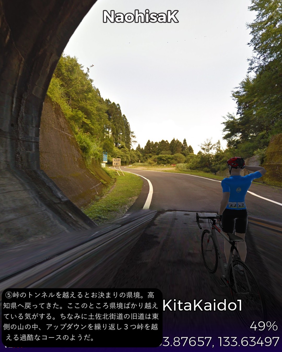 VRサイクリング、土佐北街道1日目。ルート構成の都合上、しばらく四国遍路道から外れて、本来のテーマの旧街道ルートに立ち戻ってみる。まずは土佐藩が参勤交代で利用した土佐北街道で高知を目指す。今回は瀬戸内海に面した港町、川之江をスタートし、前回の雲辺寺から三角寺へ向かう遍路道と交差しつつ、南にドーンと広がる四国山地の山塊へと果敢に分け入り、峠を越えて高知県に入り、吉野川上流の町、本山まで進む61kmの行程。いやあ四国はつくづく山地が多い島だ。お遍路の霊場も、遍路道も山の中にあることが多いが、四国山地を横断するとそれ以上に山地の厚みが凄いと実感する。今回ずっと山の中を走ってもまだ高知までの道半ばでまだ山の道が次回に続く。