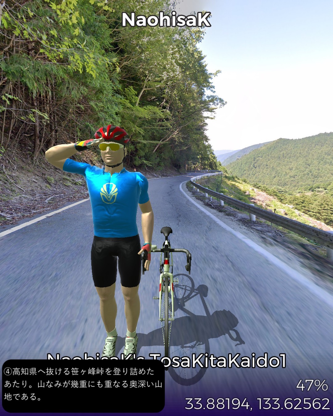 VRサイクリング、土佐北街道1日目。ルート構成の都合上、しばらく四国遍路道から外れて、本来のテーマの旧街道ルートに立ち戻ってみる。まずは土佐藩が参勤交代で利用した土佐北街道で高知を目指す。今回は瀬戸内海に面した港町、川之江をスタートし、前回の雲辺寺から三角寺へ向かう遍路道と交差しつつ、南にドーンと広がる四国山地の山塊へと果敢に分け入り、峠を越えて高知県に入り、吉野川上流の町、本山まで進む61kmの行程。いやあ四国はつくづく山地が多い島だ。お遍路の霊場も、遍路道も山の中にあることが多いが、四国山地を横断するとそれ以上に山地の厚みが凄いと実感する。今回ずっと山の中を走ってもまだ高知までの道半ばでまだ山の道が次回に続く。