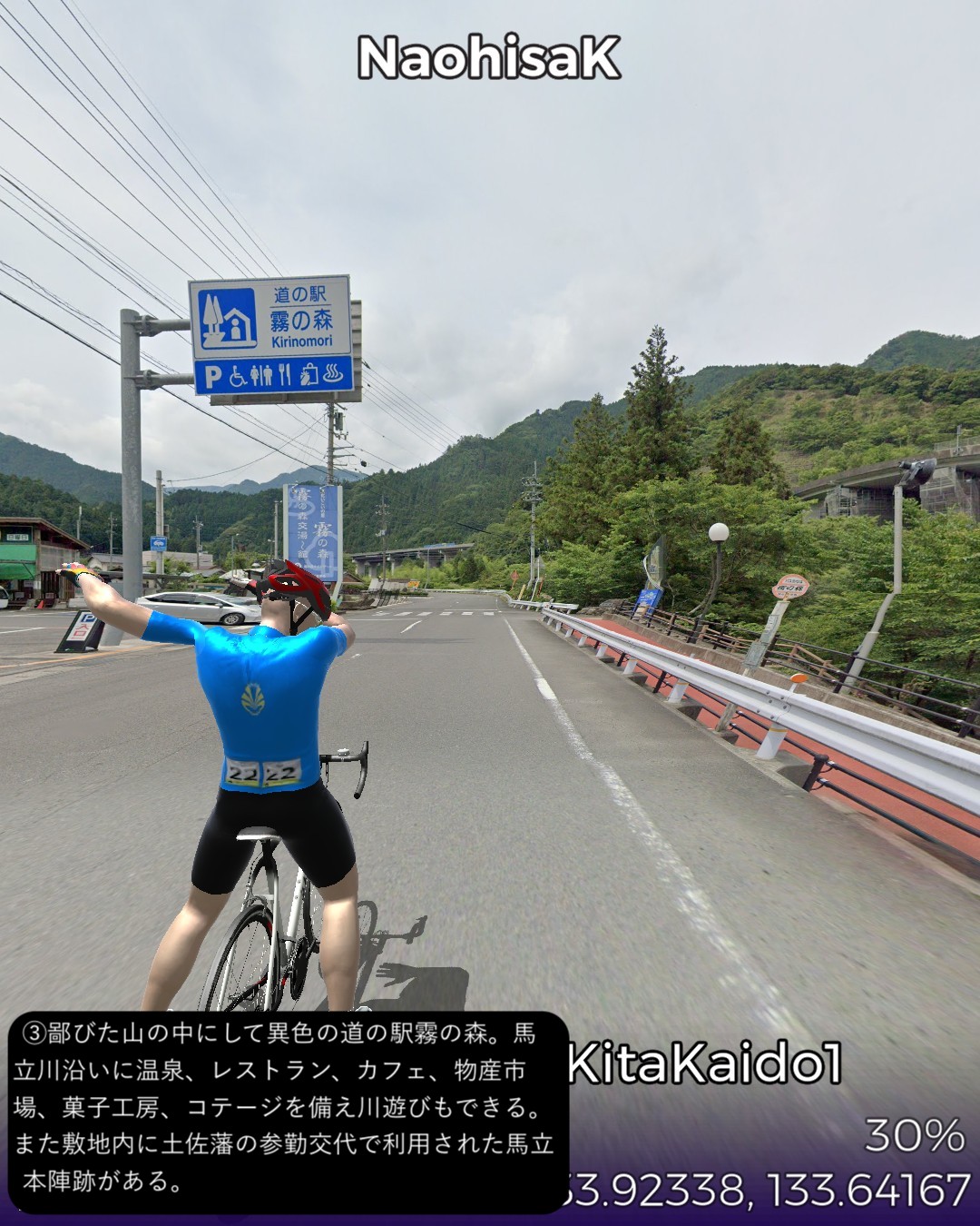 VRサイクリング、土佐北街道2日目。吉野川上流の盆地の町、本山をス…