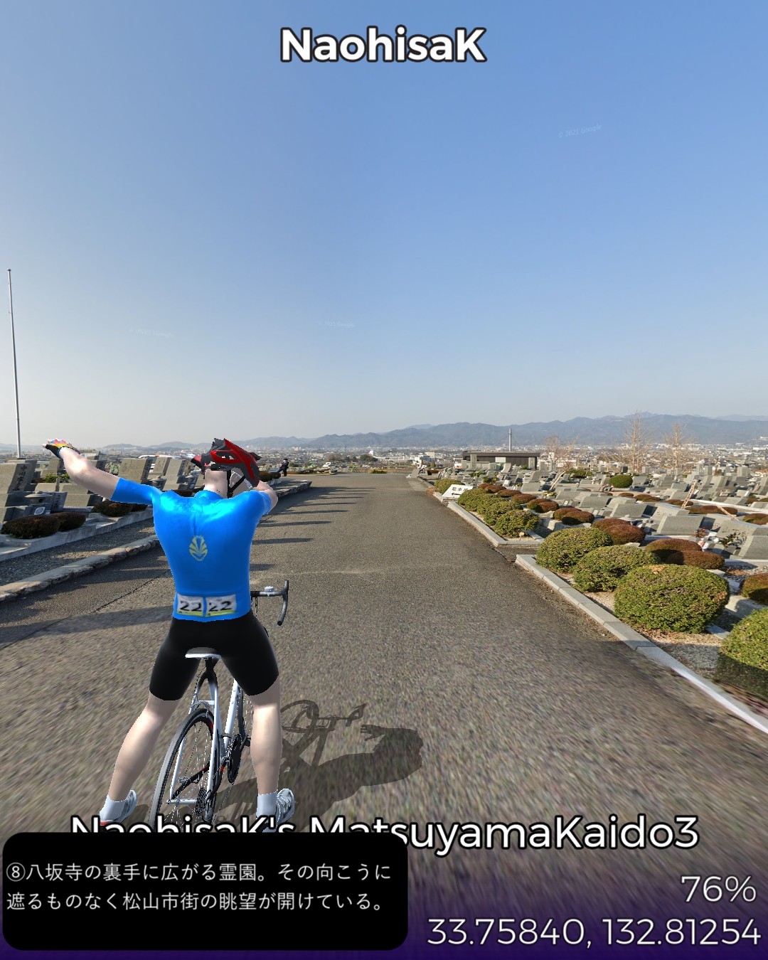 VRサイクリング、松山街道3日目。今日のルートは四国遍路道編も兼ねていて久万高原をスタートして、第四十五番札所岩屋寺、第四十四番札所大宝寺と街道からちょっと外れて霊場巡りをした後、松山街道沿いに三坂峠を越えて街道沿いの第四十六番札所浄瑠璃寺、第四十七番札所八坂寺を攻め、松山街道終点の四国第一の都市、松山市街に至る、55kmの長丁場。巡礼の旅もこれまでで残るは21霊場、全て愛媛県に存在するが、ここからは番号順でも逆順でもなくルート都合でやっつけてゆく。今回も45→44→46→47と順不同となった。思い返すと四十三番以前は8/23からの四国遍路編開始と共に逆順で踏破して行ったのだった。その最初に訪れた霊場四十三番と今回の四十四番の間の遍路道はいくつもの峠を越えていわゆる「遍路ころがし」と呼ばれるお遍路屈指の難所だそうだ。さて今回のスタート地点の久万高原は山に囲まれてはいるが平たい土地がずっと広がっていて高原という気がしなかったが、高原の端の三坂峠に来て初めてどれだけ標高があったかわかった。峠からは遠くに松山市街を望むはるか下界のパノラマの風景が広がっていた。ゴールは松山市街のど真ん中、こんもりした山の上にそびえる松山城のふもと。